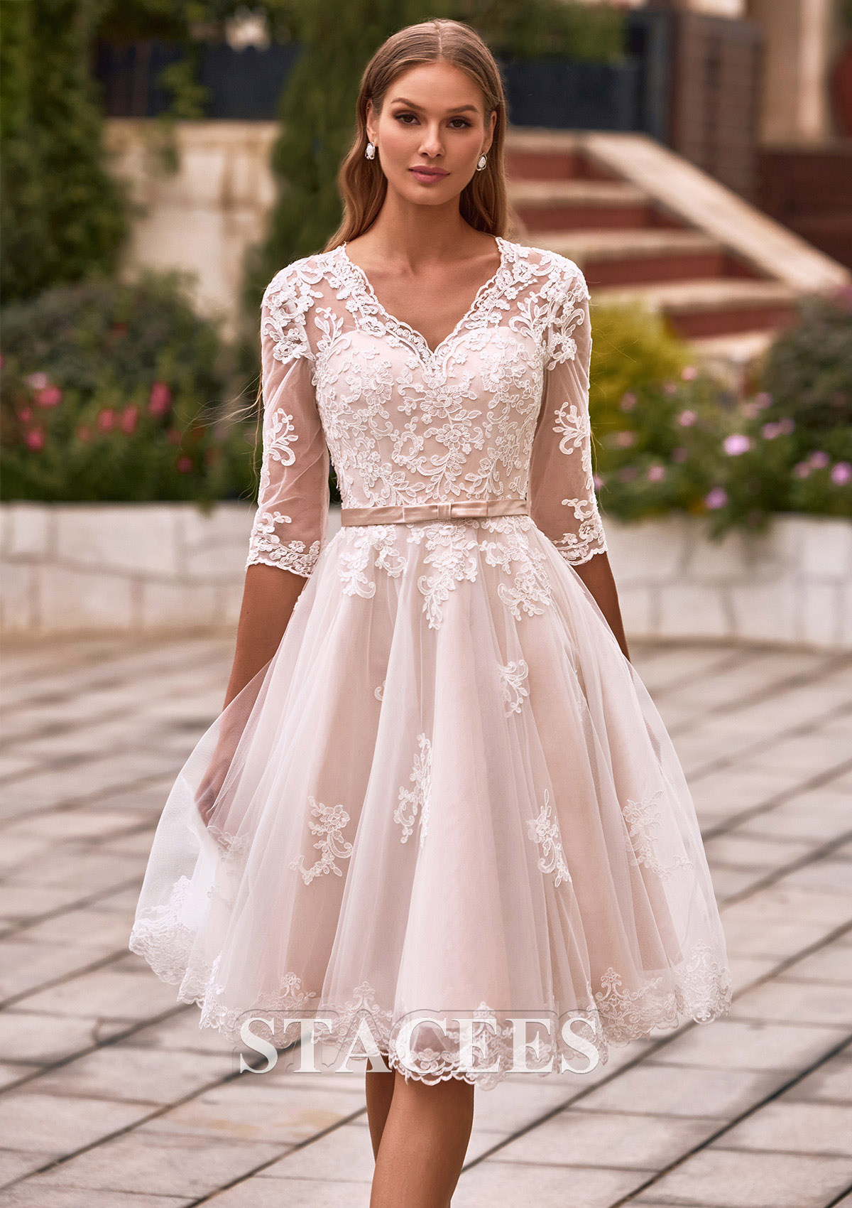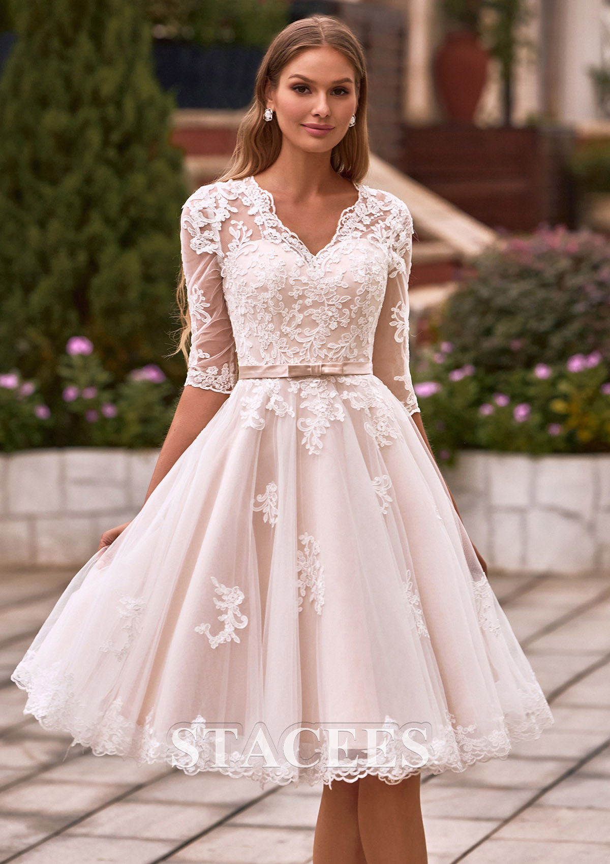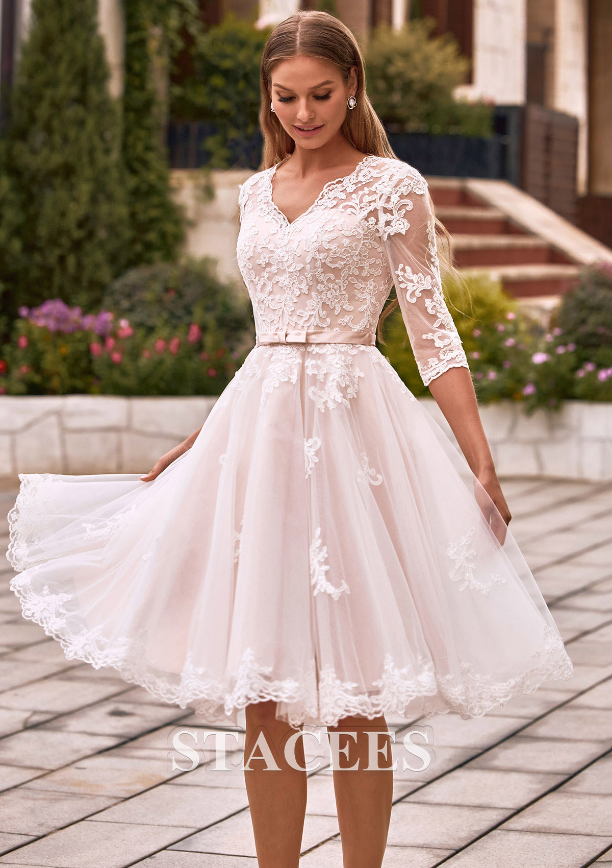 Elevate your bridal style with timeless elegance in this short A-line wedding dress, perfect for a garden ceremony, rehearsal dinner, or a chic reception change. The bodice features a flattering V-neckline and illusion half sleeves intricately adorned with delicate floral lace appliqués. The sheer lace extends across the back, forming a breathtaking illusion detail secured with elegant fabric-covered buttons. A dainty belt with a subtle bow cinches the waist, transitioning into a voluminous skirt that falls just above the knee. The champagne-toned lining adds a warm, romantic glow, making the white lace embroidery pop with every movement. Exude timeless romance on your special day in this A-line gown, a flawless blend of classic elegance and modern sophistication.