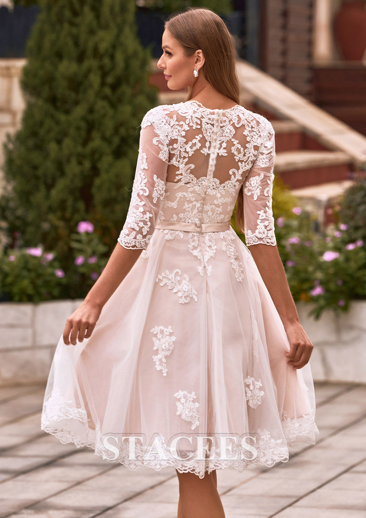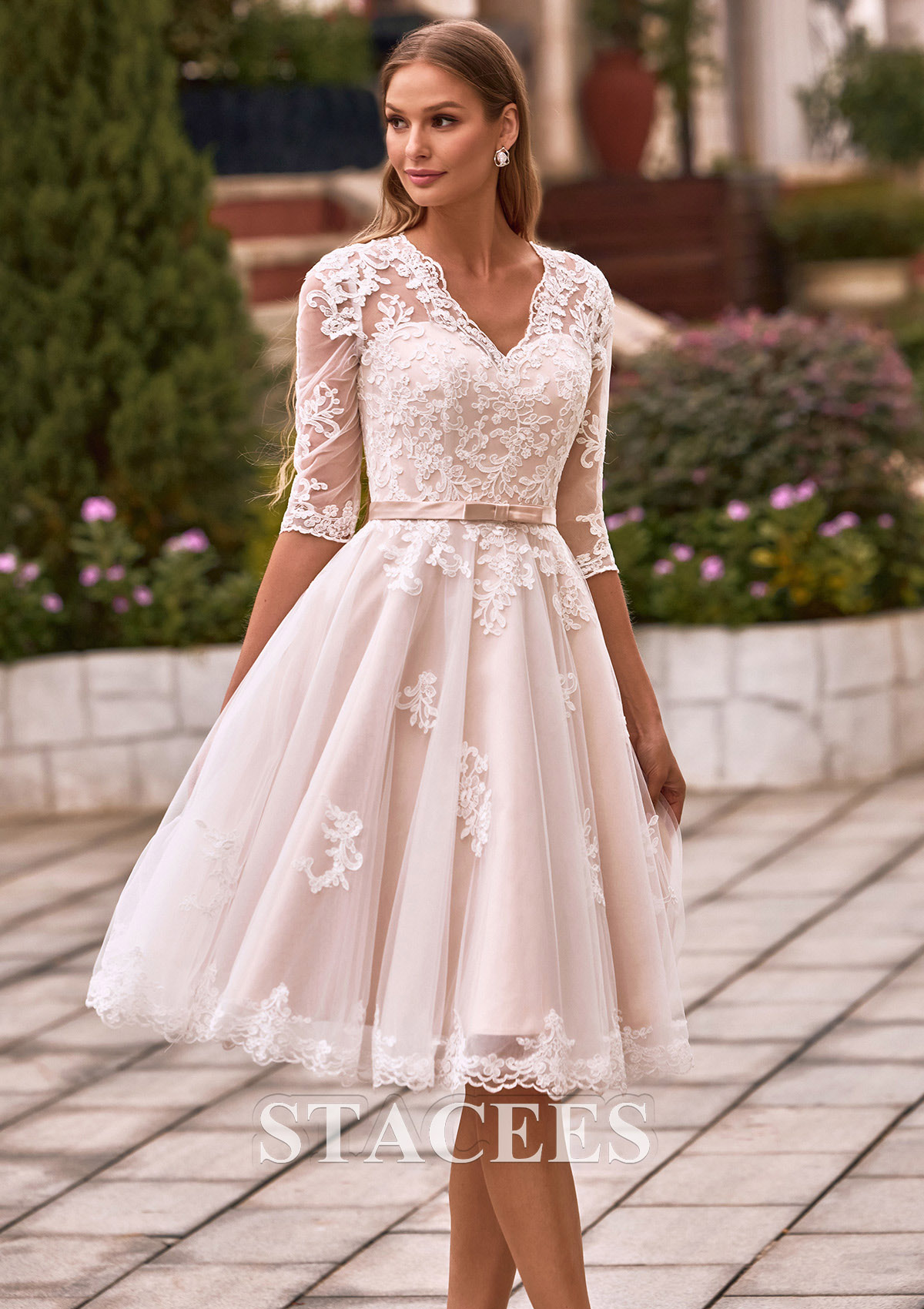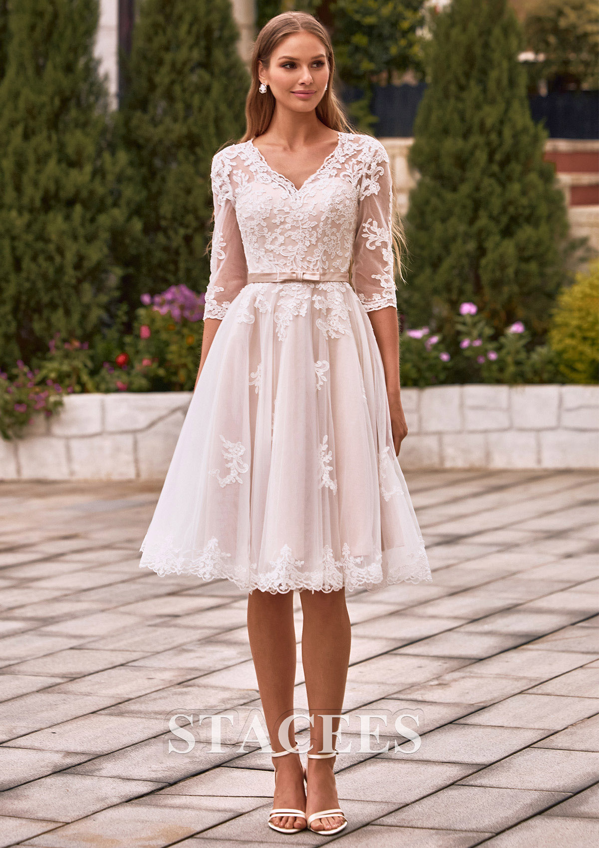 Elevate your bridal style with timeless elegance in this short A-line wedding dress, perfect for a garden ceremony, rehearsal dinner, or a chic reception change. The bodice features a flattering V-neckline and illusion half sleeves intricately adorned with delicate floral lace appliqués. The sheer lace extends across the back, forming a breathtaking illusion detail secured with elegant fabric-covered buttons. A dainty belt with a subtle bow cinches the waist, transitioning into a voluminous skirt that falls just above the knee. The champagne-toned lining adds a warm, romantic glow, making the white lace embroidery pop with every movement. Exude timeless romance on your special day in this A-line gown, a flawless blend of classic elegance and modern sophistication.