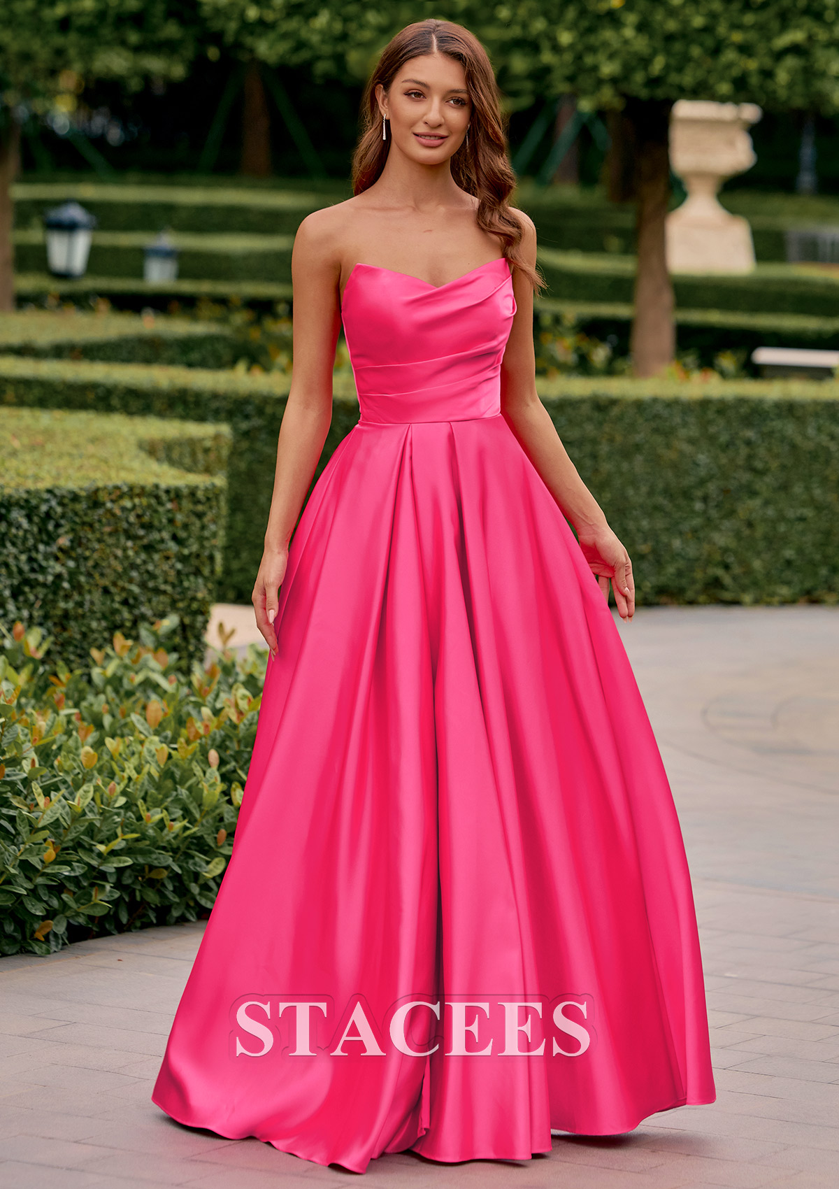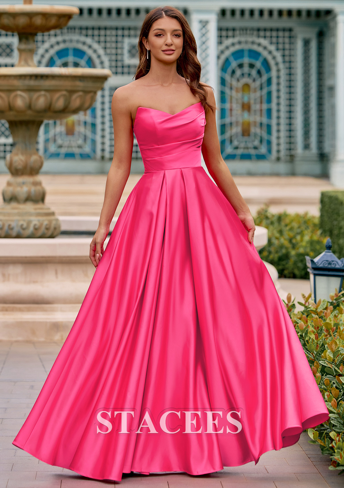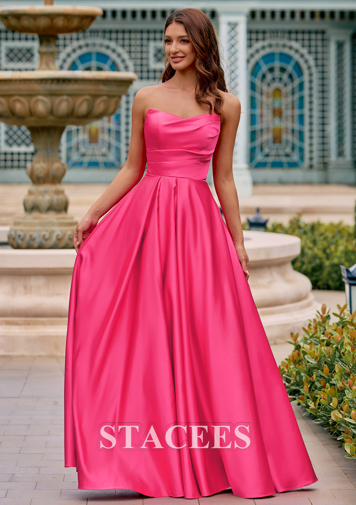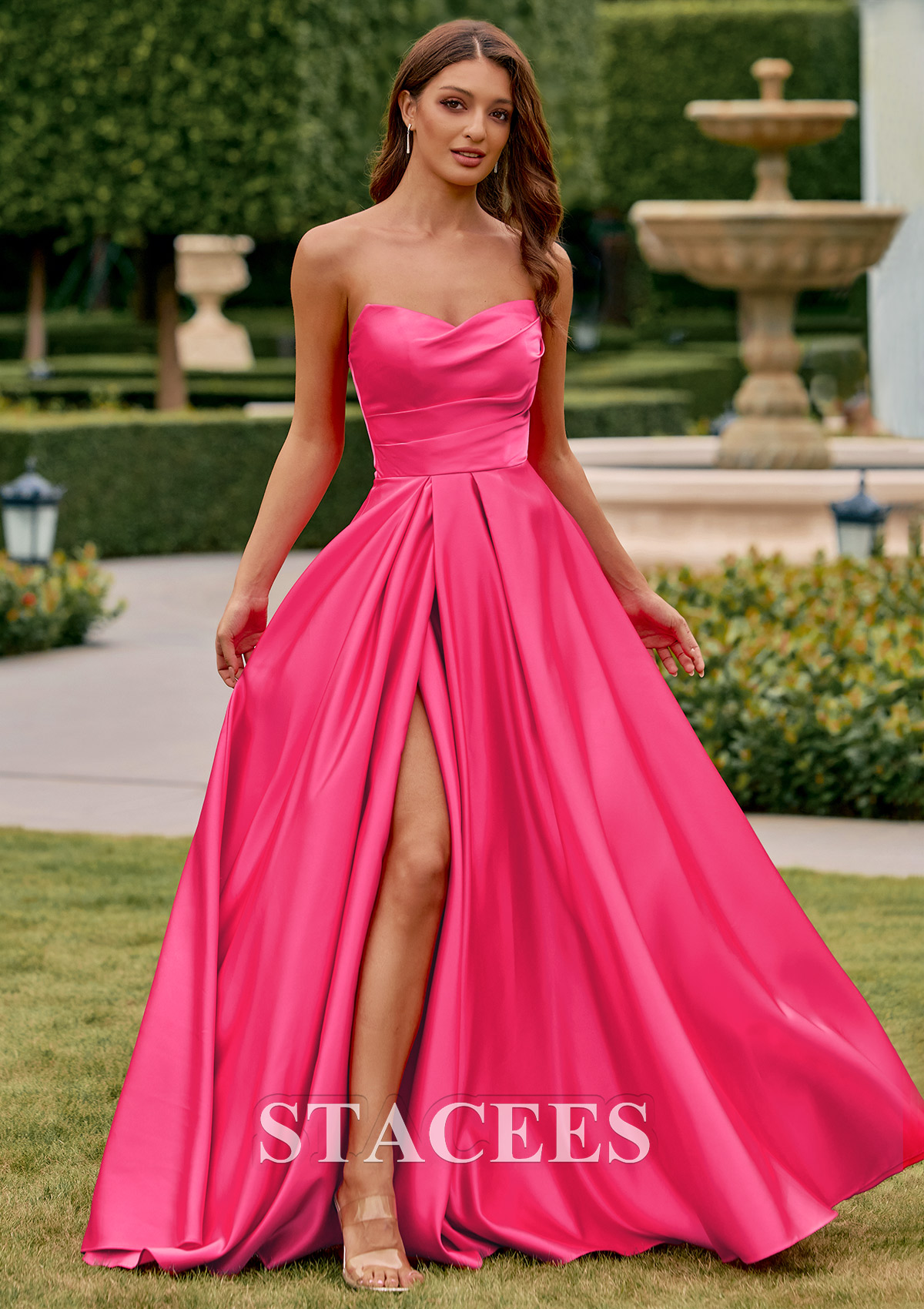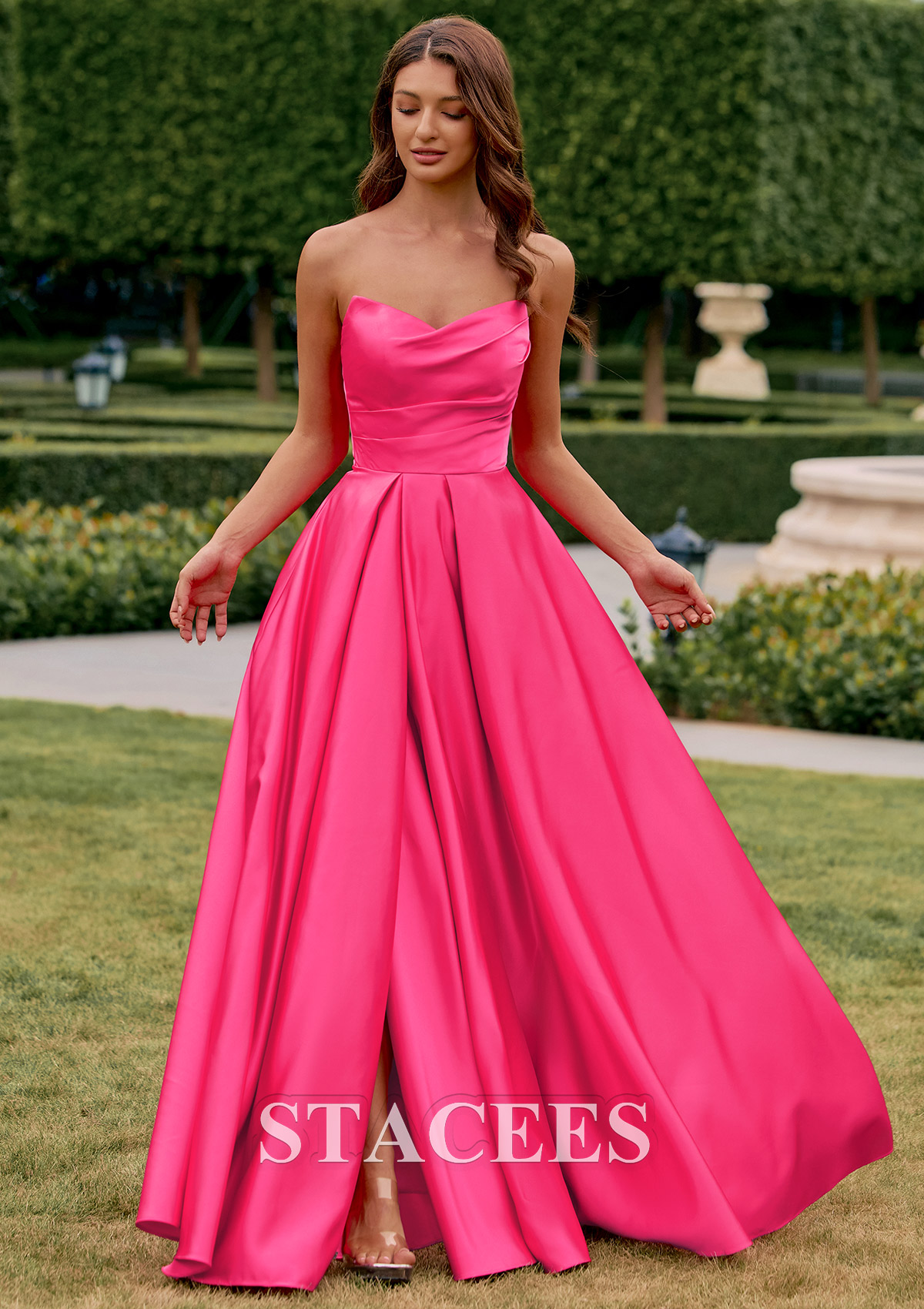 Make a dazzling statement at your next formal event with this vibrant strapless evening gown. Designed in lustrous satin, this dress features a classic strapless V neckline and a structured bodice that flatters your figure.  This A-line gown is designed to flatter, featuring a ruched or pleated bodice that cinches the waist, flowing into a luxurious, floor-length satin skirt. A sultry, high-leg slit adds modern flair and ease of movement, perfect for dancing the night away. The back of the gown boasts a lace-up corset design, allowing for a customizable, secure fit, and the sweeping floor-length hem creates an elegant, red-carpet-ready look. Perfect for prom, homecoming, or any glamorous occasion, this stunning pink dress is sure to turn heads and leave a lasting impression.