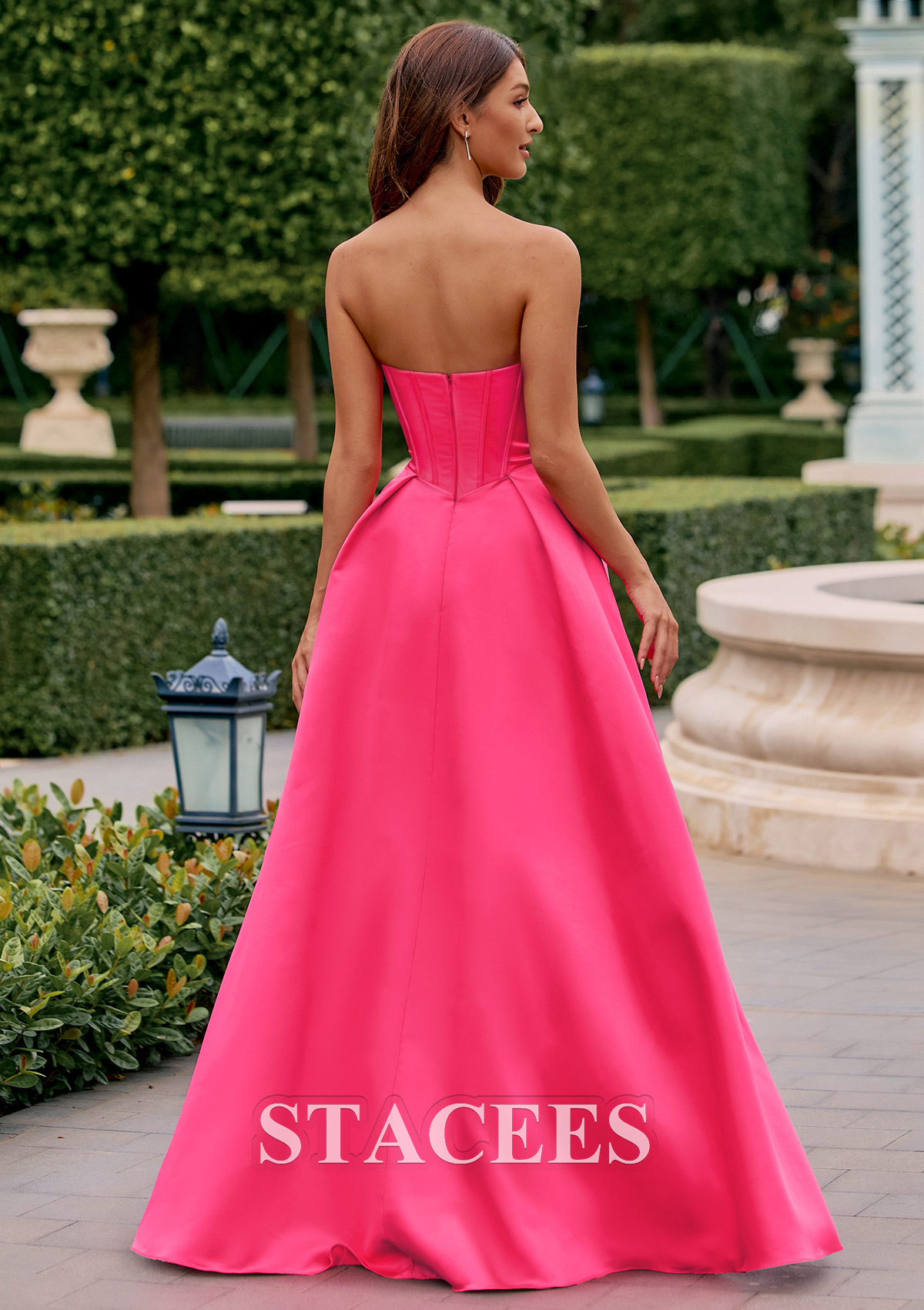 Make a dazzling statement at your next formal event with this vibrant strapless evening gown. Designed in lustrous satin, this dress features a classic strapless V neckline and a structured bodice that flatters your figure.  This A-line gown is designed to flatter, featuring a ruched or pleated bodice that cinches the waist, flowing into a luxurious, floor-length satin skirt. A sultry, high-leg slit adds modern flair and ease of movement, perfect for dancing the night away. The back of the gown boasts a lace-up corset design, allowing for a customizable, secure fit, and the sweeping floor-length hem creates an elegant, red-carpet-ready look. Perfect for prom, homecoming, or any glamorous occasion, this stunning pink dress is sure to turn heads and leave a lasting impression.