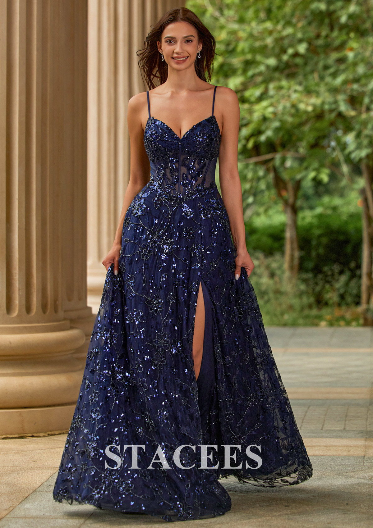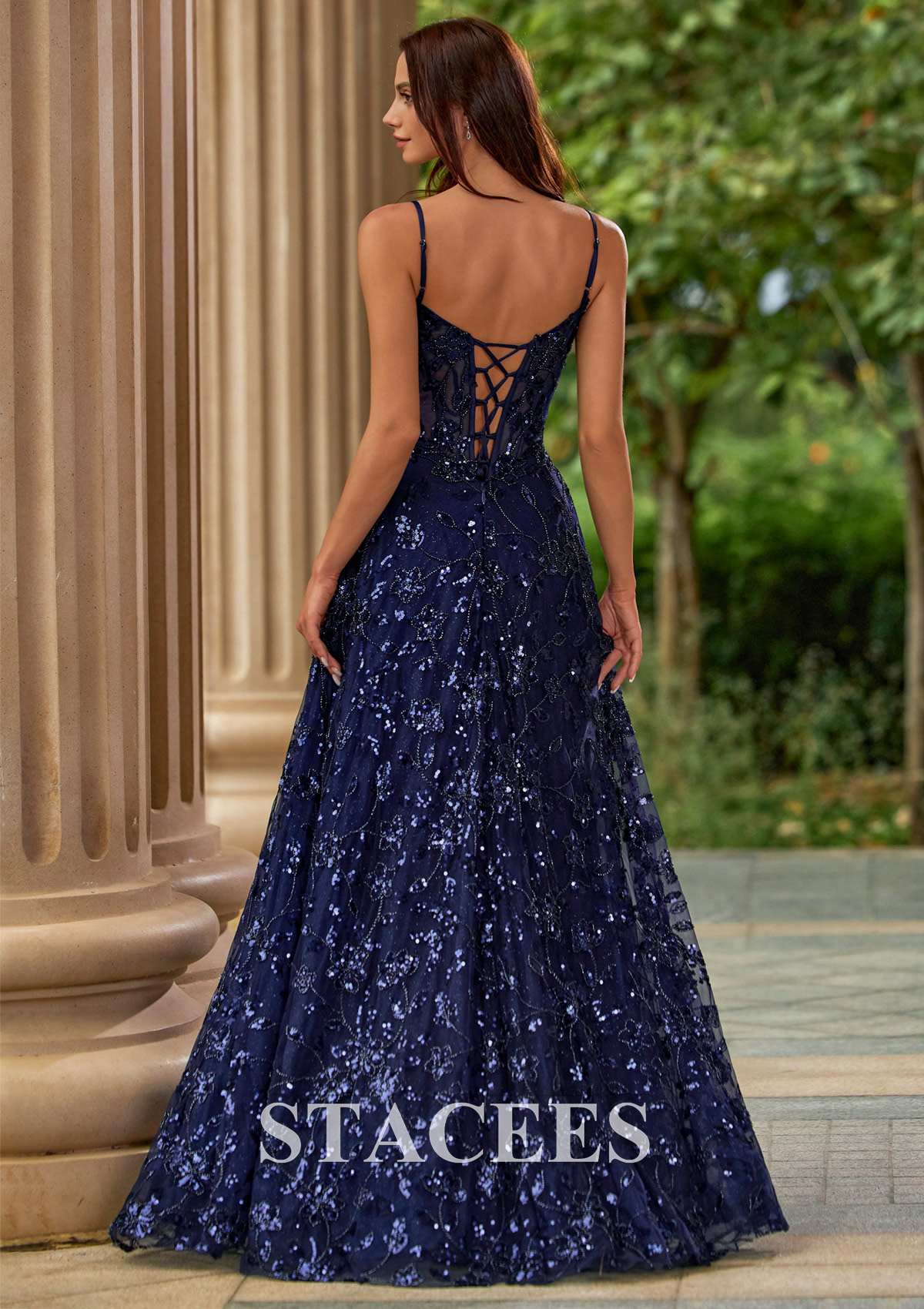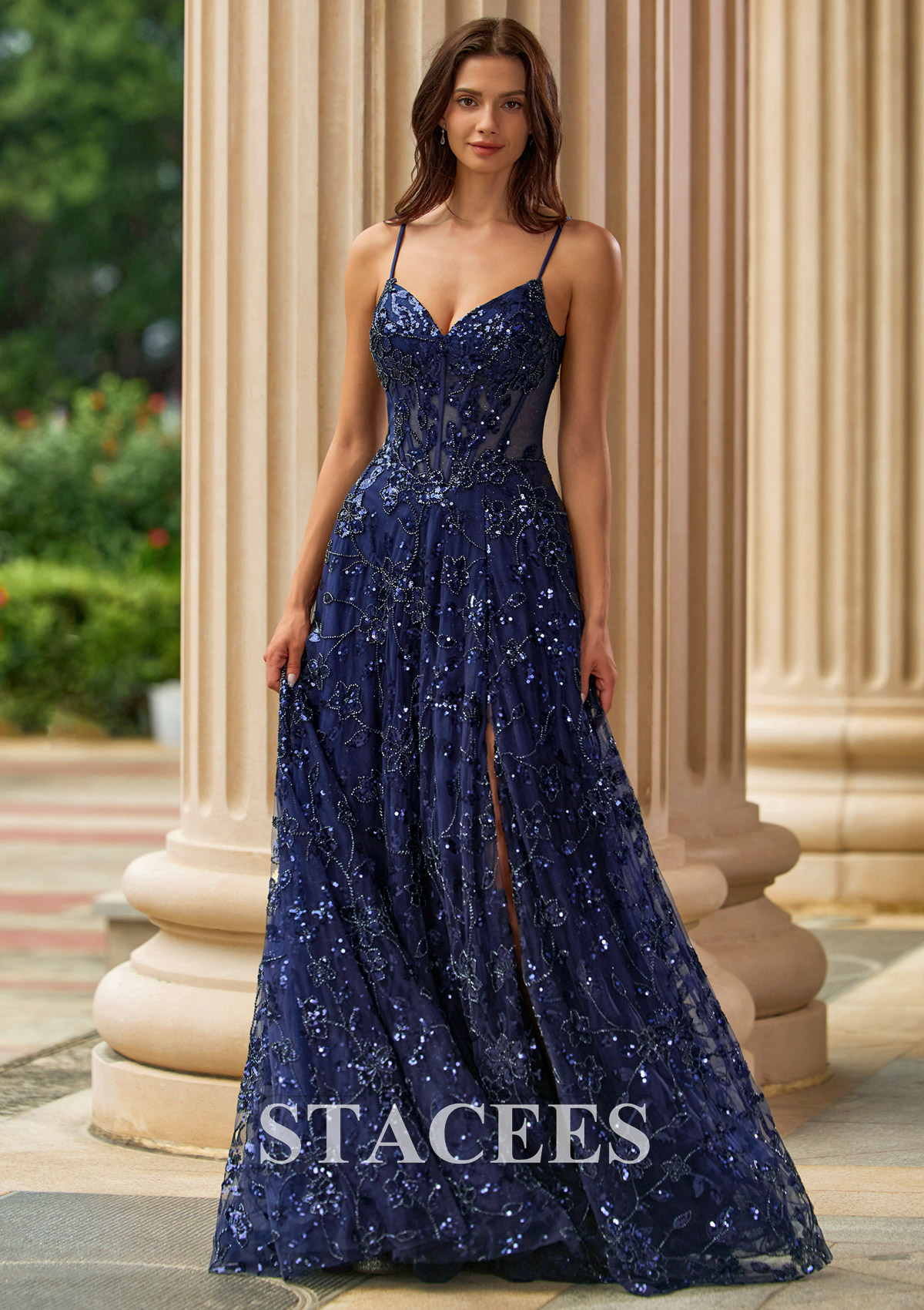 Dazzle in this sequin lace bead corset A‑line prom dress with v neckline, high slit, and lace‑up back, featuring a romantic A‑line silhouette and a glittering floral overlay from bodice to hem. The structured corset bodice includes visible boning and sheer illusion panels that cinch the waist, while the V neckline and slim spaghetti straps highlight your shoulders and decolletage. Sparkling sequins and embroidered floral motifs add texture and dimension, making this formal gown perfect for the dance floor. The full, flowy skirt falls to the floor with soft volume and a thigh‑high slit that adds a flirty, modern twist while giving you room to move. At the back, a lace‑up corset closure lets you adjust the fit for an hourglass shape and adds extra drama as you walk away. Ideal as a prom dress, evening gown, formal dress, pageant gown, or homecoming dress, this sequin A‑line is made for girls who want a bold, elegant, and timeless look.