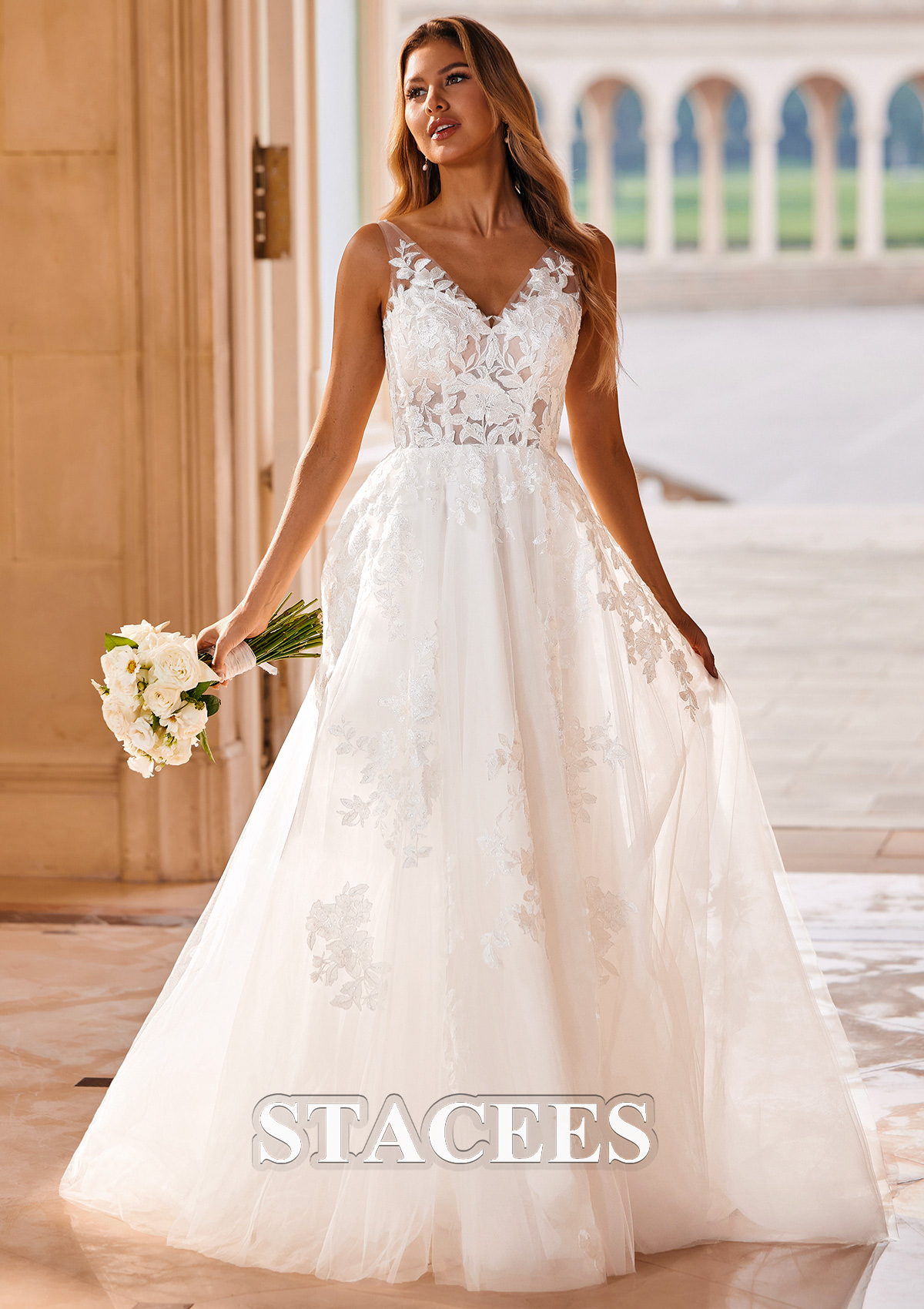 Ingeniously blending the nature's beauty with the romantic allure of a bridal gown, STACEES S3050W is truly a breathtaking artwork. The exquisite A-line cut elegantly unfolds from the waist, like a blooming flower, light and romantic. The low V-shaped design on the back reveals the graceful back curve, adding a bit of mystery and charm. The whole wedding dress is embellished with exquisite lace appliques, each piece seems to be a hand-embroidered artwork, exuding a delicate and romantic atmosphere. The lace appliques are inlaid with tiny beads, like the twinkling stars in the night sky, adding endless brilliance to the wedding dress. Whether it is a solemn church wedding or a romantic garden wedding , this wedding dress can make you exude unparalleled beauty and charm.