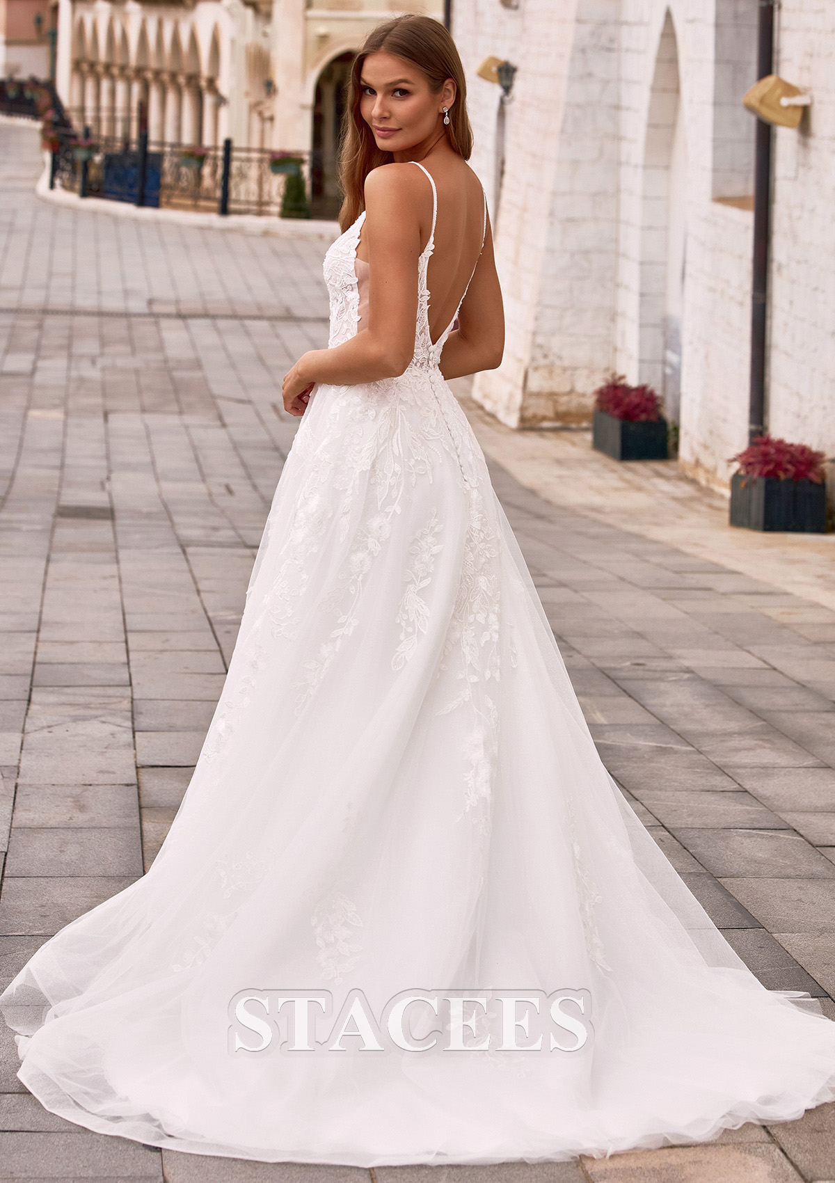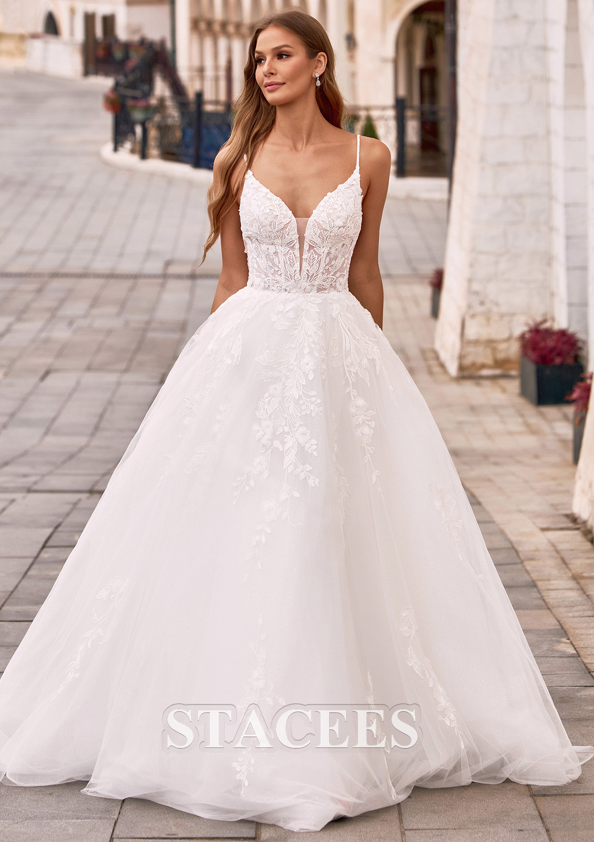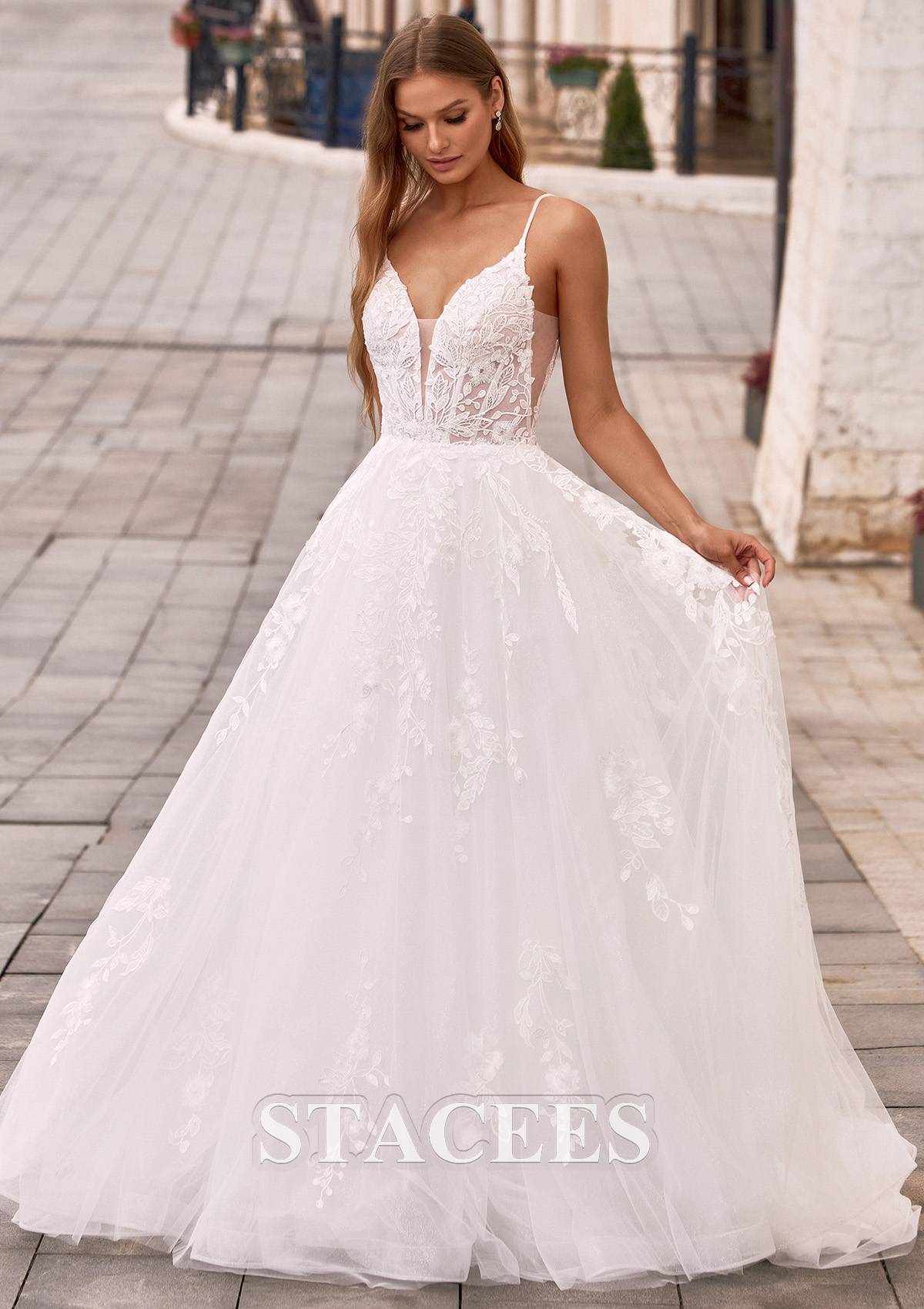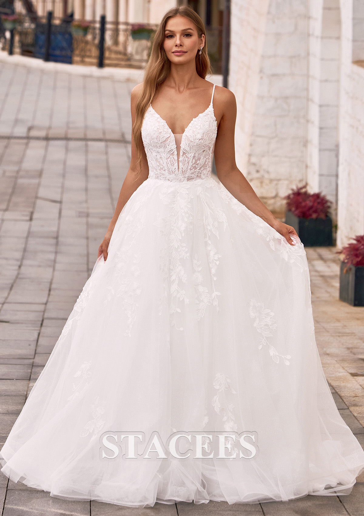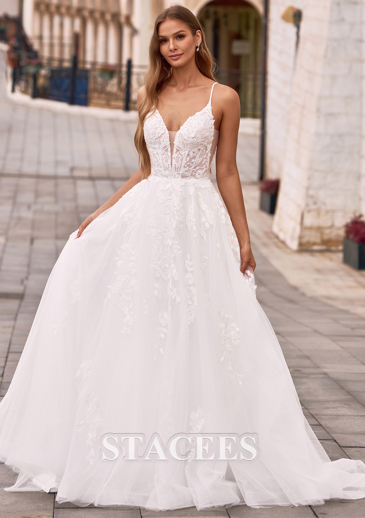 This wedding dress features a charming V-neckline that beautifully frames the neck and collarbone, while slender spaghetti straps add a light and feminine touch. The fitted bodice naturally defines the waist and flows seamlessly into a graceful A-line skirt, creating an elegant and elongated silhouette. Lace details delicately scattered across the skirt add dimension and romantic charm while maintaining an airy and graceful look. At the back, an elegant V-back design highlights the bride’s beautiful lines while adding a subtle hint of allure. The flowing train moves softly with every step, bringing an extra touch of romance and elegance to the overall look. The design is both graceful and romantic, beautifully highlighting the bride’s gentle and charming presence.