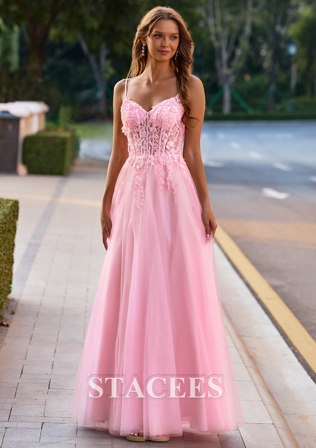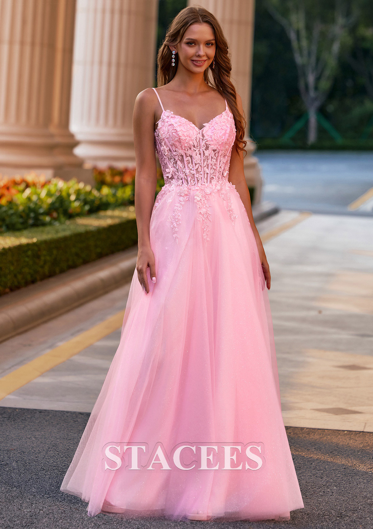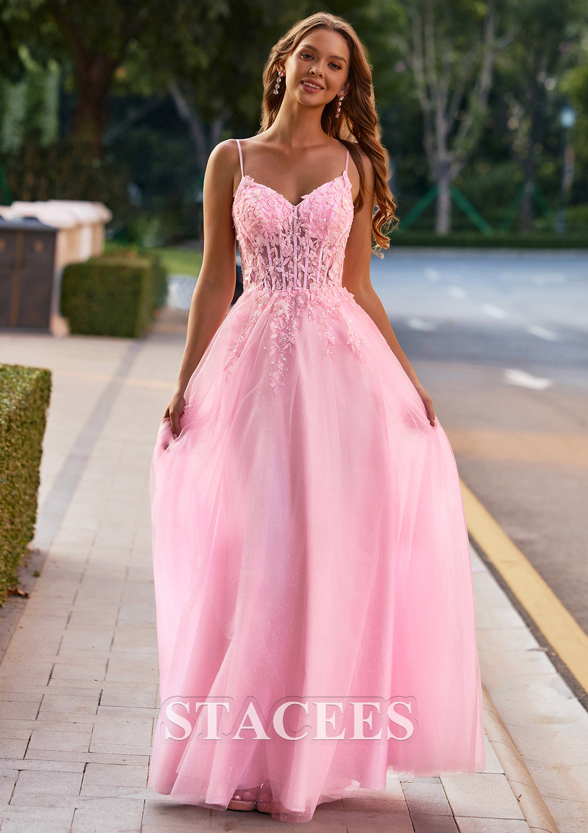 Radiate elegance and romance in this ethereal prom dress, perfect for prom nights, quinceaneras, or formal evenings where you want to feel like a princess. Featuring delicate spaghetti straps and a fitted sheer exposed boning corset-style bodice bodice adorned with intricate floral lace and applique, this gown flatters every figure and provides feminine charm. The shimmering glitter tulle skirt flows gracefully to the floor, creating a dreamy ball gown silhouette that glides beautifully with movement. The multi-layered tulle skirt flows gracefully to the floor, creating a light and airy silhouette that is perfect for dancing the night away. A lace-up sheer structured corset-style back offers a customizable fit and adds a touch of vintage-inspired detail, while floral embellishments trail elegantly down the bodice. Capture the spotlight and feel like a modern-day princess in this stunning pink evening dress.