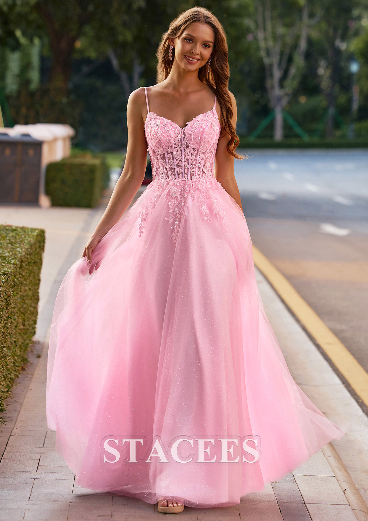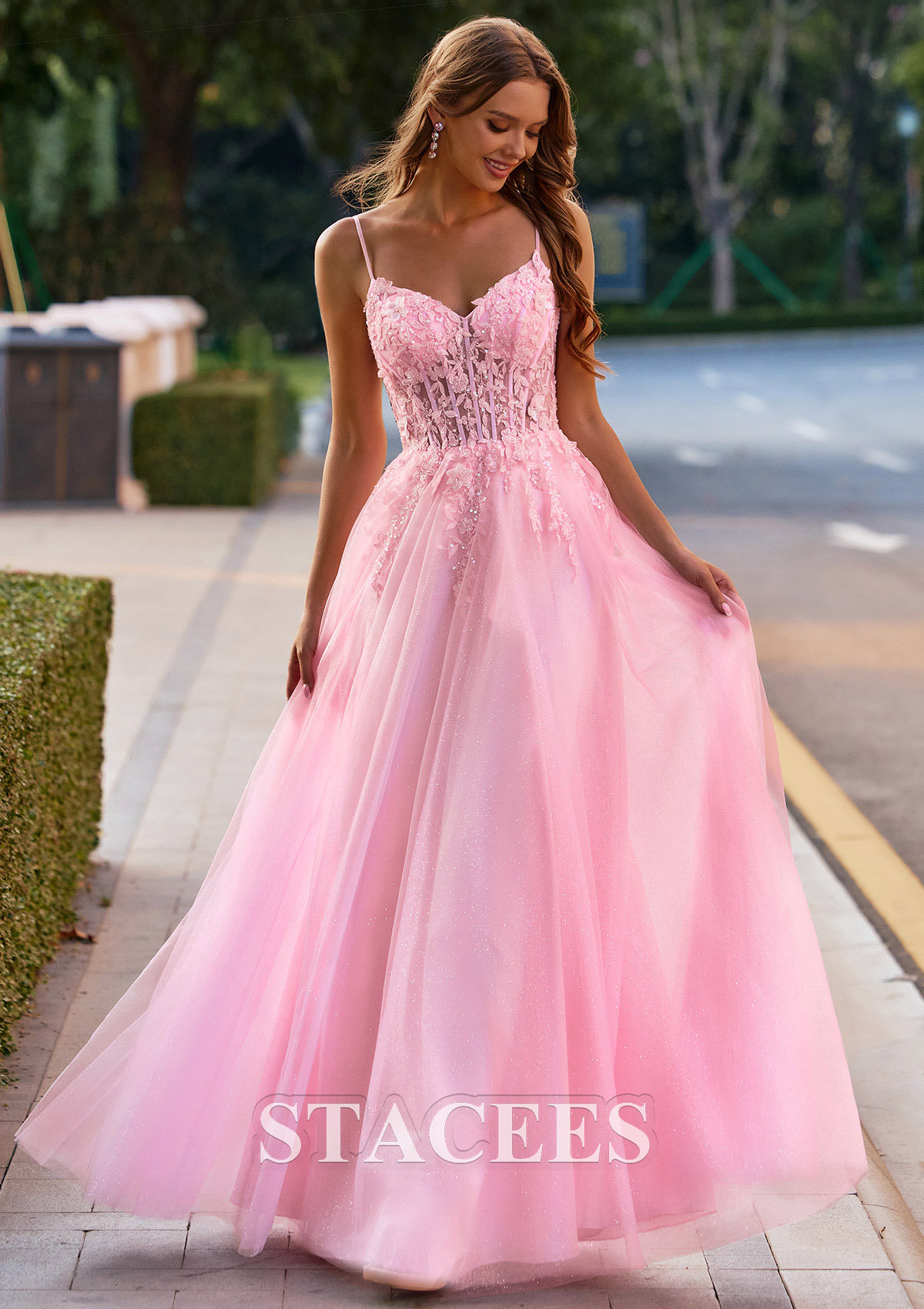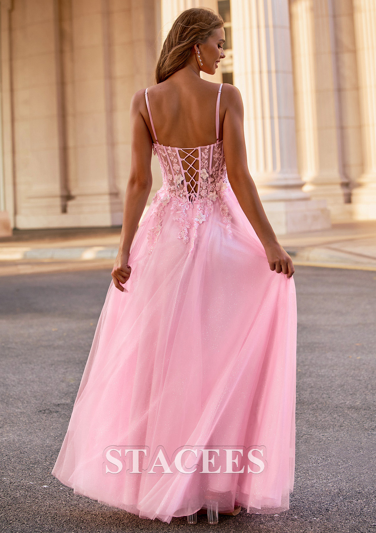 Radiate elegance and romance in this ethereal prom dress, perfect for prom nights, quinceaneras, or formal evenings where you want to feel like a princess. Featuring delicate spaghetti straps and a fitted sheer exposed boning corset-style bodice bodice adorned with intricate floral lace and applique, this gown flatters every figure and provides feminine charm. The shimmering glitter tulle skirt flows gracefully to the floor, creating a dreamy ball gown silhouette that glides beautifully with movement. The multi-layered tulle skirt flows gracefully to the floor, creating a light and airy silhouette that is perfect for dancing the night away. A lace-up sheer structured corset-style back offers a customizable fit and adds a touch of vintage-inspired detail, while floral embellishments trail elegantly down the bodice. Capture the spotlight and feel like a modern-day princess in this stunning pink evening dress.