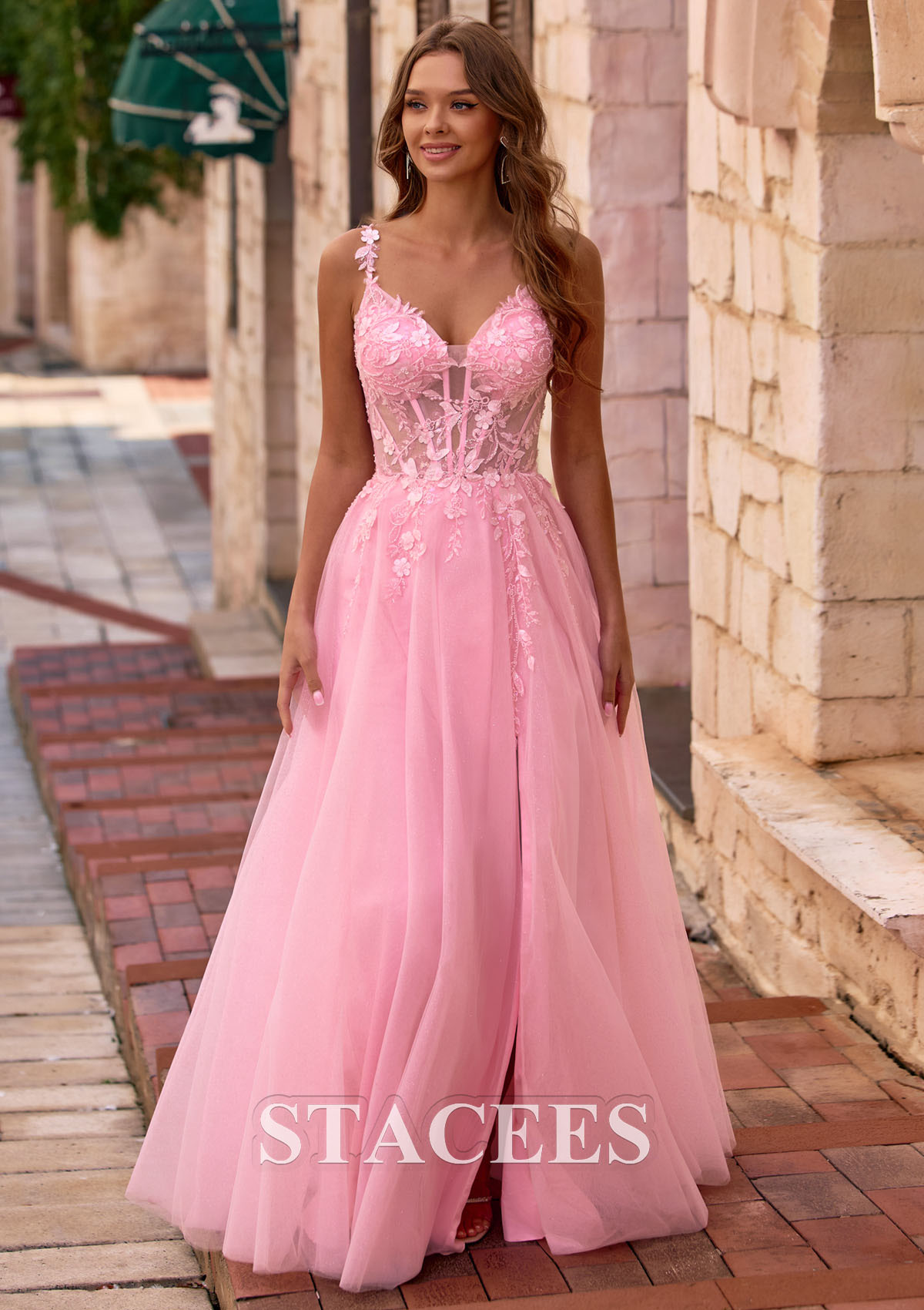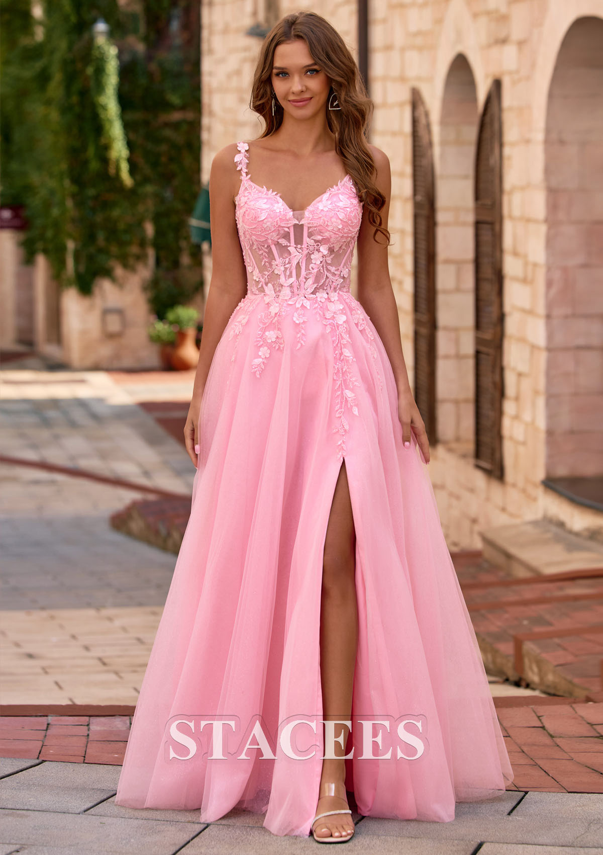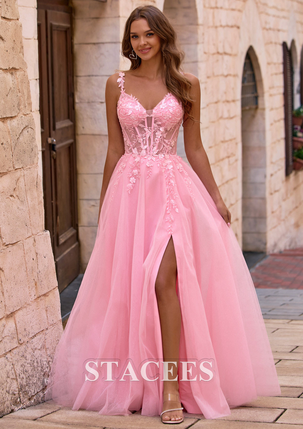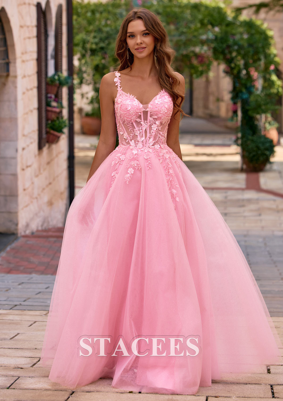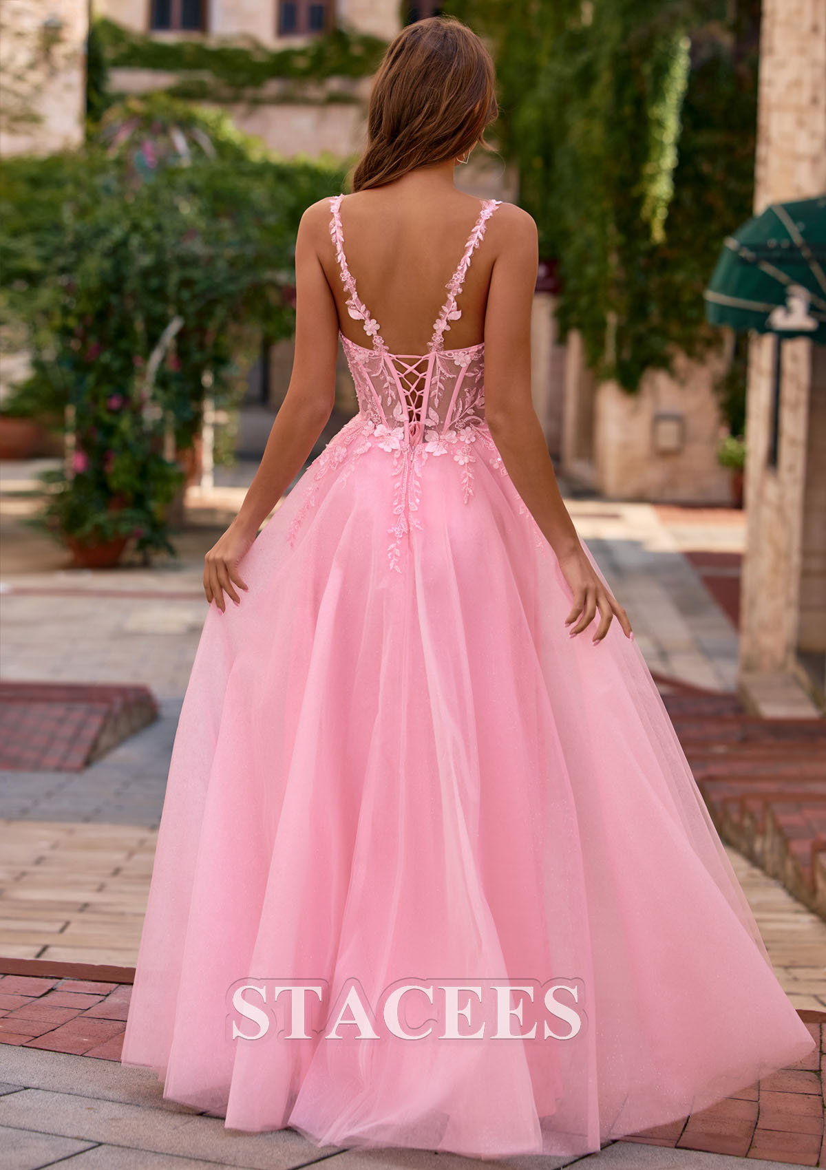 Turn heads at your next formal event in this breathtaking pink A-line prom dress, expertly crafted for an unforgettable entrance. The gown features a delicate sheer bodice adorned with intricate 3D floral embroidery and applique, creating a romantic, feminine look. Its figure-flattering silhouette includes a plunging V-neckline, supportive lace-up corset back, and adjustable embroidered straps for the perfect fit. It is often fully lined and may feature built-in boning for structure. The flowing glitter tulle skirt, made voluminous with layers, includes a tasteful front slit for added elegance and ease of movement. Perfect for proms, quinceaneras, and special occasions, this stunning dress combines modern glamour with classic fairytale charm. The open V-back and subtle shimmer ensure you shine from every angle, while the exquisite lace and floral details highlight your unique sense of style. Make your prom night one to remember with this elegant, princess-inspired gown.