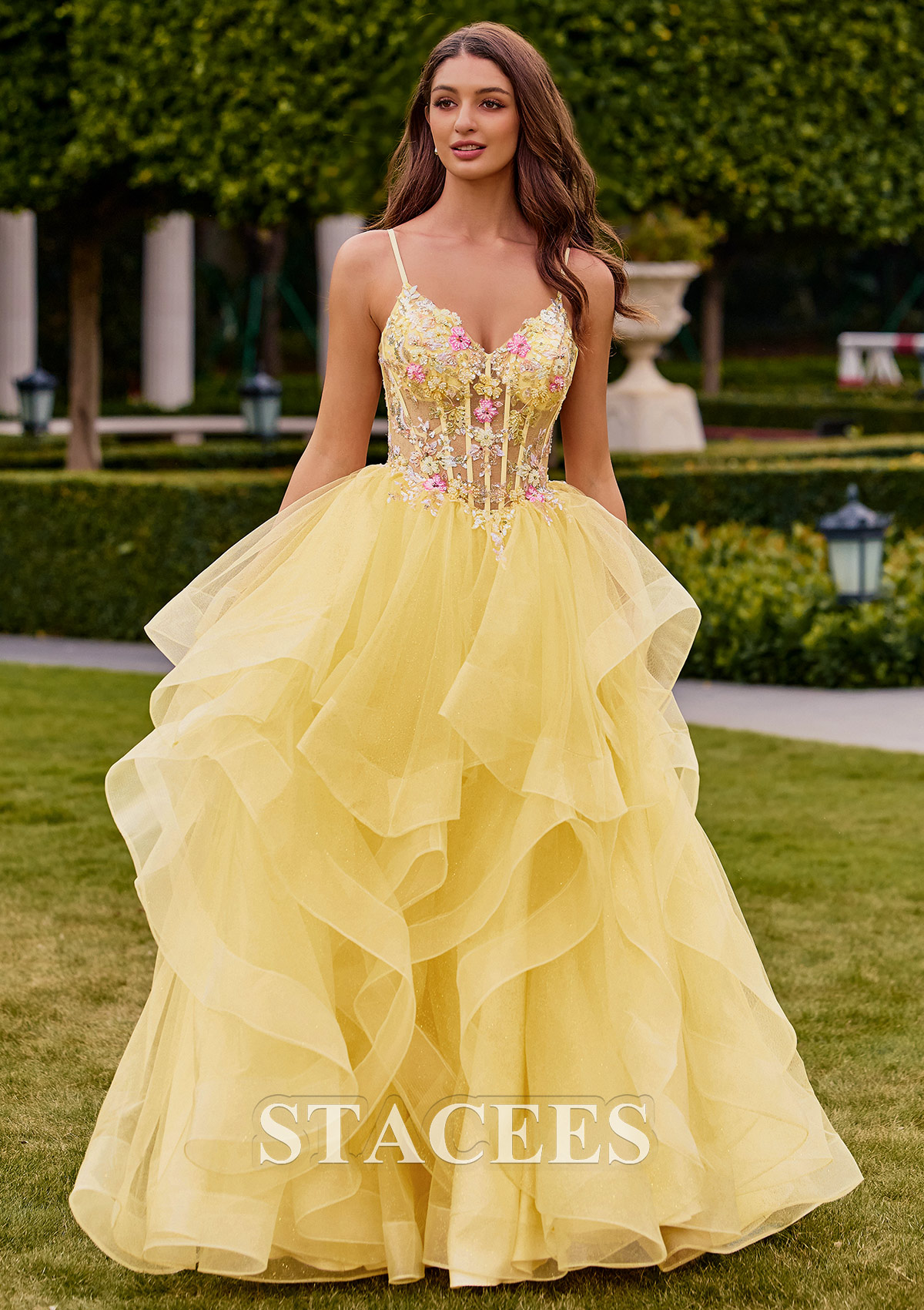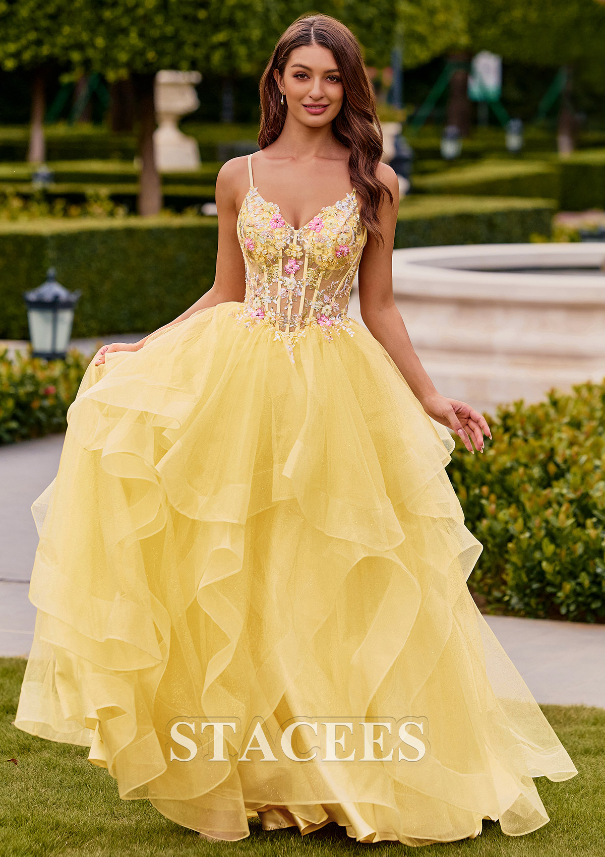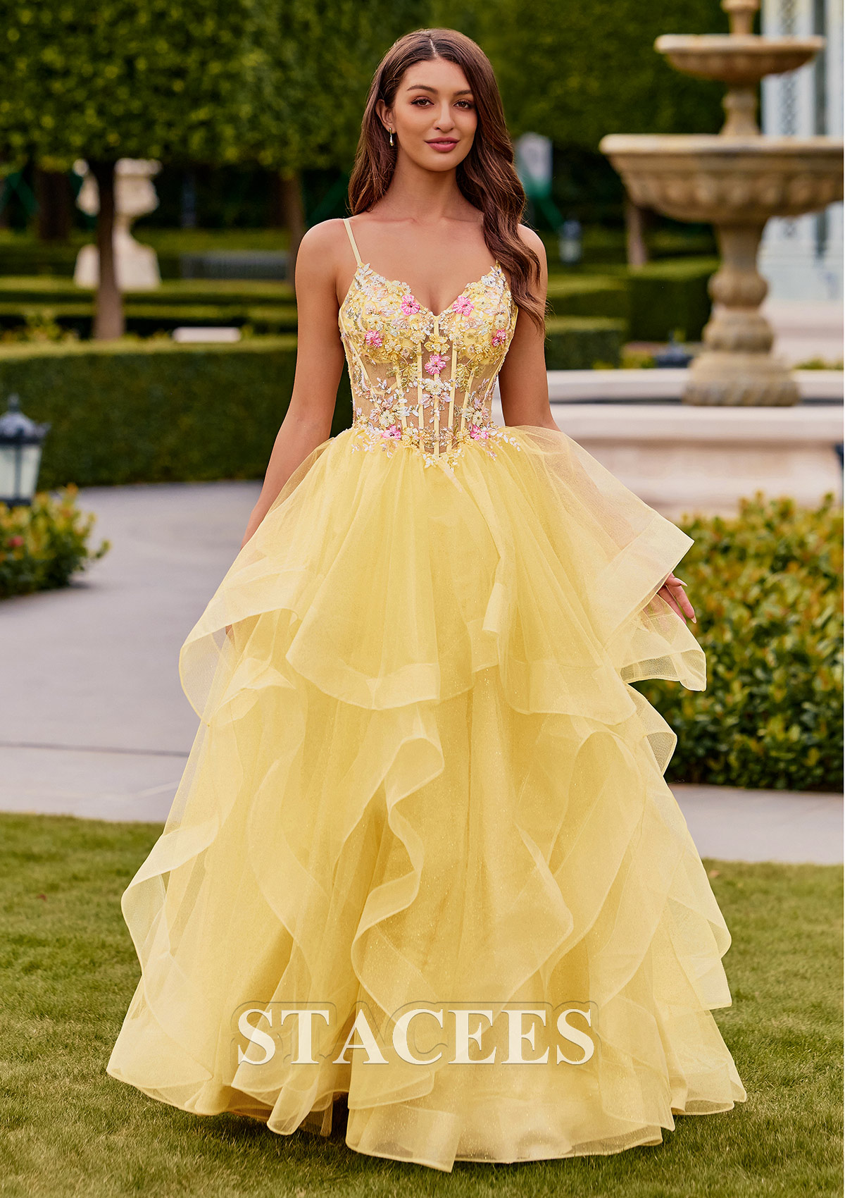 Sparkly Floral Sheer Corset Tulle Prom Dress with Ruffled Layered Ball Gown Skirt S9018P - Prom Dresses - Stacees