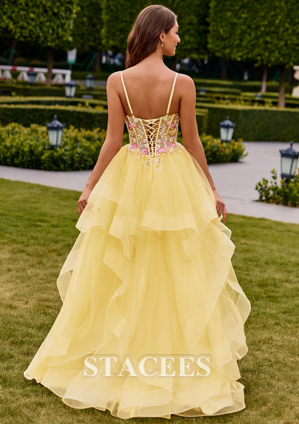 Turn every entrance into a fairytale moment in this floral corset tulle prom dress. The gown features a sheer, boned bodice with delicate spaghetti straps and a flattering sweetheart neckline, adorned with 3D floral appliqués in soft pink, yellow, and ivory that cascade gently over the waist. The semi‑illusion corset design highlights your figure while still feeling romantic and feminine. From the waist down, the dress flows into a full ball gown skirt crafted from layered glitter tulle, creating dreamy volume and movement with every step. The tiered, ruffled skirt adds drama and texture. In the back, a lace‑up corset closure lets you adjust the fit perfectly to your shape while adding a classic, princess‑inspired touch. This prom gown is ideal for prom, quinceañeras, sweet 16 parties, pageants, and formal evenings. Its combination of floral detailing, corset bodice, and layered tulle skirt gives you a standout look that is soft, elegant, and unforgettable. Pair it with simple jewelry and loose waves to complete your garden‑princess aesthetic.