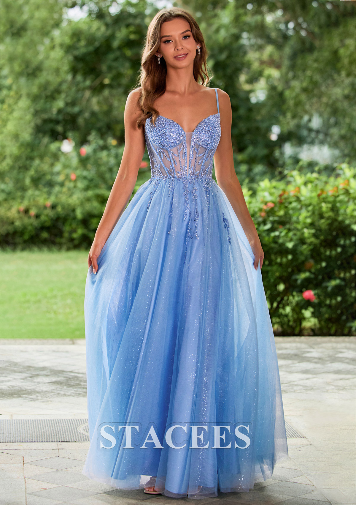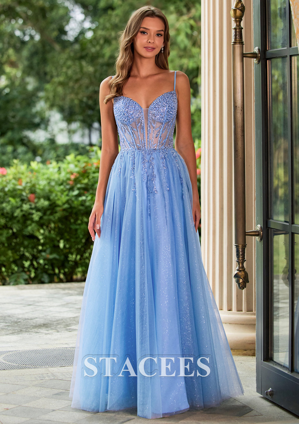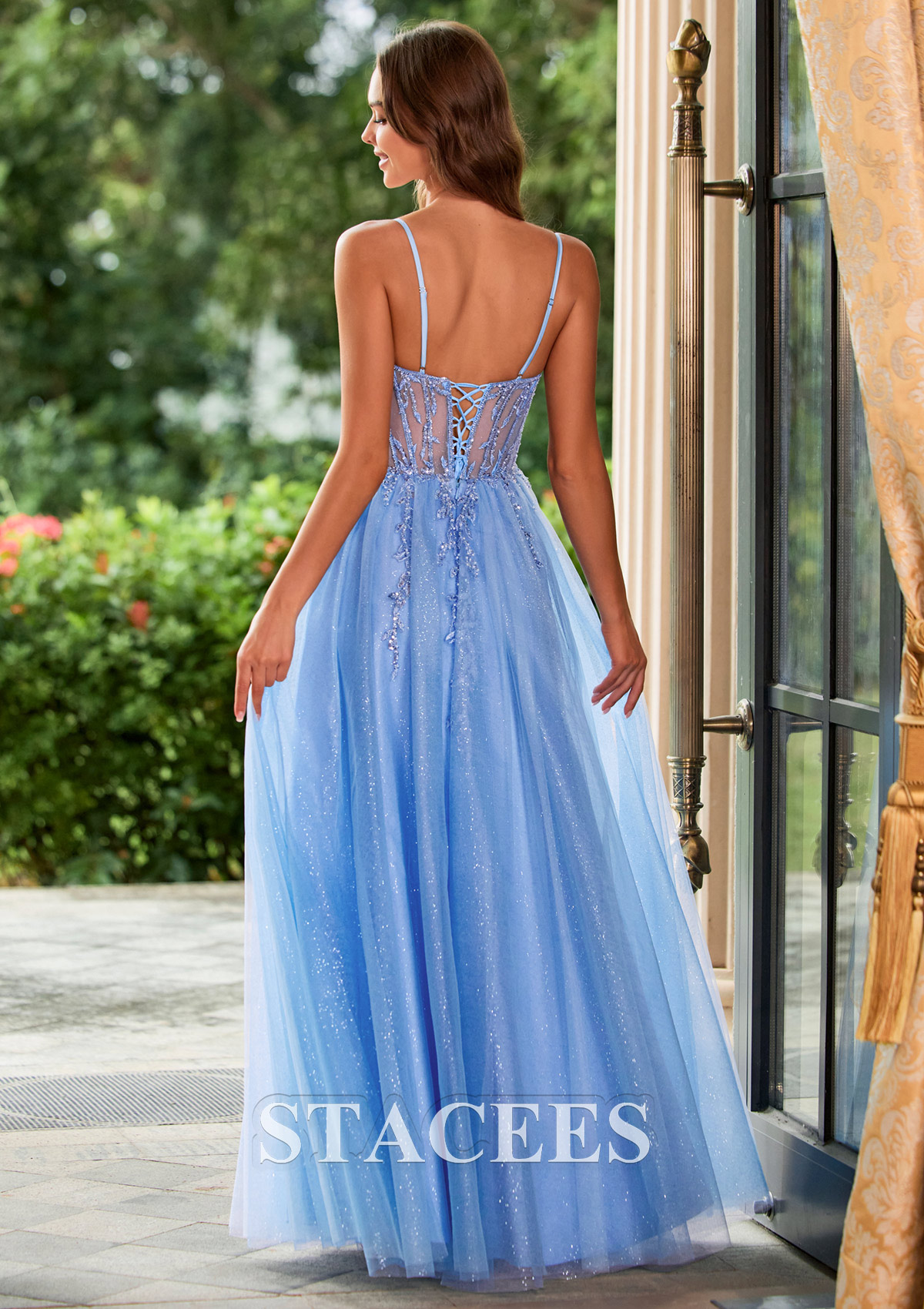 Step into the night in this sparkle prom dress, designed with a romantic A‑line silhouette and a glitter tulle skirt that catches every beam of light. The fitted corset-style bodice features a sweetheart neckline, sheer illusion panels, and intricate bead and applique detailing that accentuates the waist and bust. Slim spaghetti straps frame the shoulders for a delicate, feminine look, while the floor‑length skirt flows into a soft, airy finish. A thigh‑high front slit adds a modern, flirty touch and makes walking and dancing effortless. The back of the dress showcases a lace‑up corset closure, allowing you to adjust the fit perfectly and highlighting your figure from every angle. Ideal as a prom dress, evening gown, formal dress, or bridesmaid dress, this shimmering blue gown is perfect for anyone wanting a dreamy, Cinderella‑inspired look at prom, homecoming, galas, and special occasions
