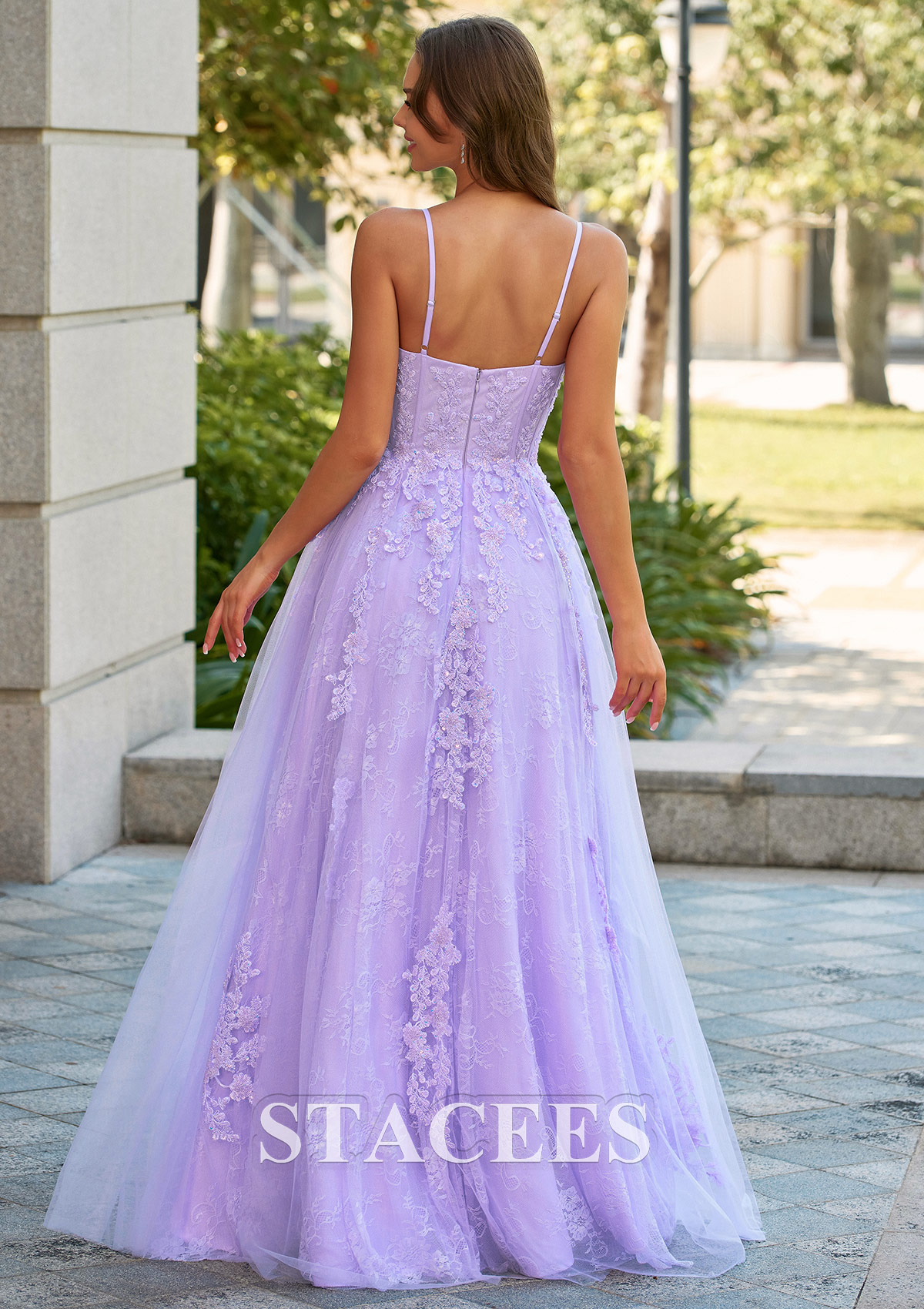 Step into a fairytale with this stunning lilac A-line prom dress from Stacees, designed to make your special night unforgettable. This elegant ball gown features delicate floral leaf lace appliques scattered throughout the sheer corset bodice and flowing tulle skirt. The spaghetti straps lead to a charming criss-cross, open-back design, ensuring a flattering fit and a touch of romance. Perfect for prom, formal events, or a wedding party, this dress combines classic silhouette with modern detail.