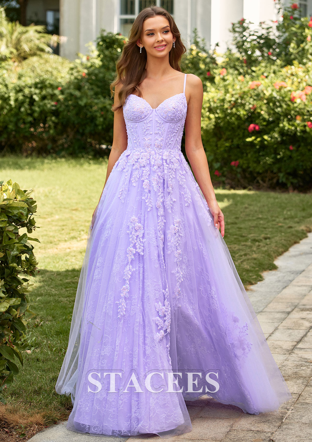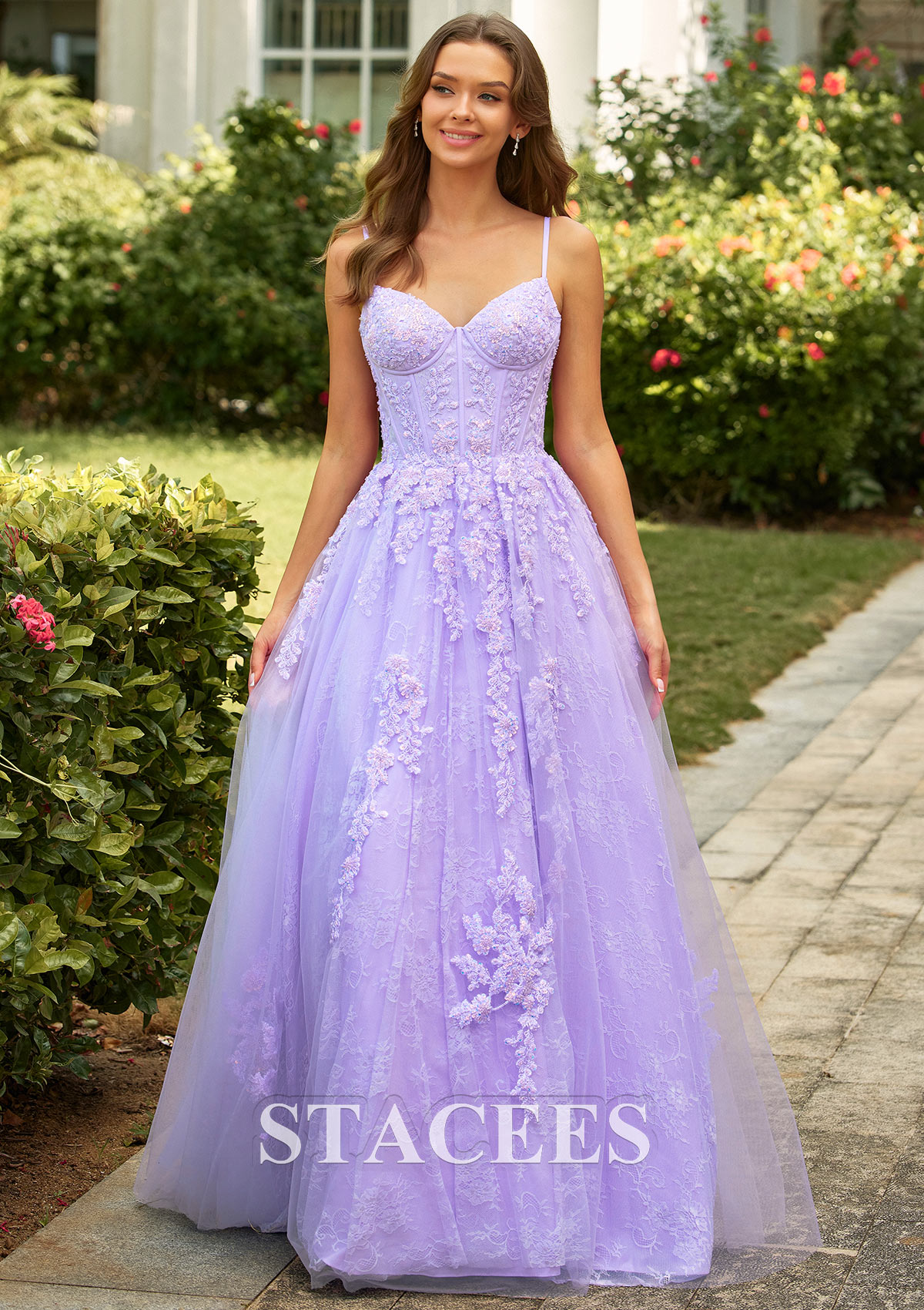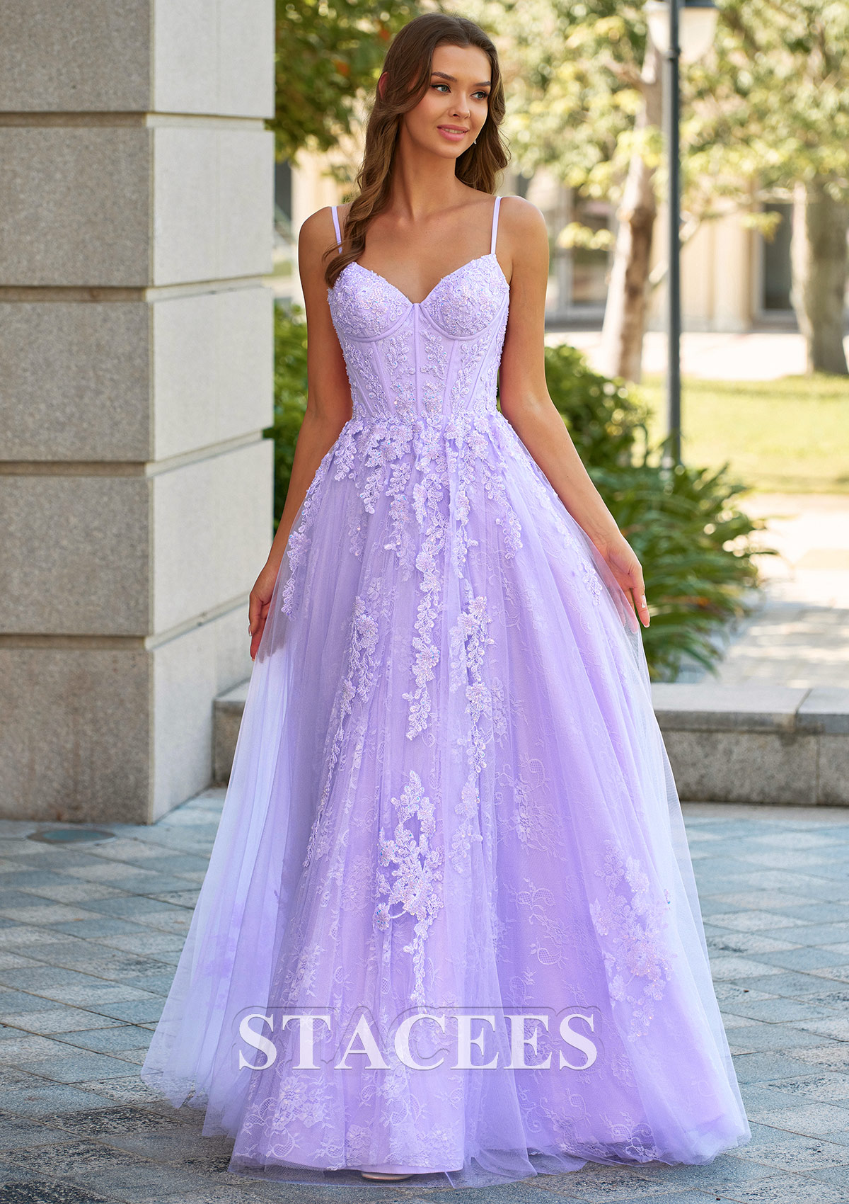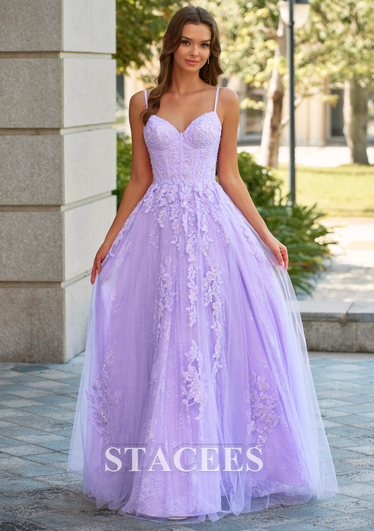 A-line Floral Lace Applique Prom Dress with Spaghetti Straps Corset Bodice S9085P - Prom Dresses - Stacees