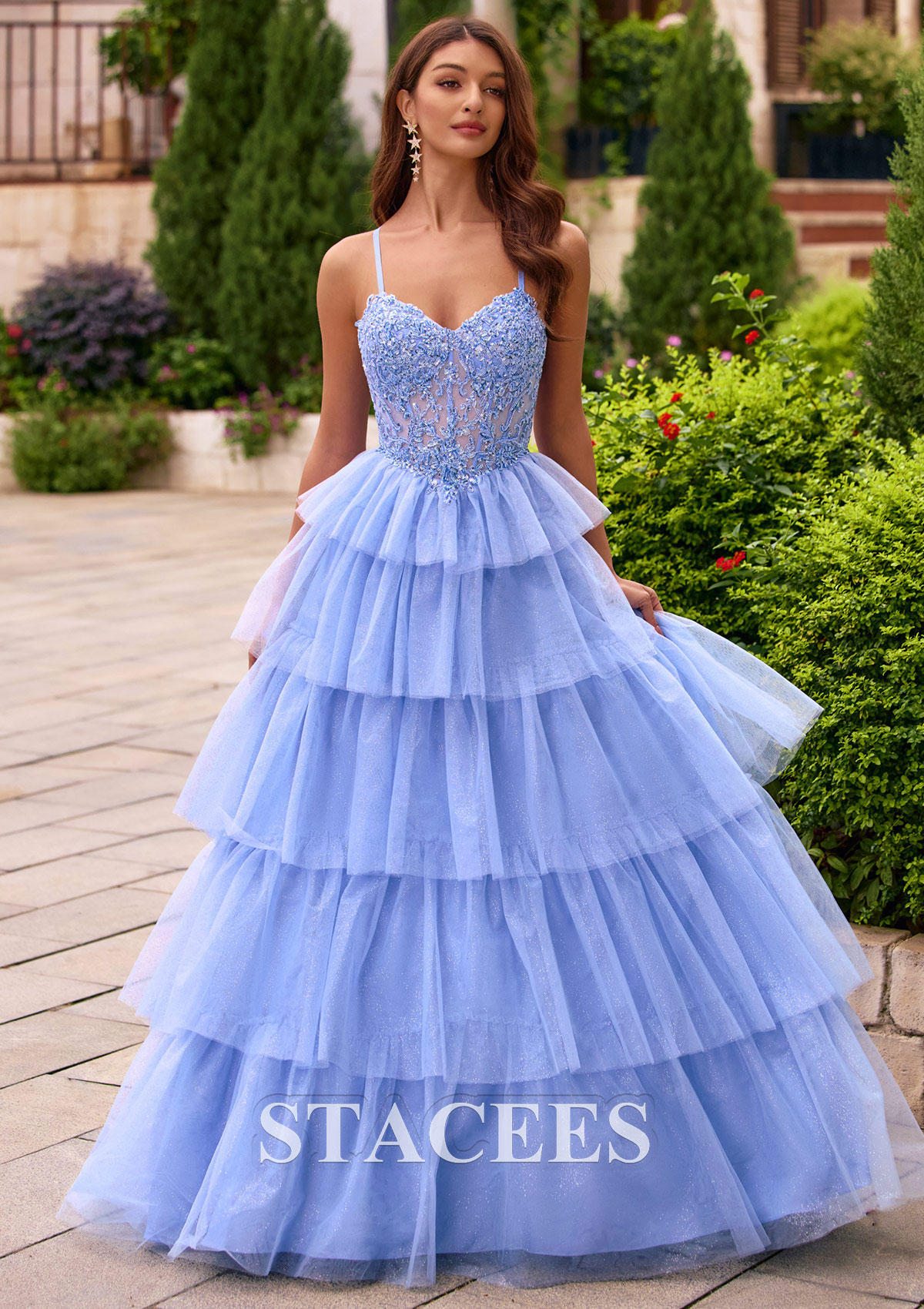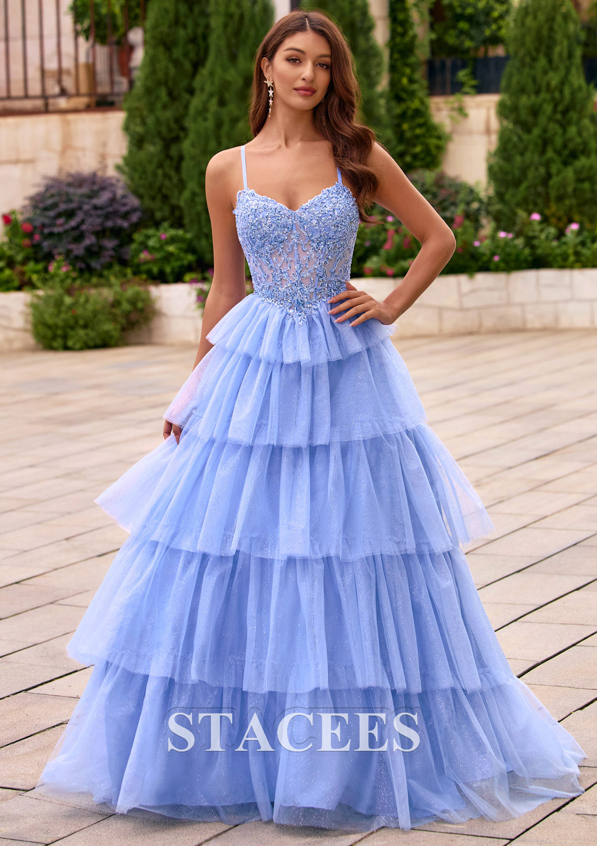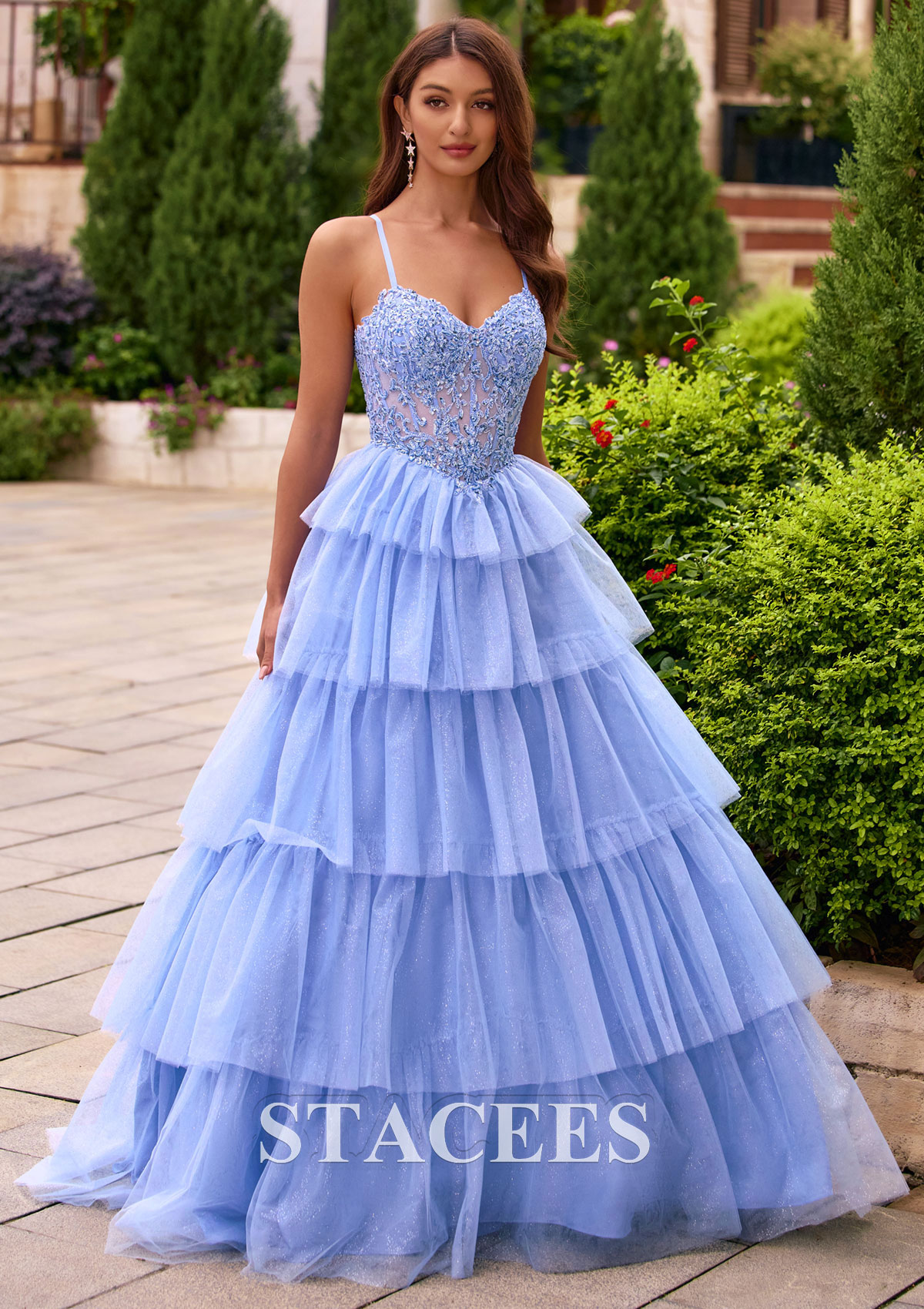 Be the belle of the ball in this enchanting tiered prom dress. Float into prom night in this dreamy tiered show-stopping A-line ball gown from Stacees perfect for girls who want a true princess look. The fitted illusion corset bodice is covered in sparkling beadwork, floral lace appliques and subtle sequin embellishments, creating a sculpted, flattering shape that highlights the waist. Slim spaghetti straps frame the sweetheart neckline and lead into a crisscross lace-up back, allowing you to customize the fit and add extra visual interest from behind. From the waist down, layers of soft glittering tiered tulle ruffles cascade into a full ball gown skirt, giving you volume, movement, and that fairytale ball gown silhouette. The glitter tulle has a subtle shimmer that catches the light as you walk and dance, making this dress ideal for prom, quinceañeras, sweet 16 parties, and formal evening events. The voluminous skirt is balanced by the sleek bodice, so the gown feels glamorous without being overwhelming.