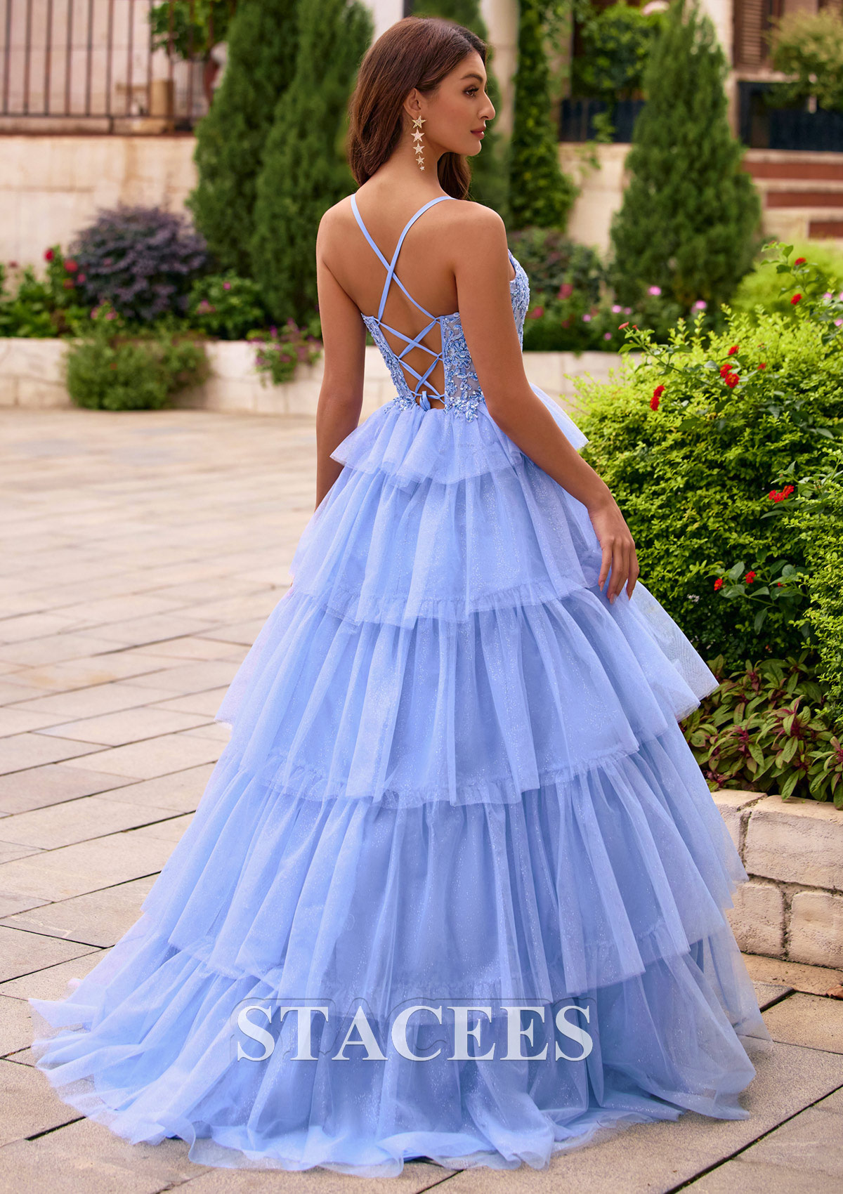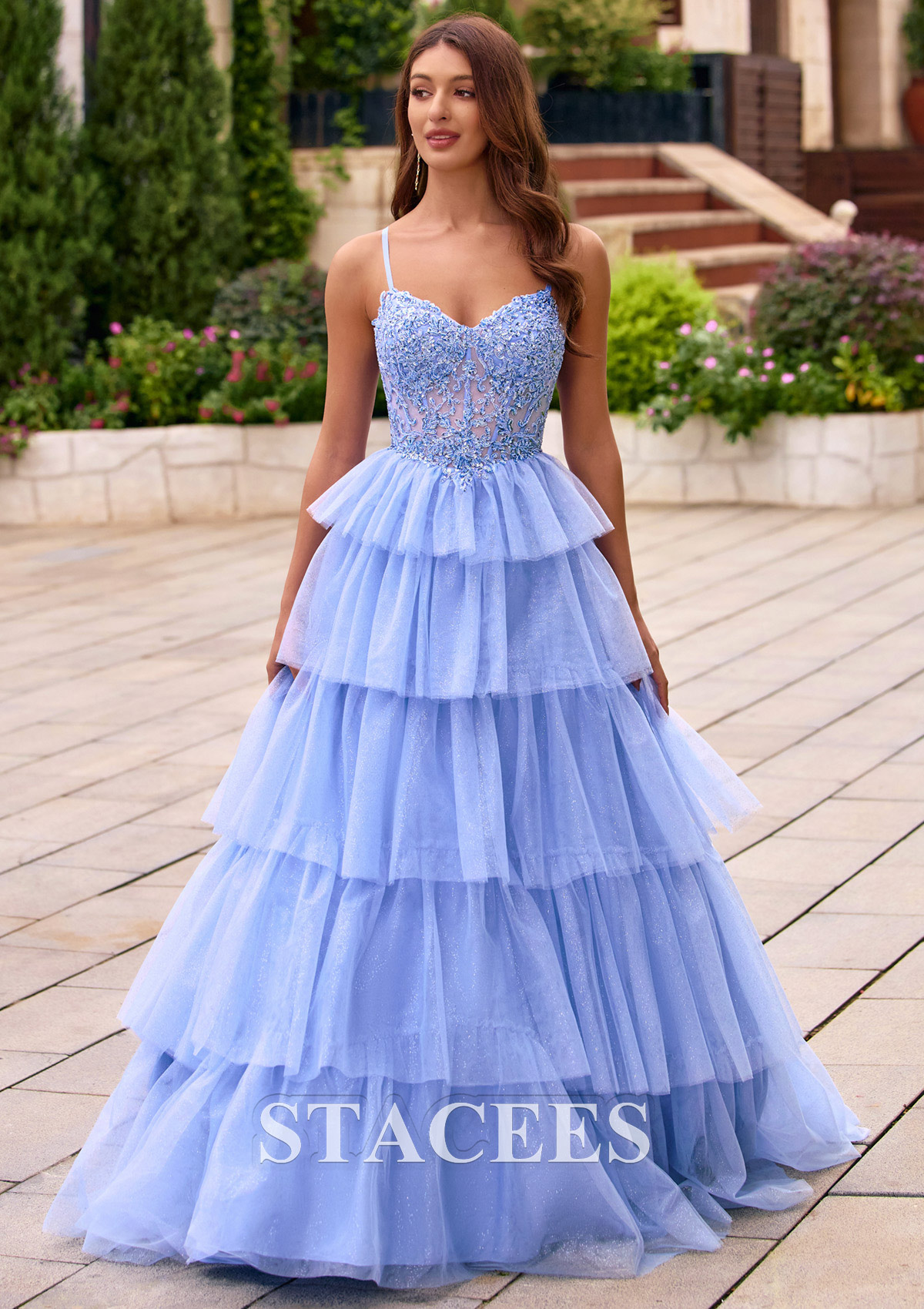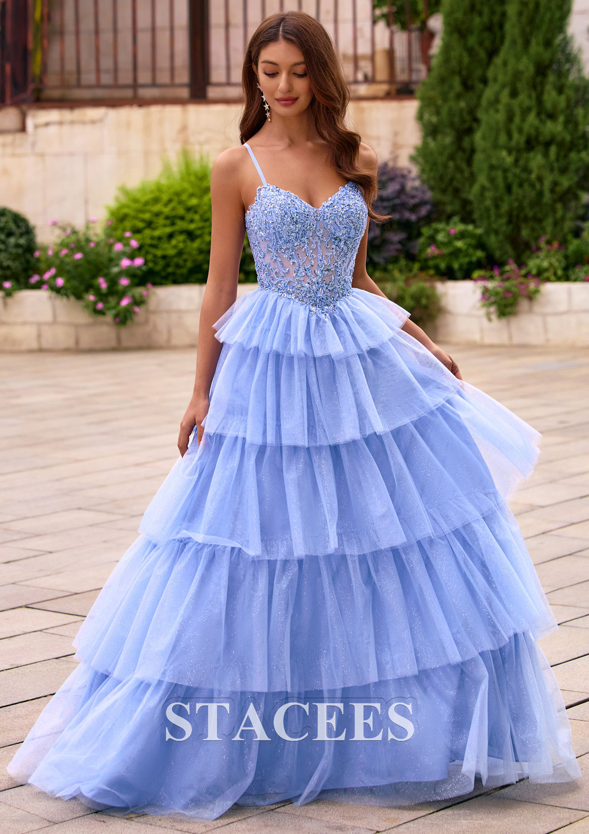 Be the belle of the ball in this enchanting tiered prom dress. Float into prom night in this dreamy tiered show-stopping A-line ball gown from Stacees perfect for girls who want a true princess look. The fitted illusion corset bodice is covered in sparkling beadwork, floral lace appliques and subtle sequin embellishments, creating a sculpted, flattering shape that highlights the waist. Slim spaghetti straps frame the sweetheart neckline and lead into a crisscross lace-up back, allowing you to customize the fit and add extra visual interest from behind. From the waist down, layers of soft glittering tiered tulle ruffles cascade into a full ball gown skirt, giving you volume, movement, and that fairytale ball gown silhouette. The glitter tulle has a subtle shimmer that catches the light as you walk and dance, making this dress ideal for prom, quinceañeras, sweet 16 parties, and formal evening events. The voluminous skirt is balanced by the sleek bodice, so the gown feels glamorous without being overwhelming.