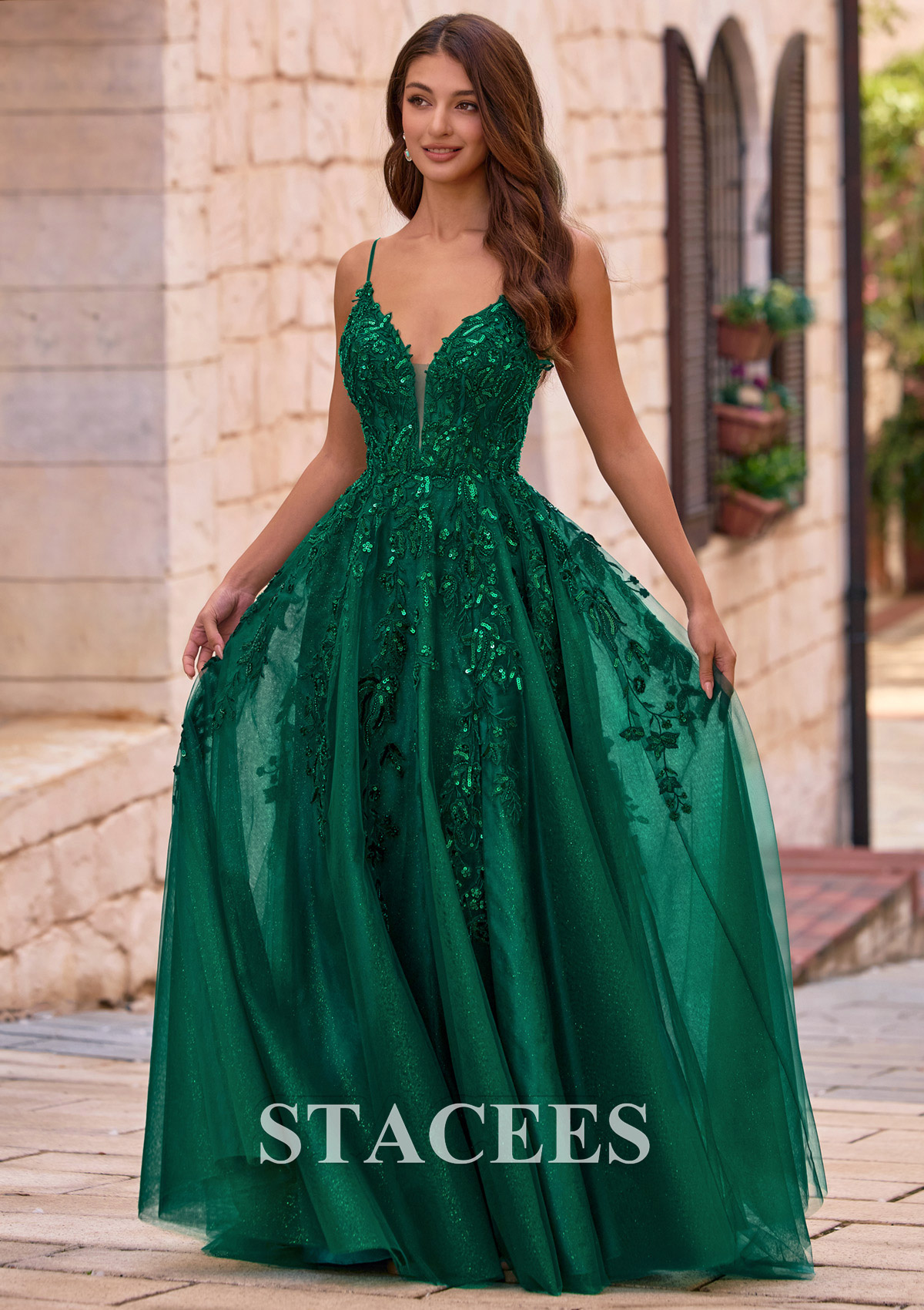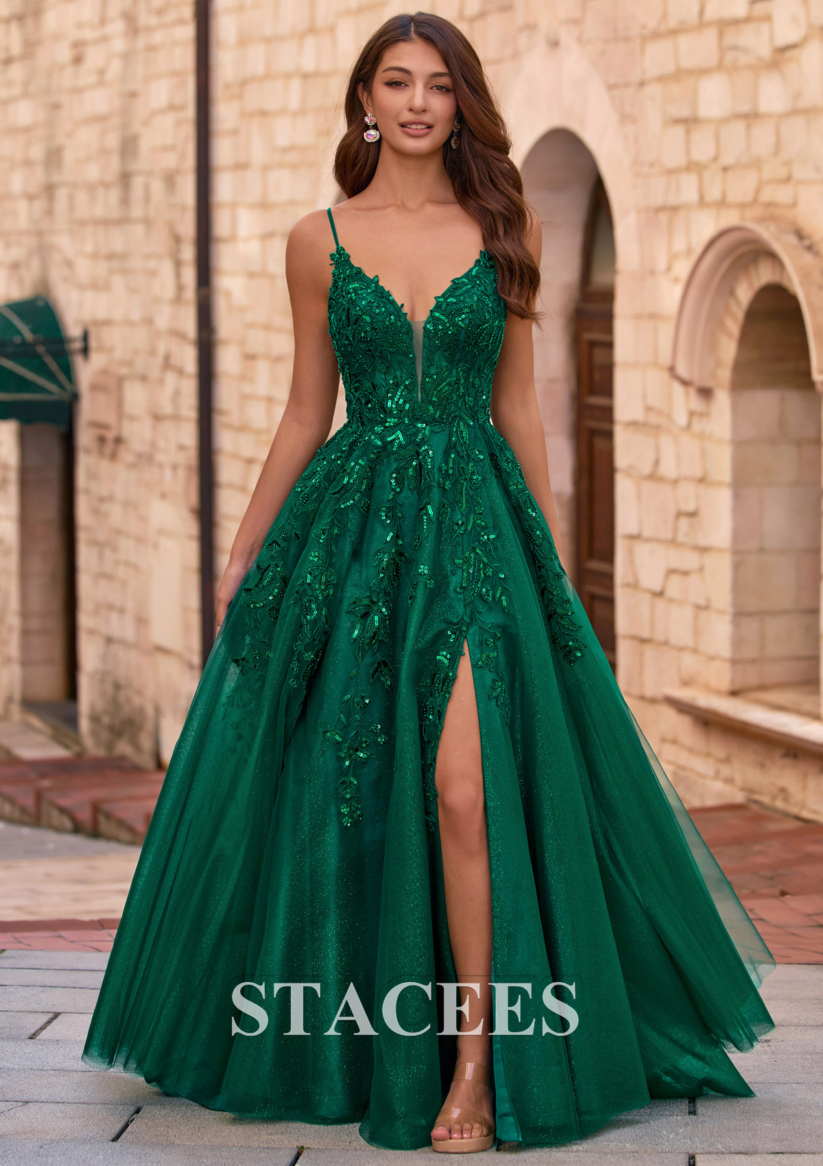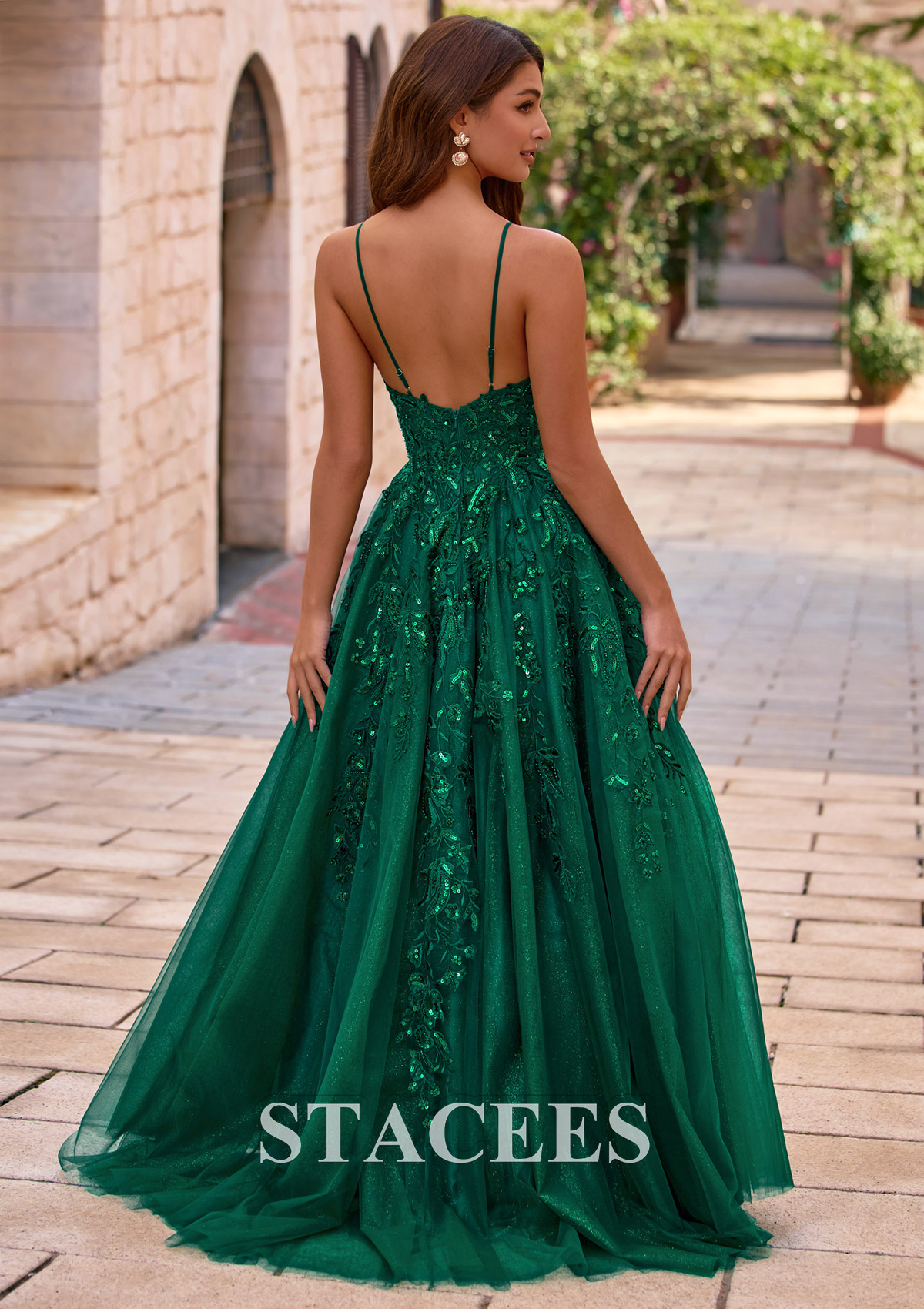 Step into luxury with this striking green prom dress, designed to make you the center of attention at any formal event. The gown showcases a stunning fitted bodice with a plunging V-neckline, adorned with intricate sequin embroidery and delicate 3D floral applique. Elegant spaghetti straps and a sheer inset add a modern touch to the classic ball gown silhouette. Crafted from a luxurious blend of glitter tulle and lining, the gown has a flowing, floor-length skirt with a dramatic horsehair hem and train.The voluminous tulle skirt features dazzling embellishments and a stylish front slit, offering a hint of allure and freedom of movement. From the back, the dress boasts a deep V-cut with slender straps and beautiful floral detailing, creating an enchanting look that’s captivating from every angle. Ideal for proms, galas, and evening occasions, this emerald green gown exudes glamour and sophistication, making you feel like royalty. The combination of glowing sequins, rich color, and elegant design ensures you’ll shine all night long.