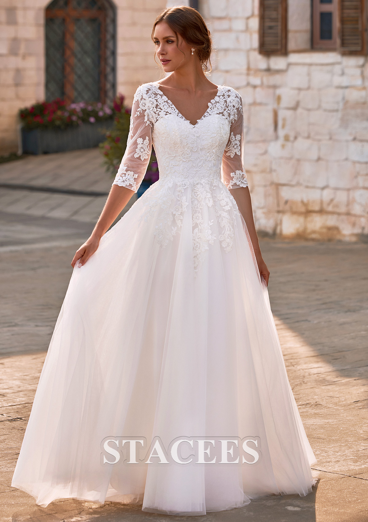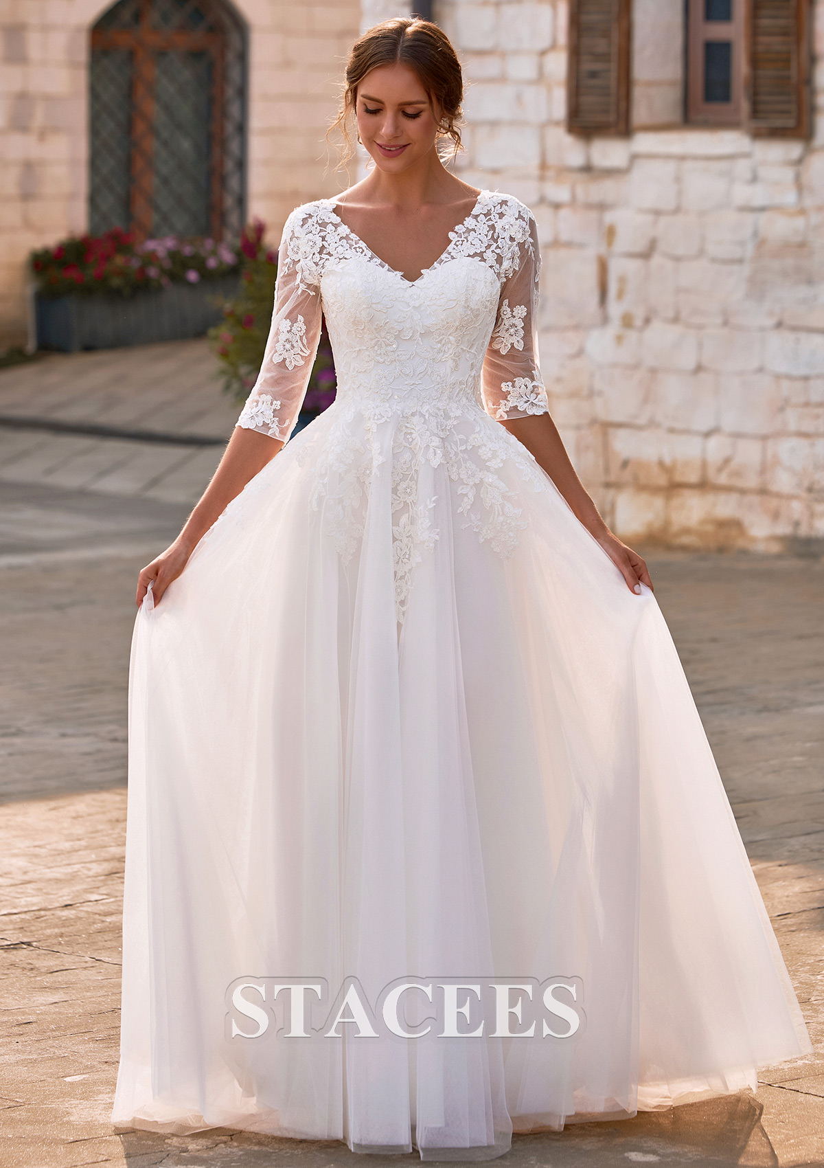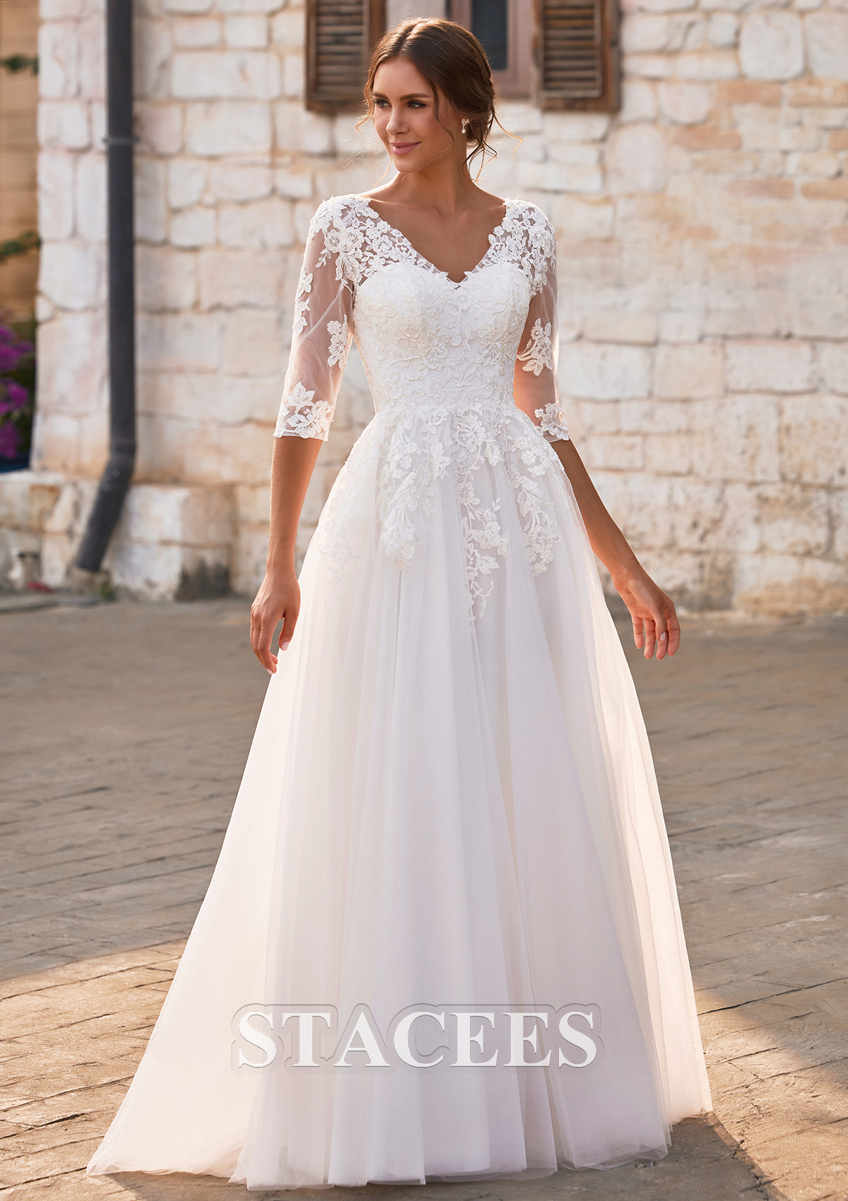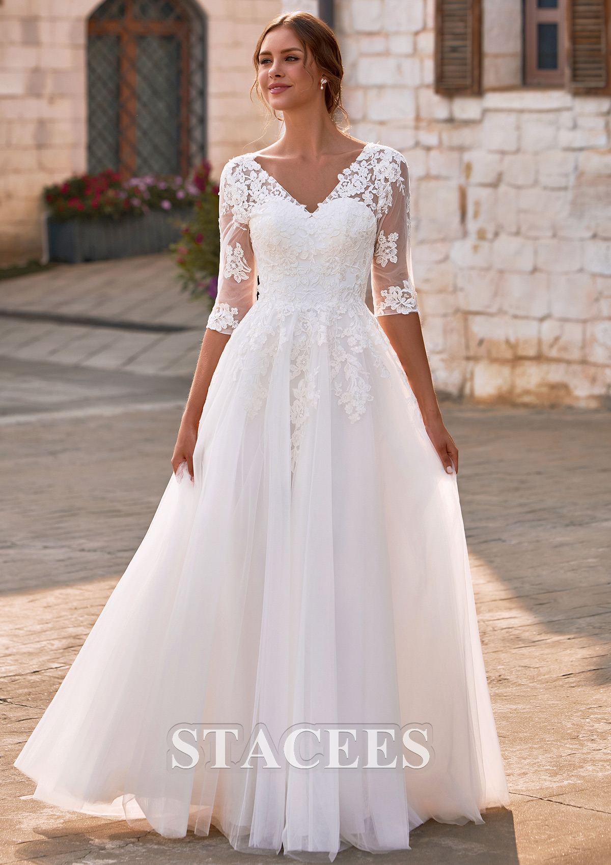 Flowing into a dreamy, floor-length tulle skirt, this A-line wedding gown moves effortlessly with every step, offering airy lightness, graceful volume, and romantic movement. A flattering V-neckline is beautifully framed with intricate floral lace appliques, creating a soft yet defined decolletage. The structured bodice is adorned with refined floral lace appliques that cascade naturally from the neckline through the waist, sculpting a feminine and flattering silhouette. Sheer illusion sleeves add a hint of vintage-inspired charm, while the semi-sheer lace back with a concealed zipper closure ensures a polished and seamless finish from every angle. Soft layers of tulle create an ethereal, floating effect, making this gown an exquisite choice for outdoor garden weddings, rustic venues, church ceremonies, and elegant estate celebrations.