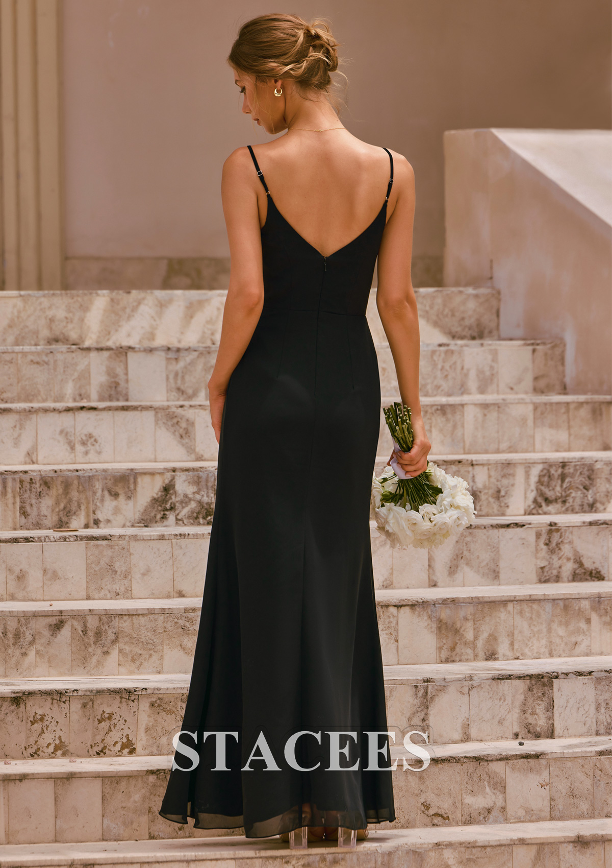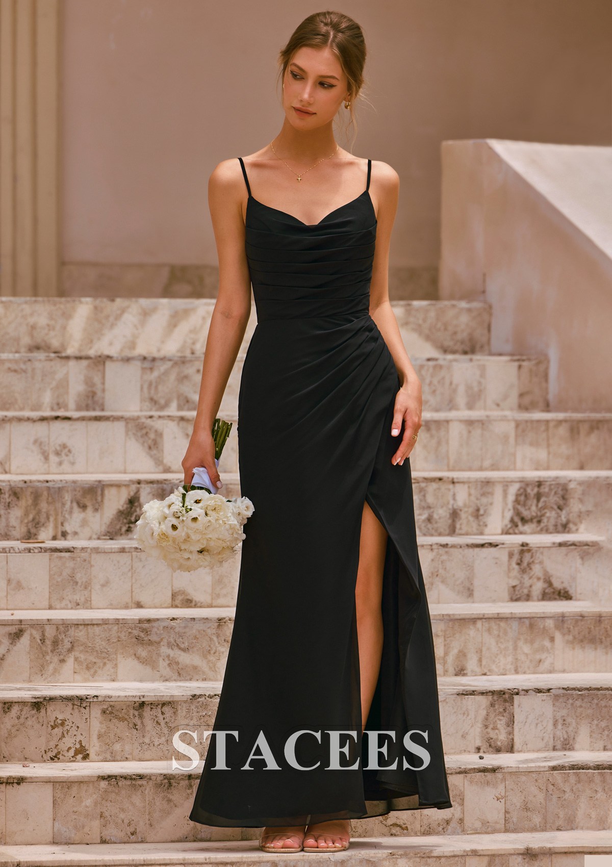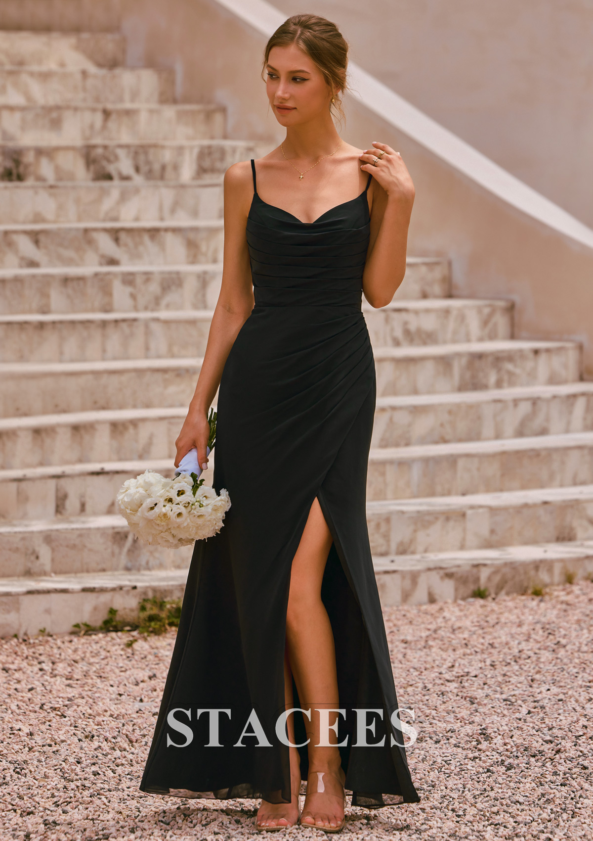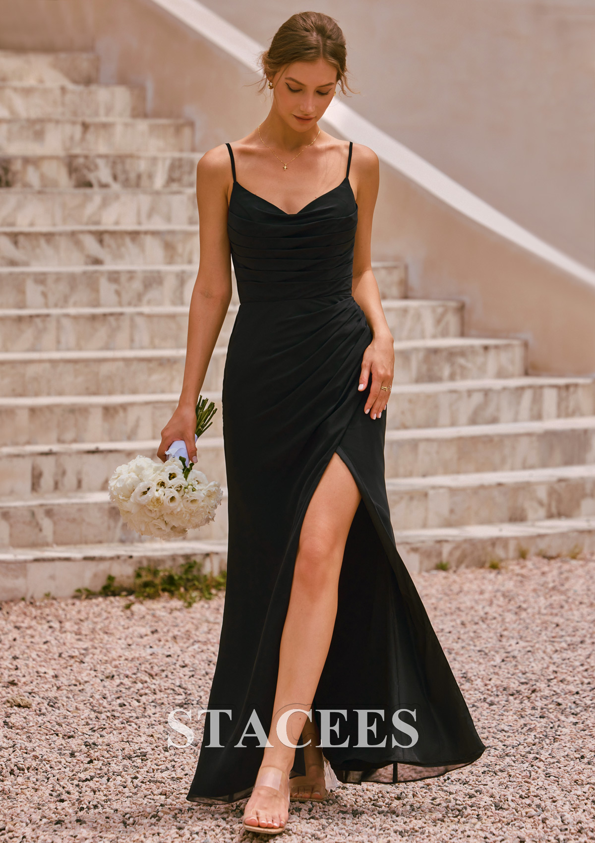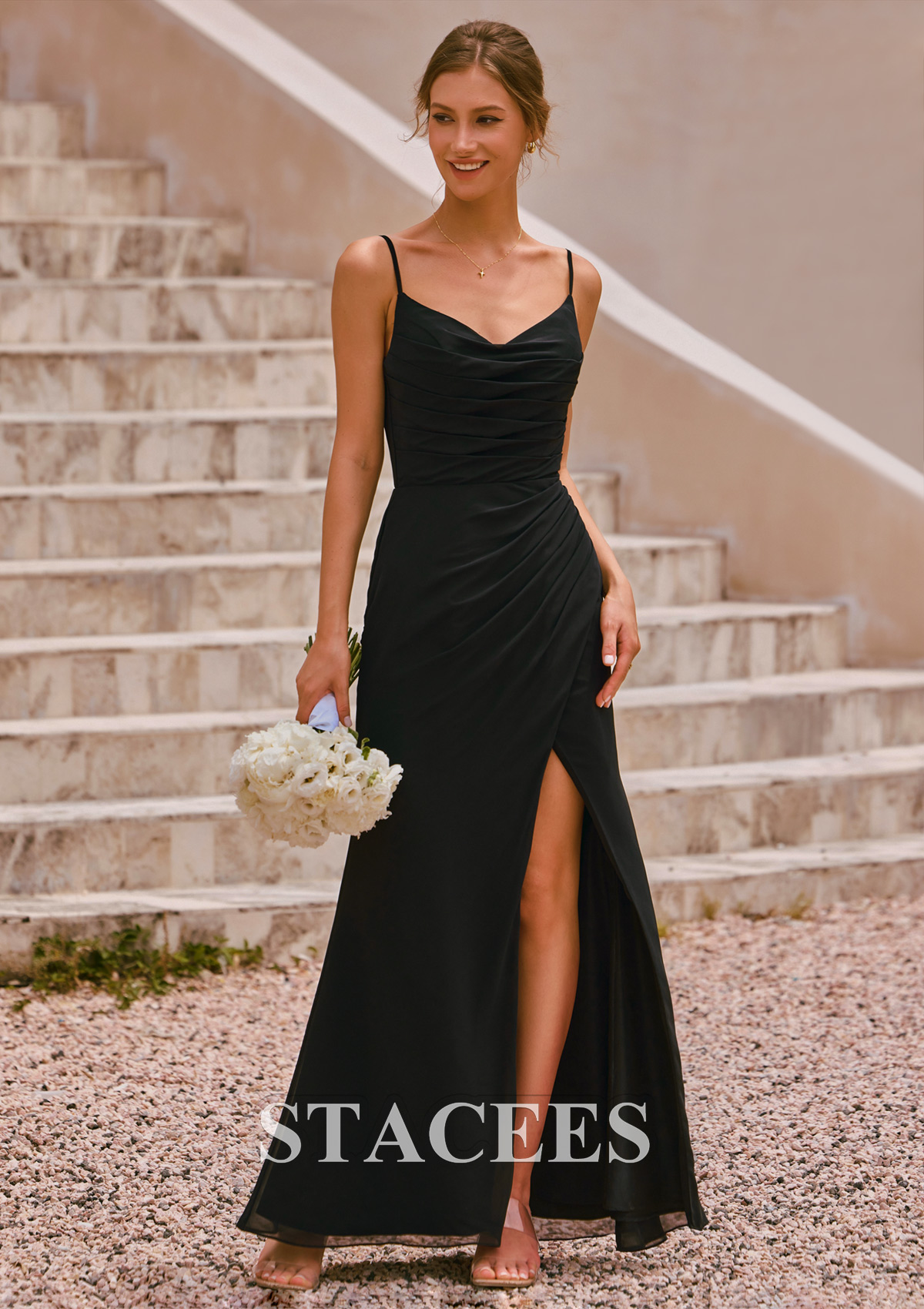 This elegant and alluring bridesmaid gown features a timeless sheath or column silhouette that flatters the figure. Crafted from a flowy chiffon fabric, it offers a lightweight and comfortable feel. The dress showcases a sophisticated draped cowl neckline and delicate spaghetti straps. The bodice includes subtle ruching or pleating details at the hips that enhance the natural waistline. The floor-length skirt boasts a daring, thigh-high front slit, adding a modern touch and ensuring effortless movement. The back design is clean and simple, featuring a zipper closure. This versatile gown is the perfect choice for weddings, formal events, or special occasions. Perfect for bridal parties seeking a classic yet contemporary look, this backless bridesmaid dress combines style, elegance, and versatility for every special moment.