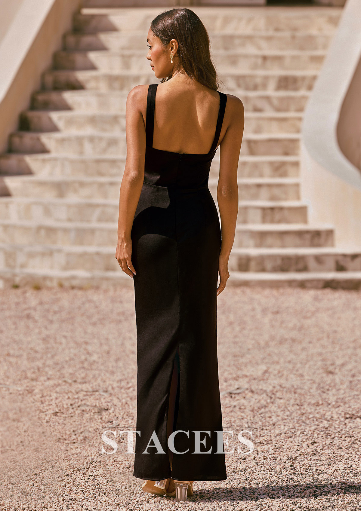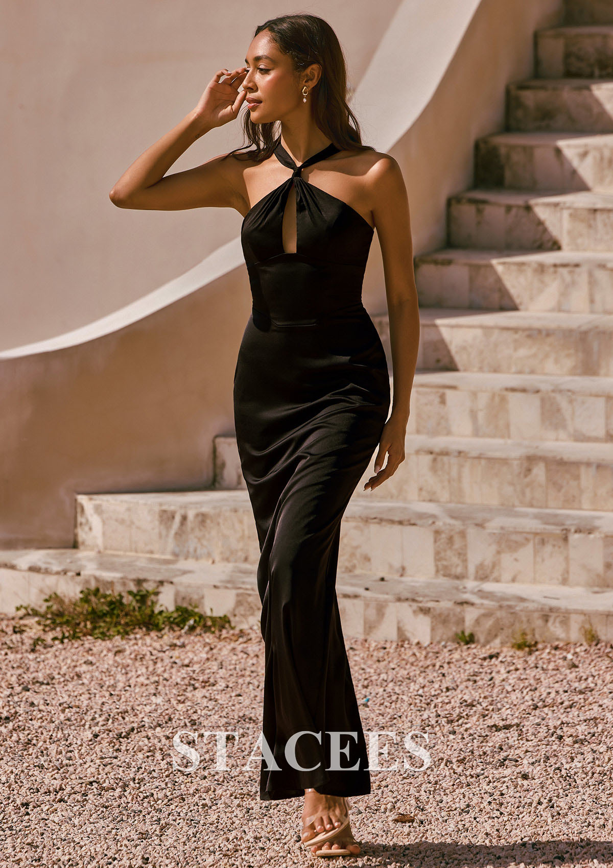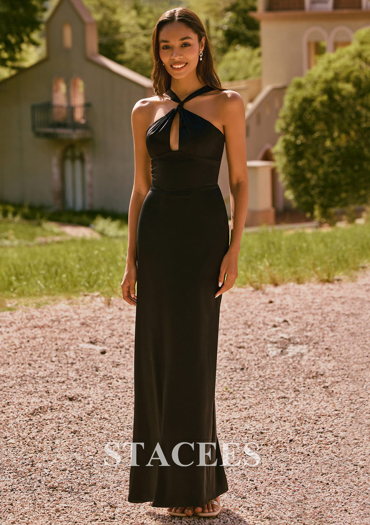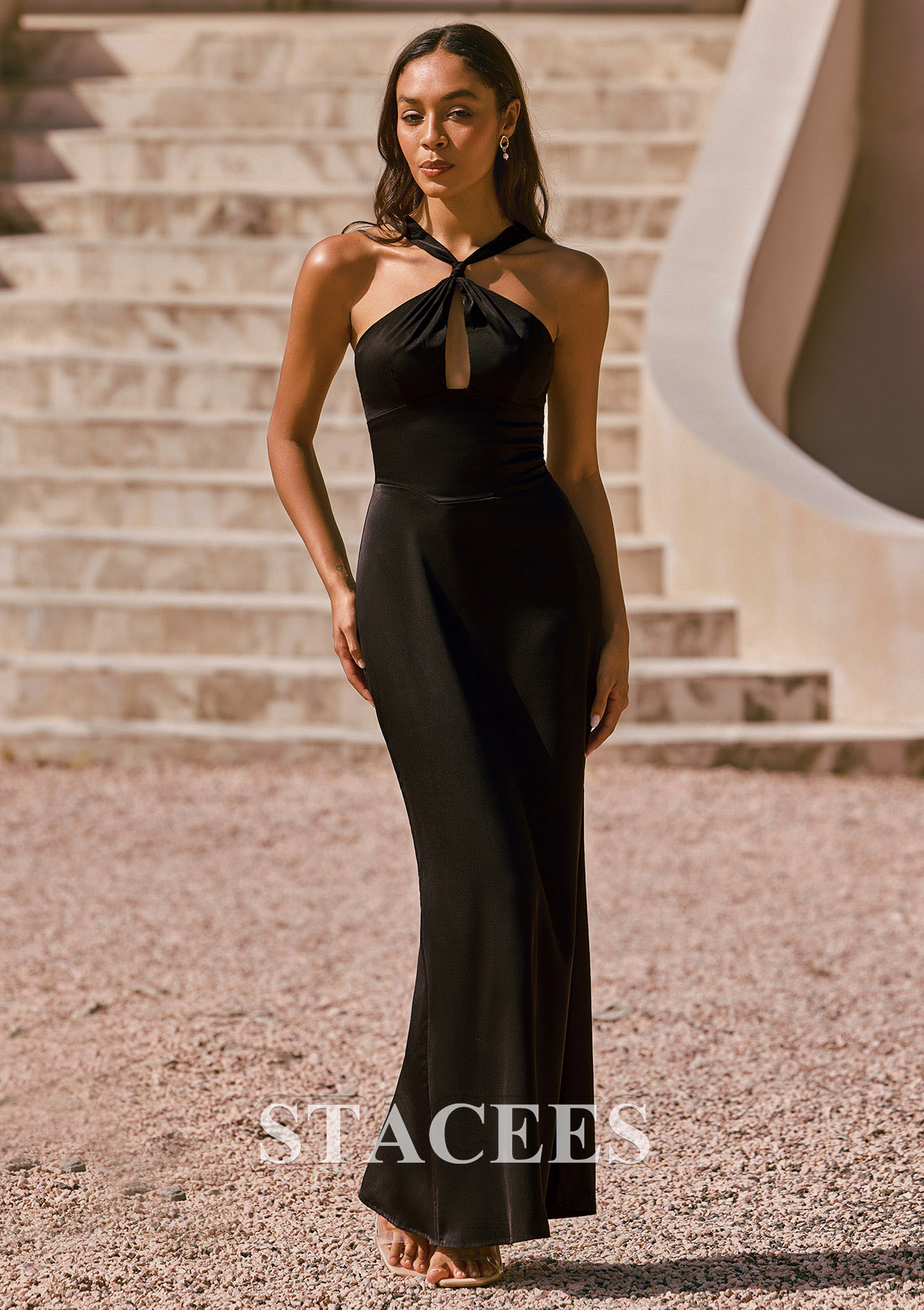 This elegant bridesmaid dress features a sleek and sophisticated stretch satin fabric that exudes timeless charm. The front showcases a stylish halter neck with a keyhole cutout, adding a vibe of allure and modernity. The fitted bodice accentuates the waist, flowing seamlessly into a floor-length skirt with a tasteful slit at the back for ease of movement and a hint of charm. The back of the dress is designed with wide straps and a zipper closure, maintaining a clean and polished look. Perfect for formal occasions or special celebrations, this long sheath bridesmaid dress combines classic elegance with contemporary details, making it an excellent choice for bridesmaids.