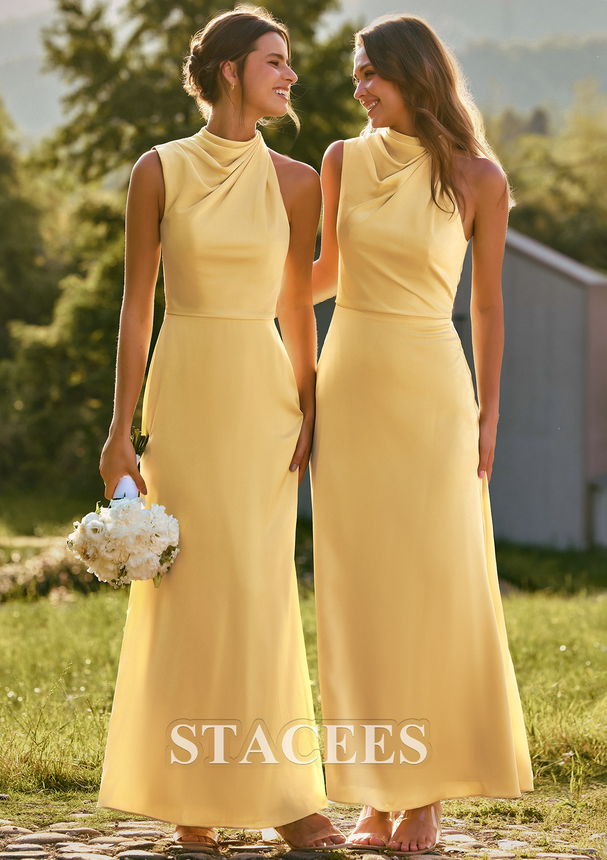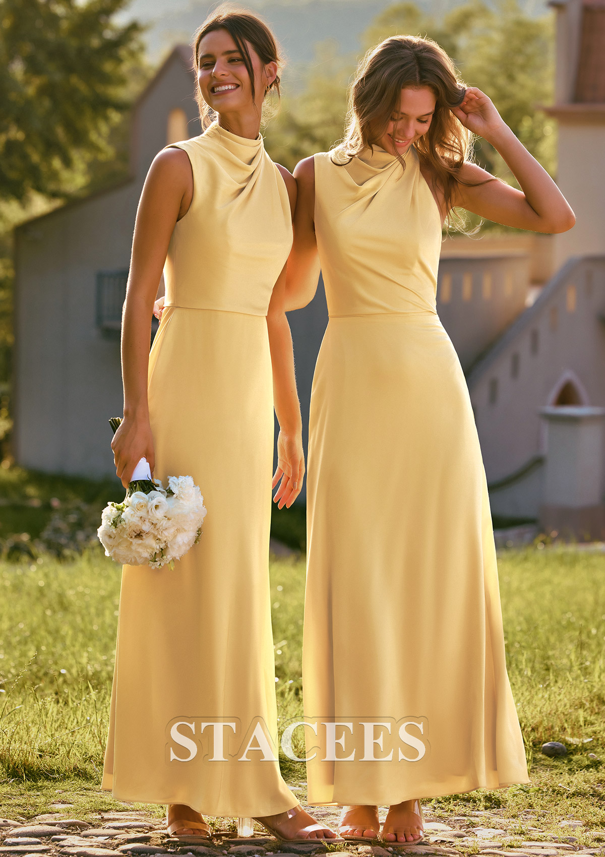 These bridesmaid dresses feature a soft, elegant stretch satin fabric that glows beautifully in natural light. The design showcases a sophisticated high neckline with graceful draping across the chest for a chic, modern silhouette. Sleeveless and fitted at the waist, the gown falls in a smooth, floor-length skirt, creating a sleek and timeless look. The back reveals a gentle keyhole detail and a clean zip closure, maintaining a streamlined finish. Perfect for outdoor weddings or summer celebrations, these dresses balance understated style with a joyful, radiant presence, making them an ideal choice for a bridal party.