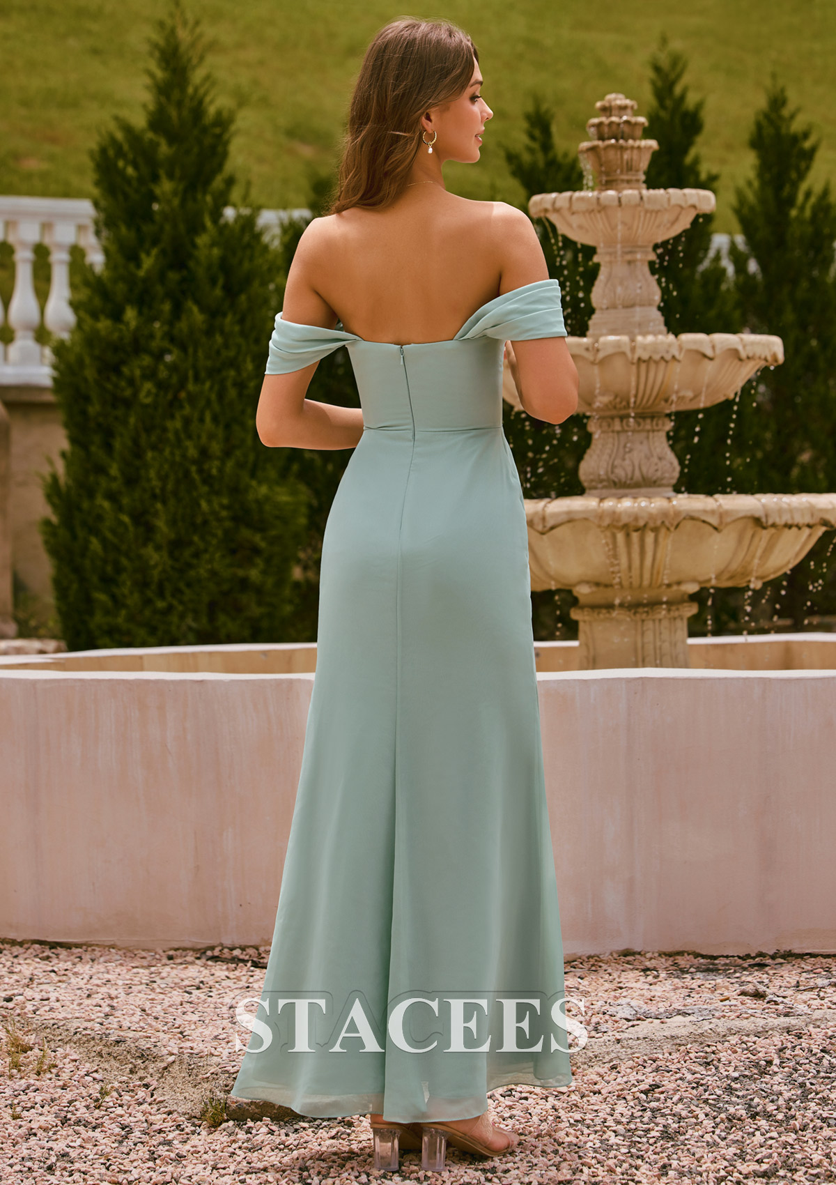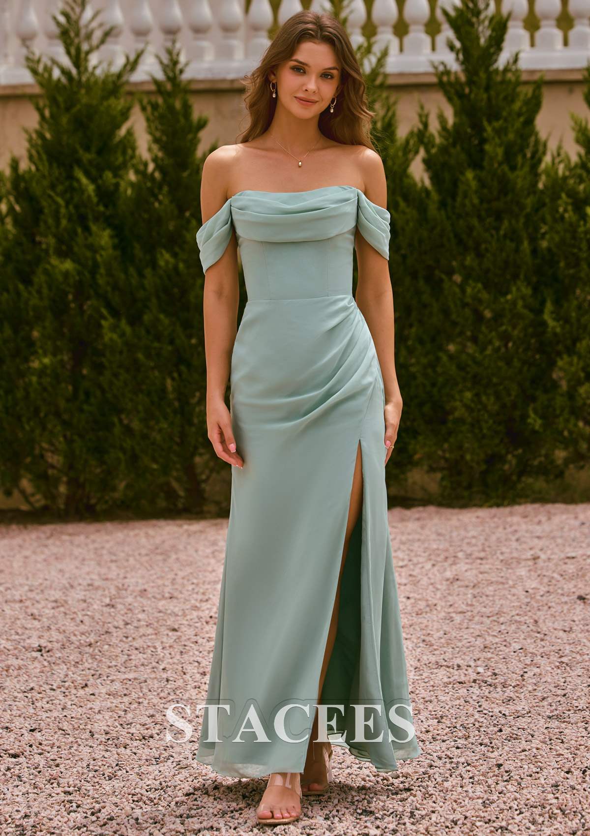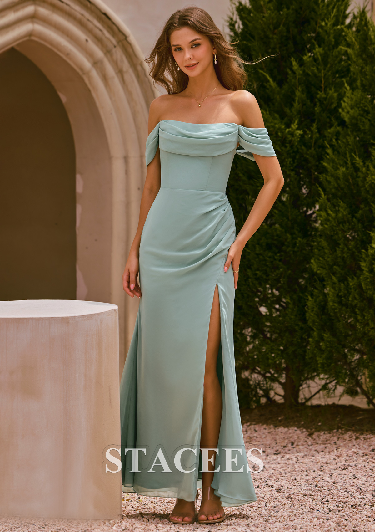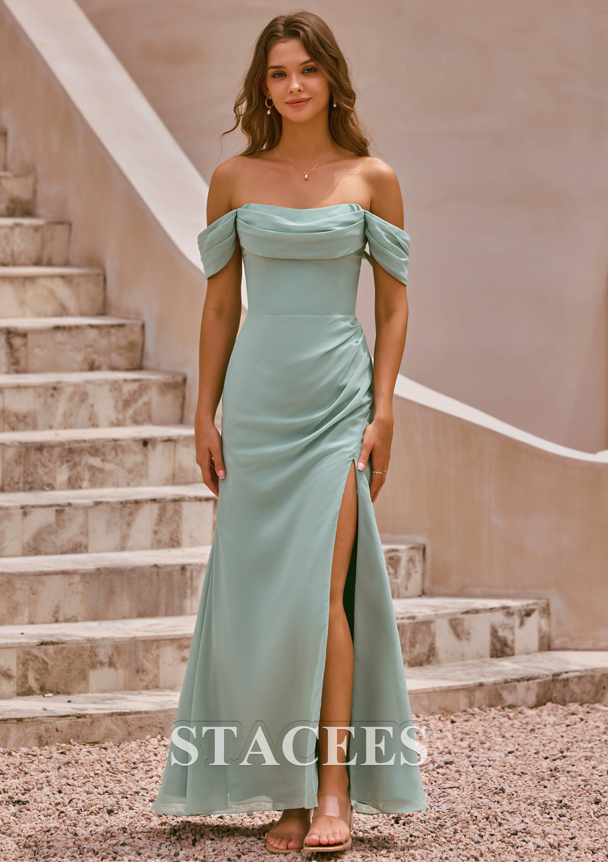 This elegant chiffon bridesmaid dress features a soft color hue and a flattering off-the-shoulder neckline with gently draped layers that create a romantic, feminine look. The bodice is smooth and fitted, flowing into a gently ruched waist that adds subtle texture and enhances the silhouette. A thigh-high front slit gives the floor-length skirt graceful movement and a modern touch, while the back showcases a clean, structured finish with a concealed zipper. The lightweight fabric and timeless design make this gown perfect for weddings, formal events, and outdoor ceremonies.