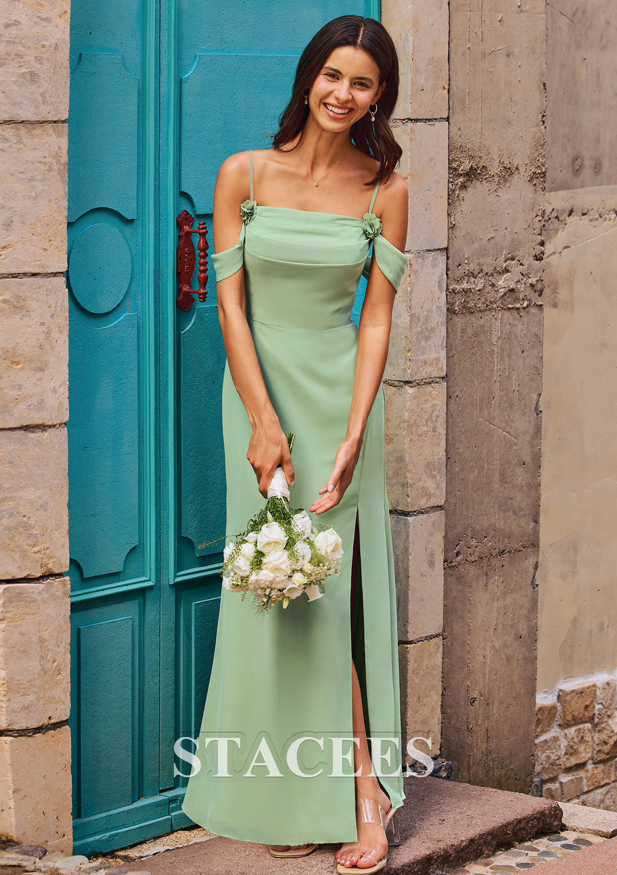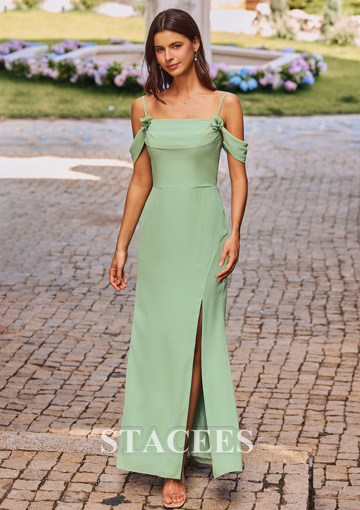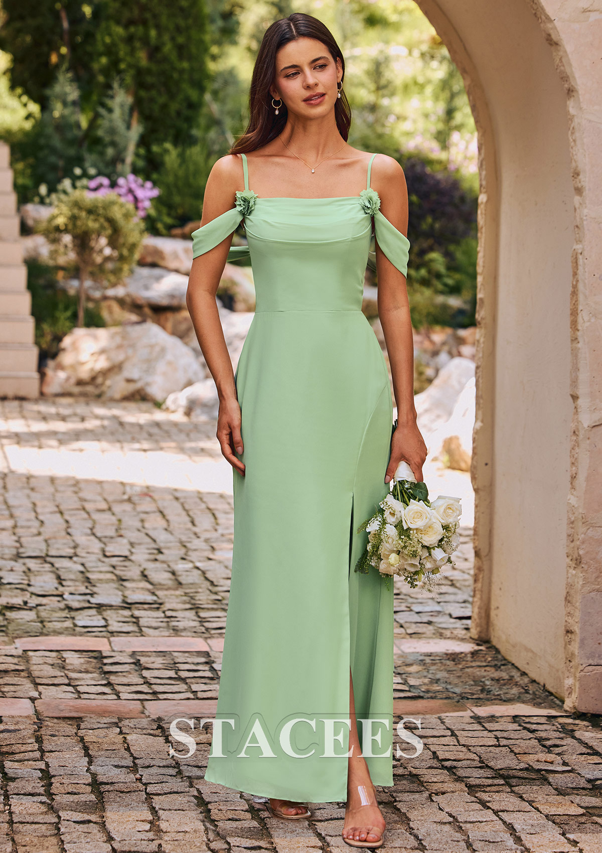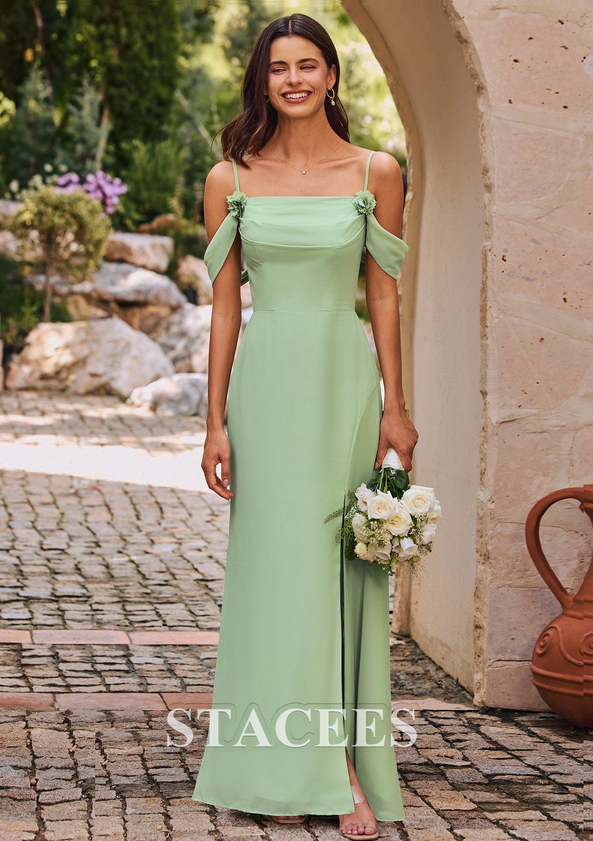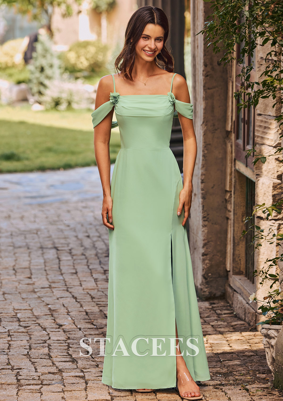 This stunning bridesmaid dress showcases a soft, light green hue and features delicate spaghetti straps paired with off-the-shoulder sleeves, elegantly gathered at the arms with chic floral embellishments. The fitted bodice gracefully transitions into a slightly flared, floor-length skirt, highlighted by a tasteful front slit for ease of movement and contemporary style. From the back, the dress offers a low-cut design and closes with a subtle zipper, creating a refined and streamlined silhouette. Perfect for outdoor or rustic-themed weddings, this dress combines modern sophistication with charming details, making it a memorable choice for any bridal party.