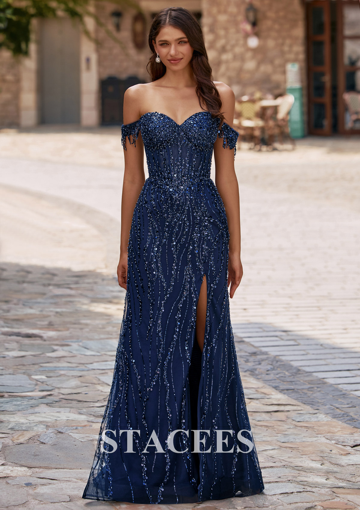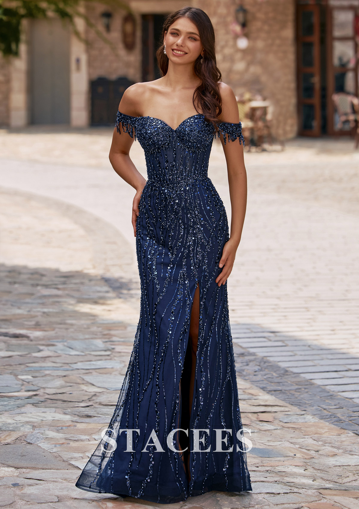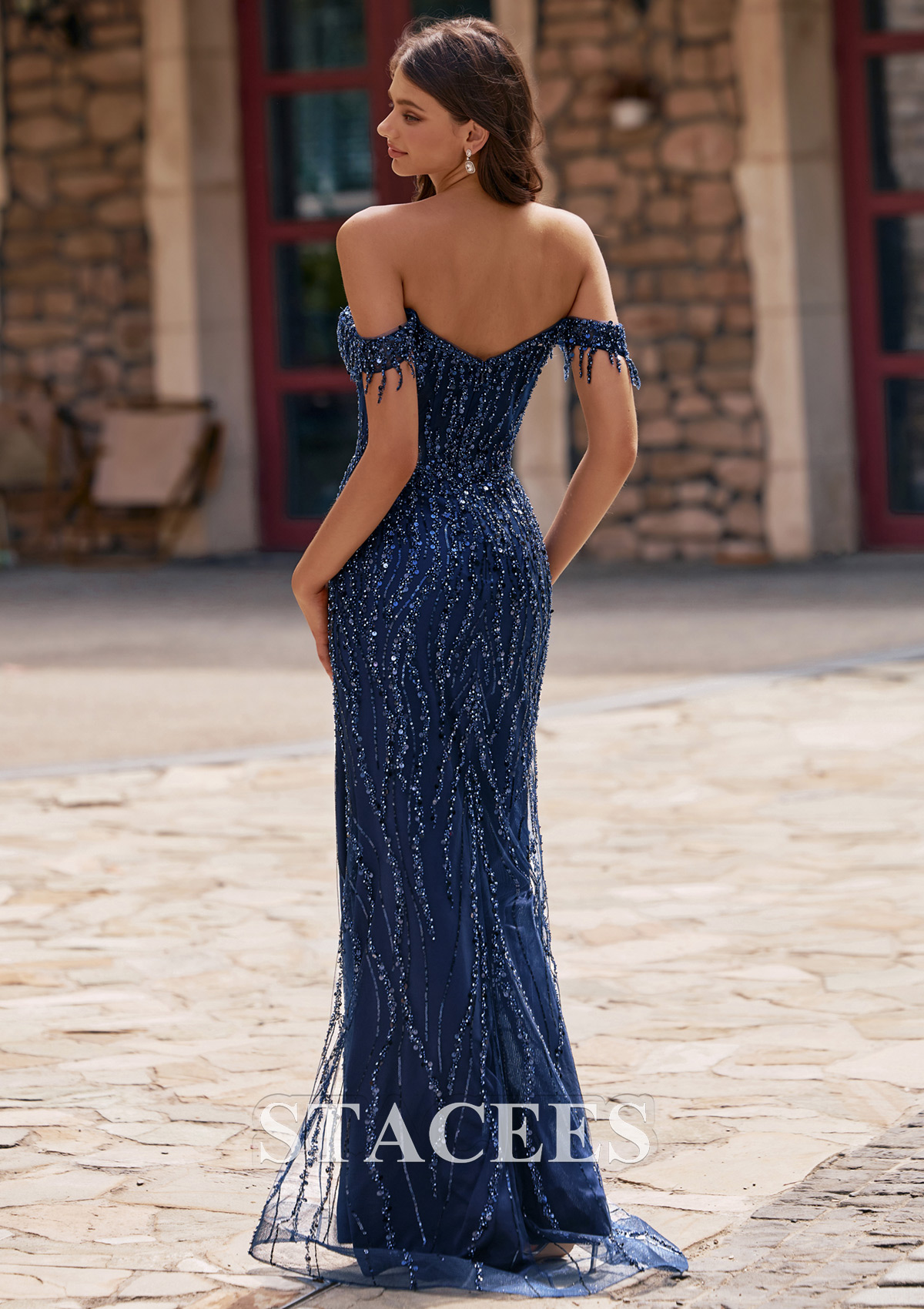 Grace the night in this breathtaking prom gown designed for a dramatic entrance. This off-the-shoulder dress features a sweetheart neckline and delicately draped sleeves adorned with sparkling beaded fringe. The fitted bodice is fully embellished with an intricate pattern of tonal sequins and beads, creating a stunning, light-catching effect from every angle. The gown slim silhouette hugs the figure, while the front is finished with a tasteful high slit for added glamour and ease of movement. The back mirrors the detailed beadwork of the front and gracefully frames the shoulders, cascading down into a sweep train. Set against a rustic outdoor backdrop, this gown is the perfect choice for prom, galas, or any formal event where elegance and sophistication are a must.
