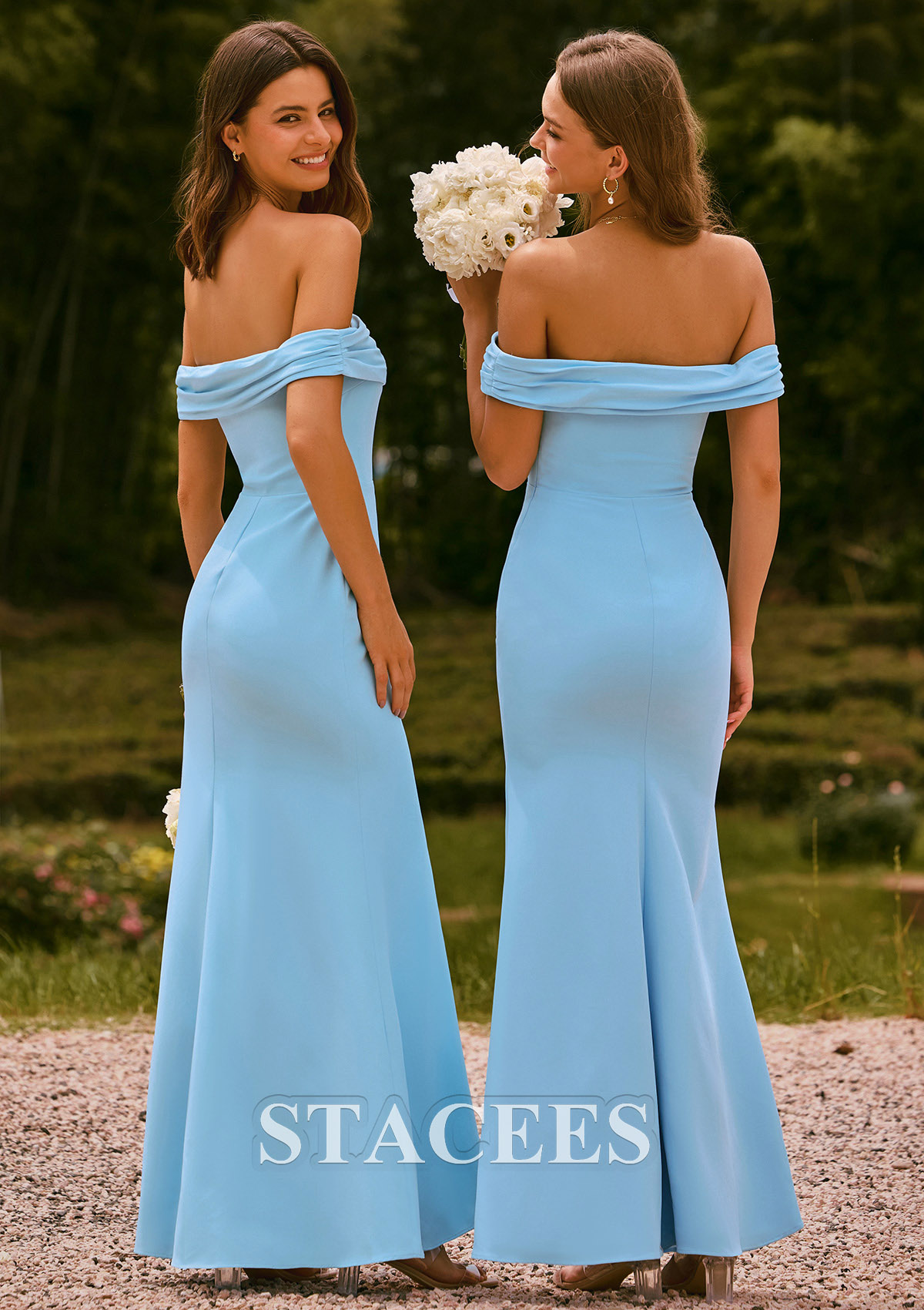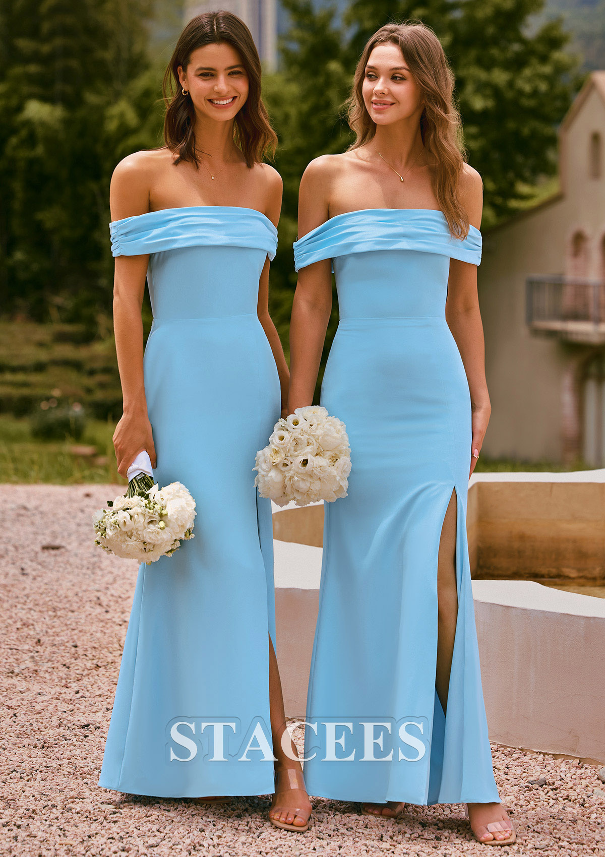 This elegant slim bridesmaid gown features a timeless off-shoulder neckline with softly draped bands that highlight the shoulders and collarbone. The dress is crafted from a smooth, form-fitting fabric that gracefully contours the body before flowing into a long, subtly flared skirt. A thigh-high side slit adds a modern, feminine touch, offering both comfort and sophistication. The back mirrors the clean, seamless design, creating a polished and flattering silhouette perfect for weddings, formal events, and evening occasions.