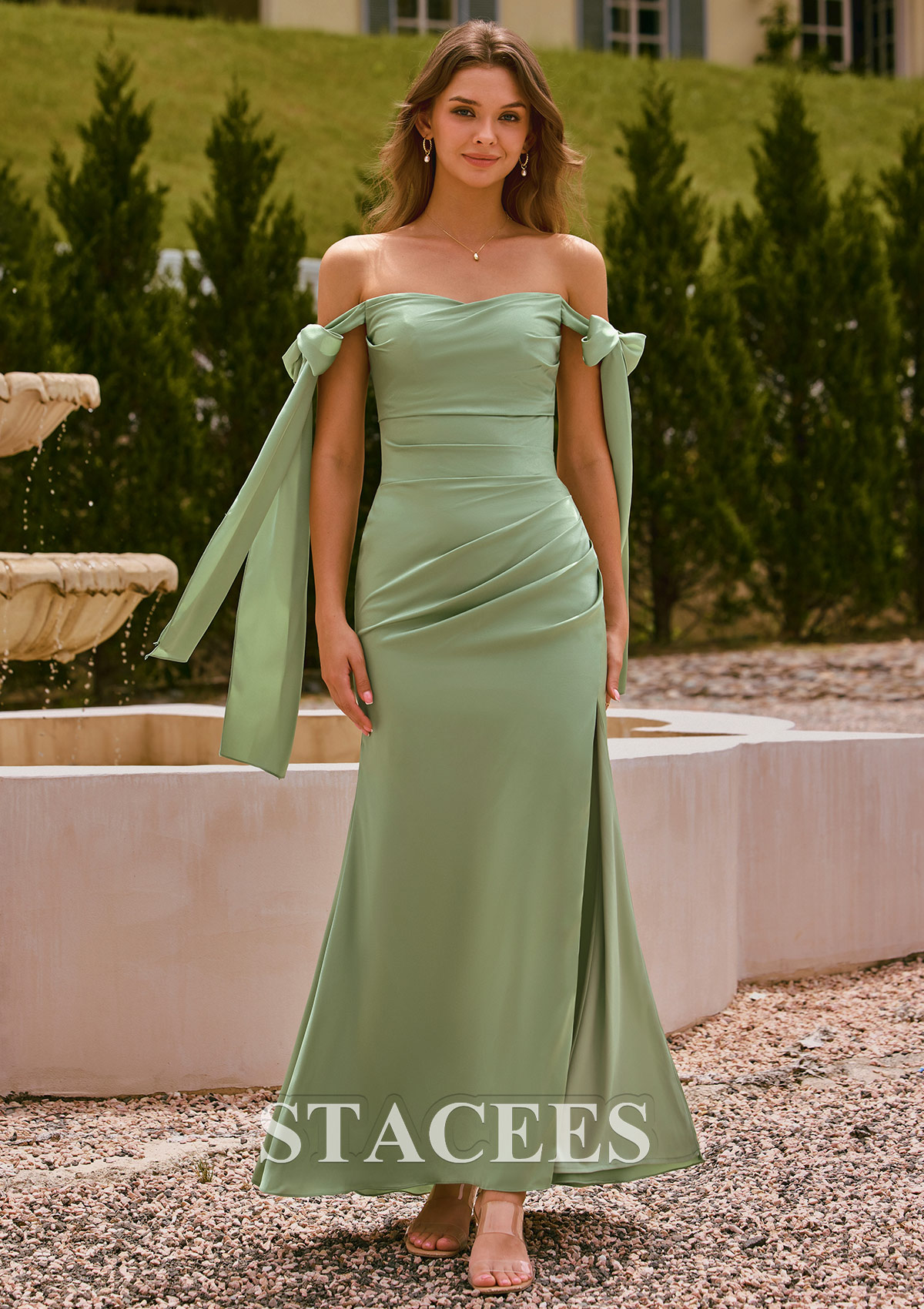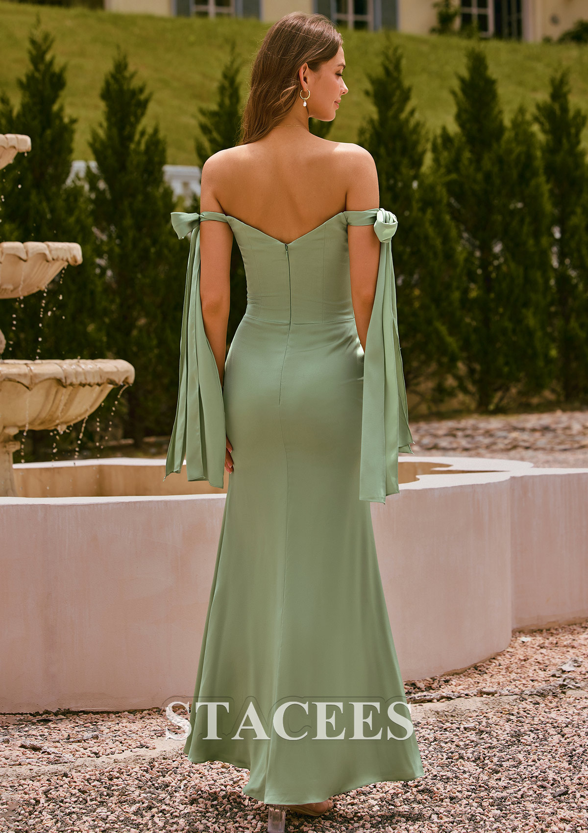 Off-the-Shoulder Stretch Satin Ruched Maxi Slit Bridesmaid Dress with Tie Straps S6106BA- Bridesmaid Dresses - Stacees