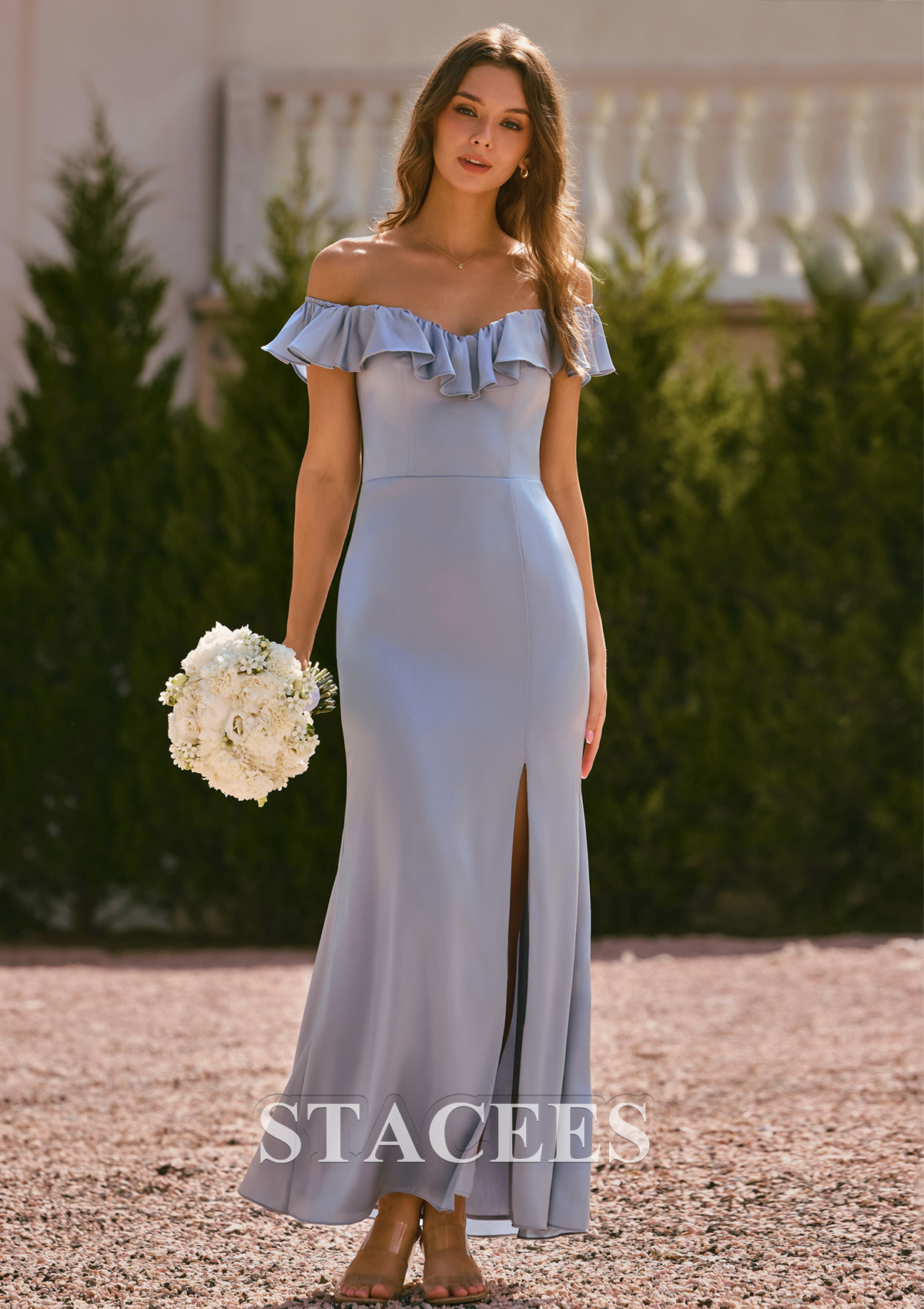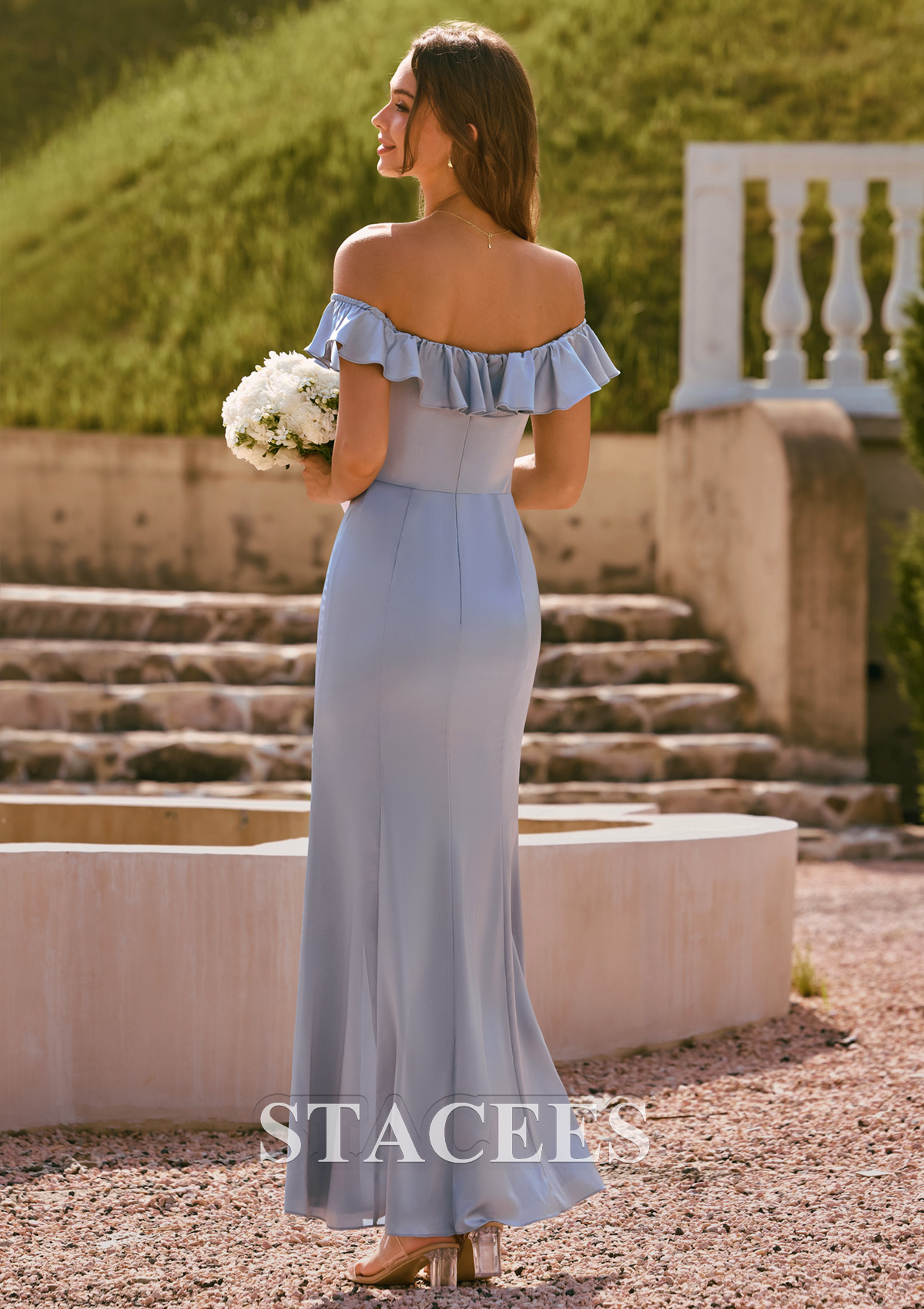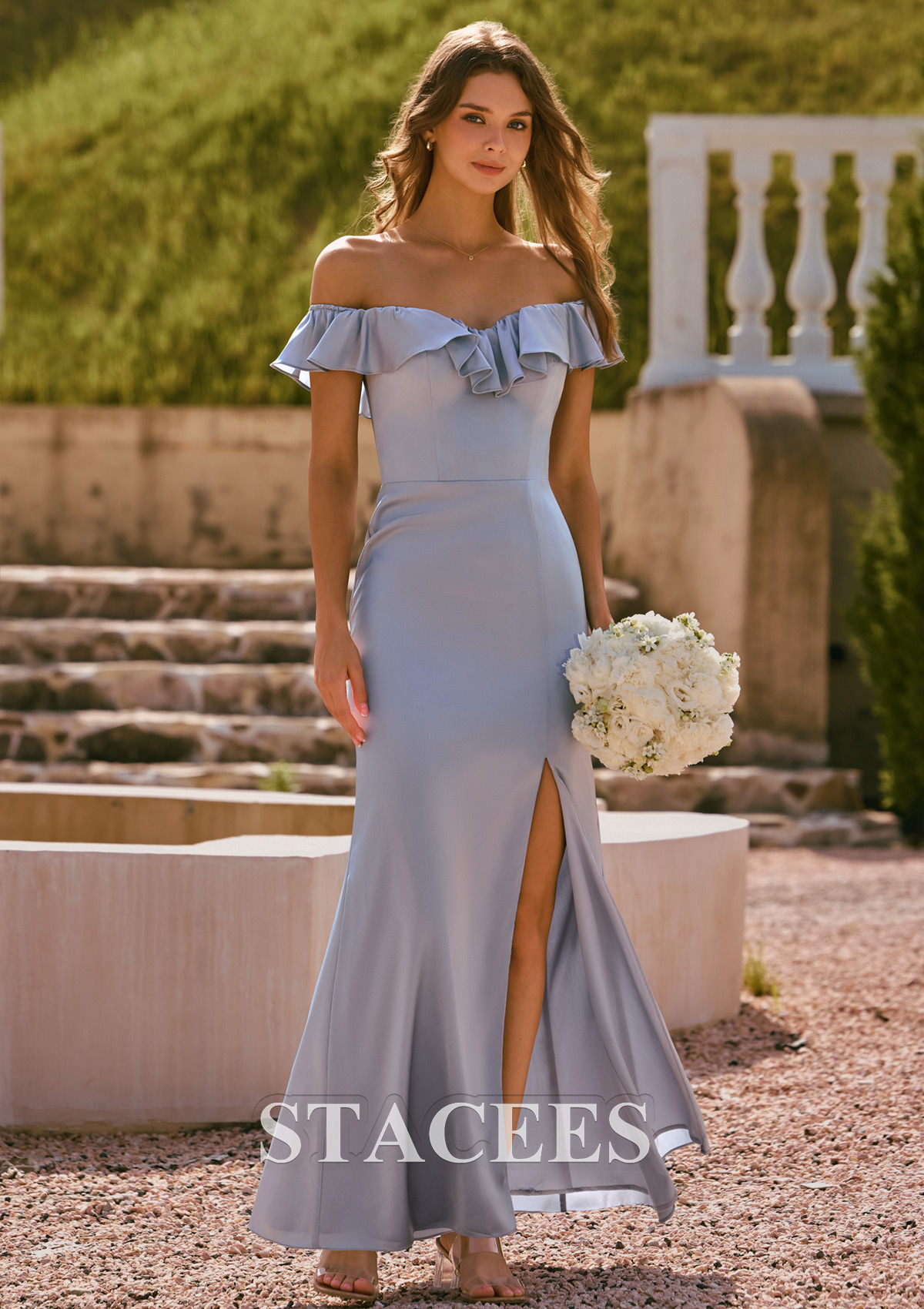 Fitted Ruffle Off‑the‑Shoulder Stretch Satin Bridesmaid Dress with Thigh‑High Slit Floor‑Length Wedding Party Gown S6129B - Bridesmaid Dresses - Stacees