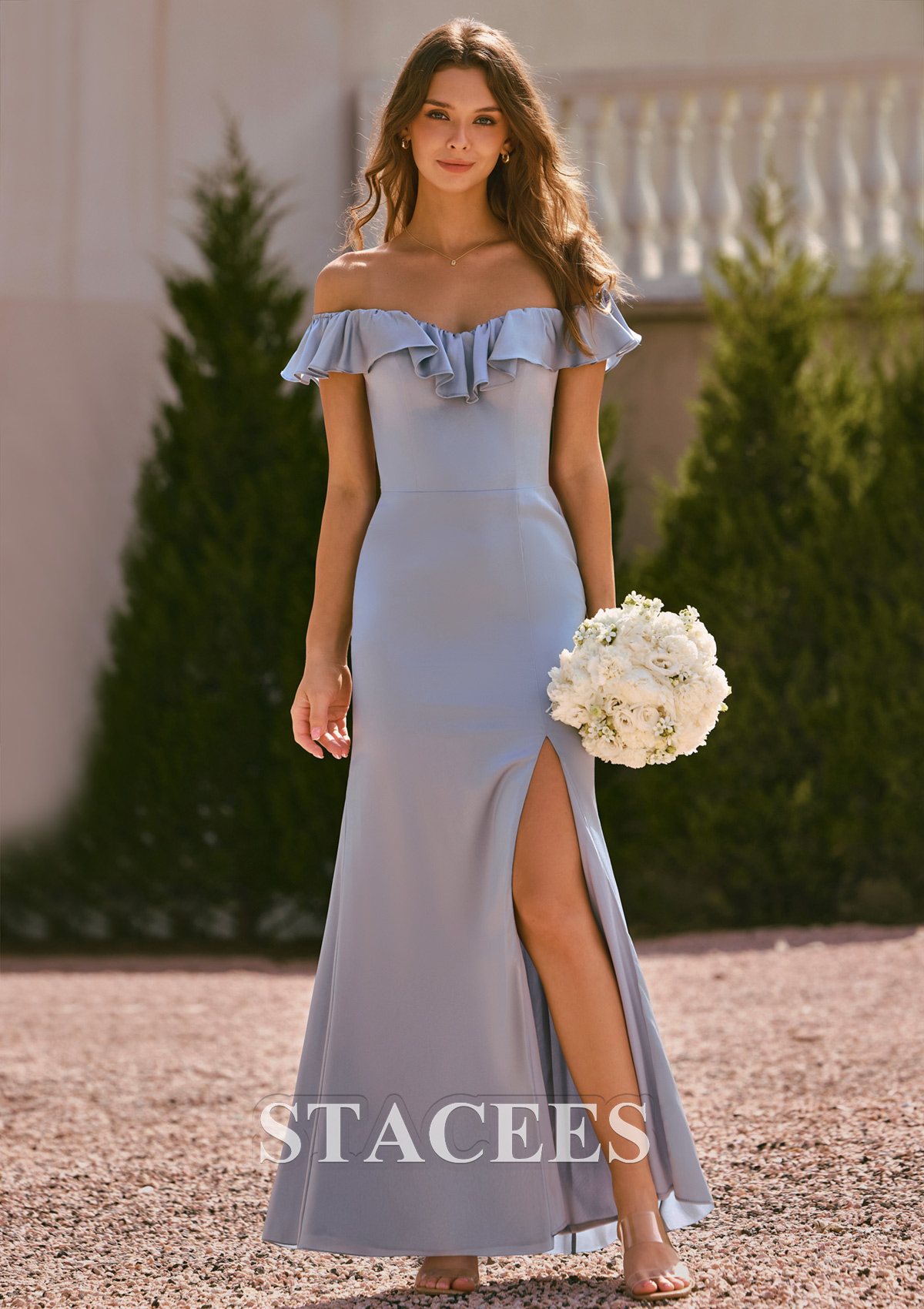 Bring soft romance and modern glamour to your bridal party with this ruffled off‑the‑shoulder bridesmaid dress from Stacees. The gown features a sweetheart‑style neckline with flirty ruffle overlay that drapes off the shoulders, beautifully highlighting the collarbone and shoulders while adding a touch of softness around the bust. The smooth, fitted bodice defines the waist and hips, creating a sleek, feminine silhouette that flatters many body types. A chic thigh‑high side slit adds movement and a hint of sexiness, making the dress perfect for walking, posing for photos, and dancing comfortably at the reception. The floor‑length skirt falls in a gentle A‑line from the hips, balancing the fitted upper body and giving the gown an elegant, elongated look. The back of the dress is clean and streamlined, ensuring a polished appearance from every angle during the ceremony. The light color shade is ideal for spring and summer weddings, beach ceremonies, garden venues, and modern romantic themes. Easy to style with nude or silver heels, delicate jewelry, and white or pastel bouquets, this Stacees bridesmaid dress creates a cohesive, high‑end look for your entire wedding party and can be reworn to other formal events.