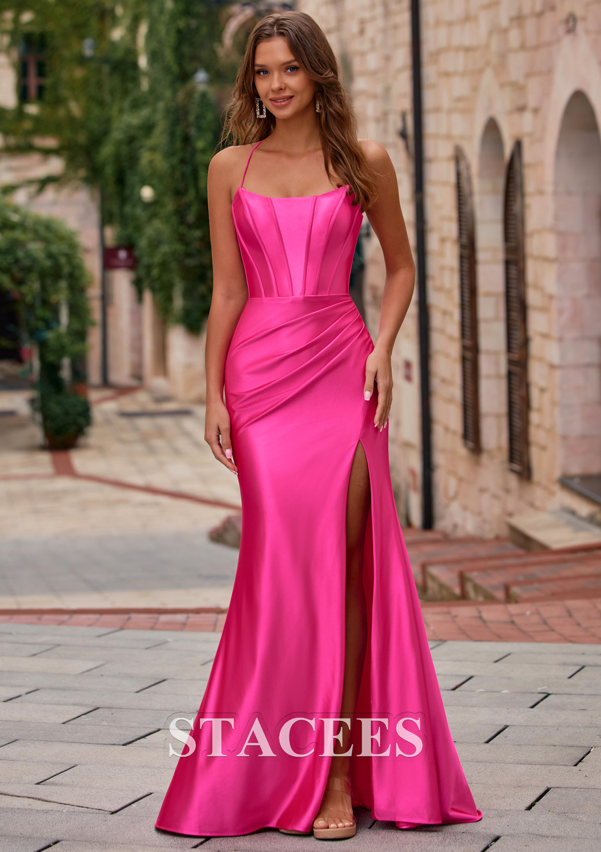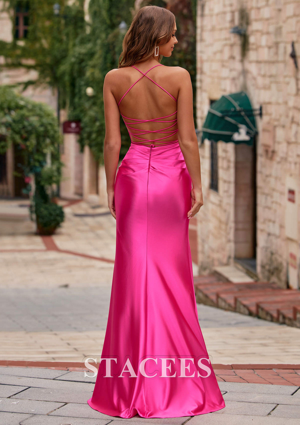 Make a bold entrance at prom in this stunning hot pink silk-like satin evening gown. Featuring a figure-flattering corset bodice with delicate spaghetti straps, this dress offers timeless elegance and modern flair. The feature of the dress is the regular diagonal elegant ruching designed between the slit and the waistline.The sleek, fitted silhouette flows into a dramatic thigh-high slit, perfect for showcasing your legs and adding a touch of allure. The standout feature is the open back with eye-catching crisscross strappy detailing, creating an unforgettable look from every angle. Crafted from luxe satin, this floor-length gown drapes beautifully and shines under the lights, making it ideal for prom, formal events, or any special occasion where you want to turn heads.