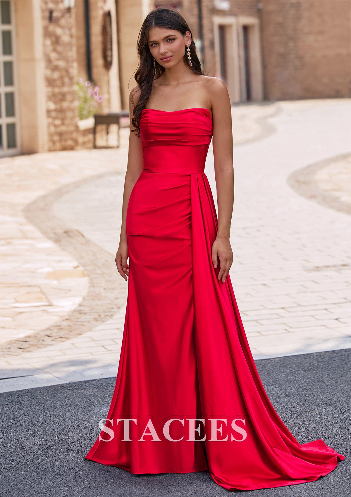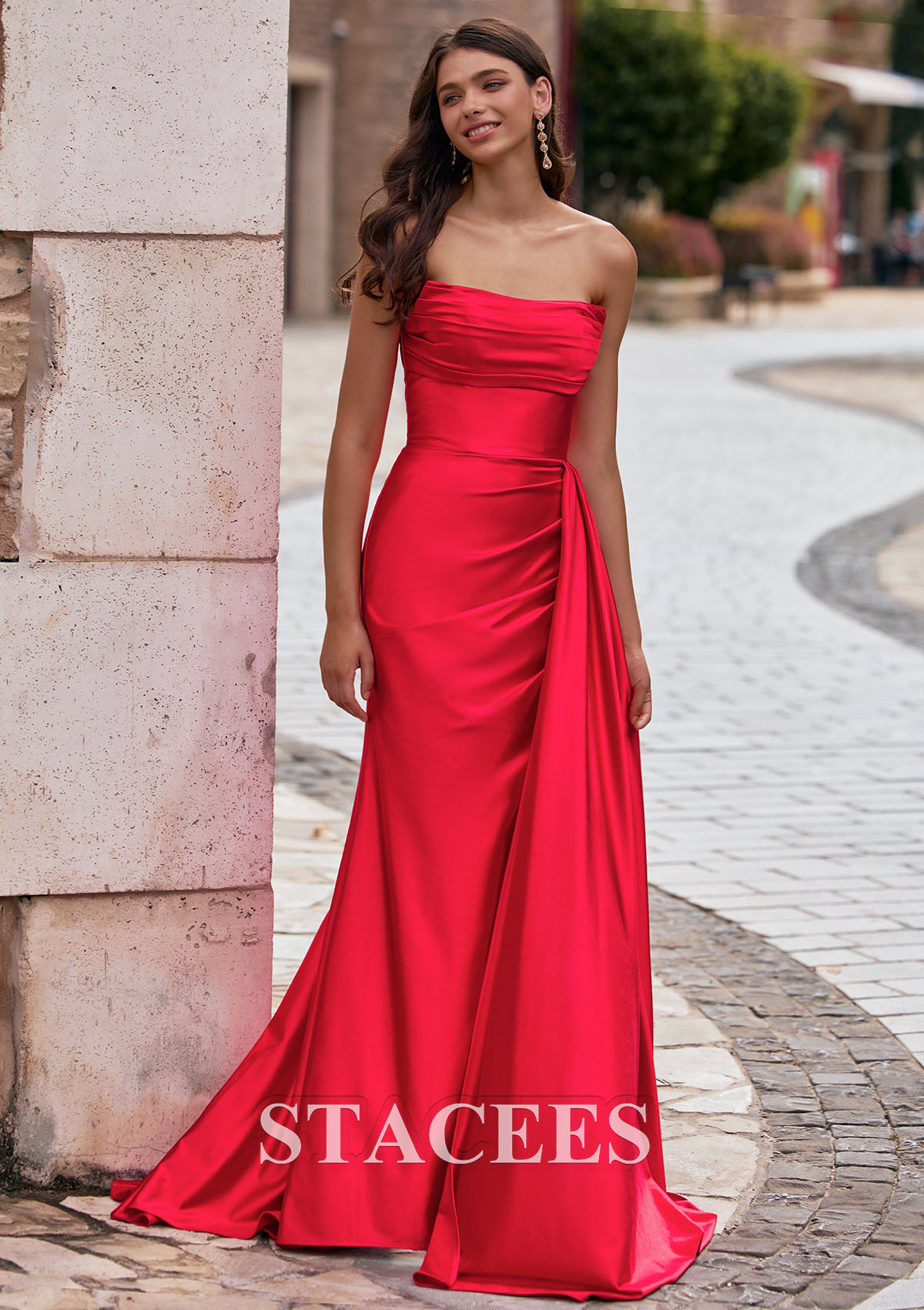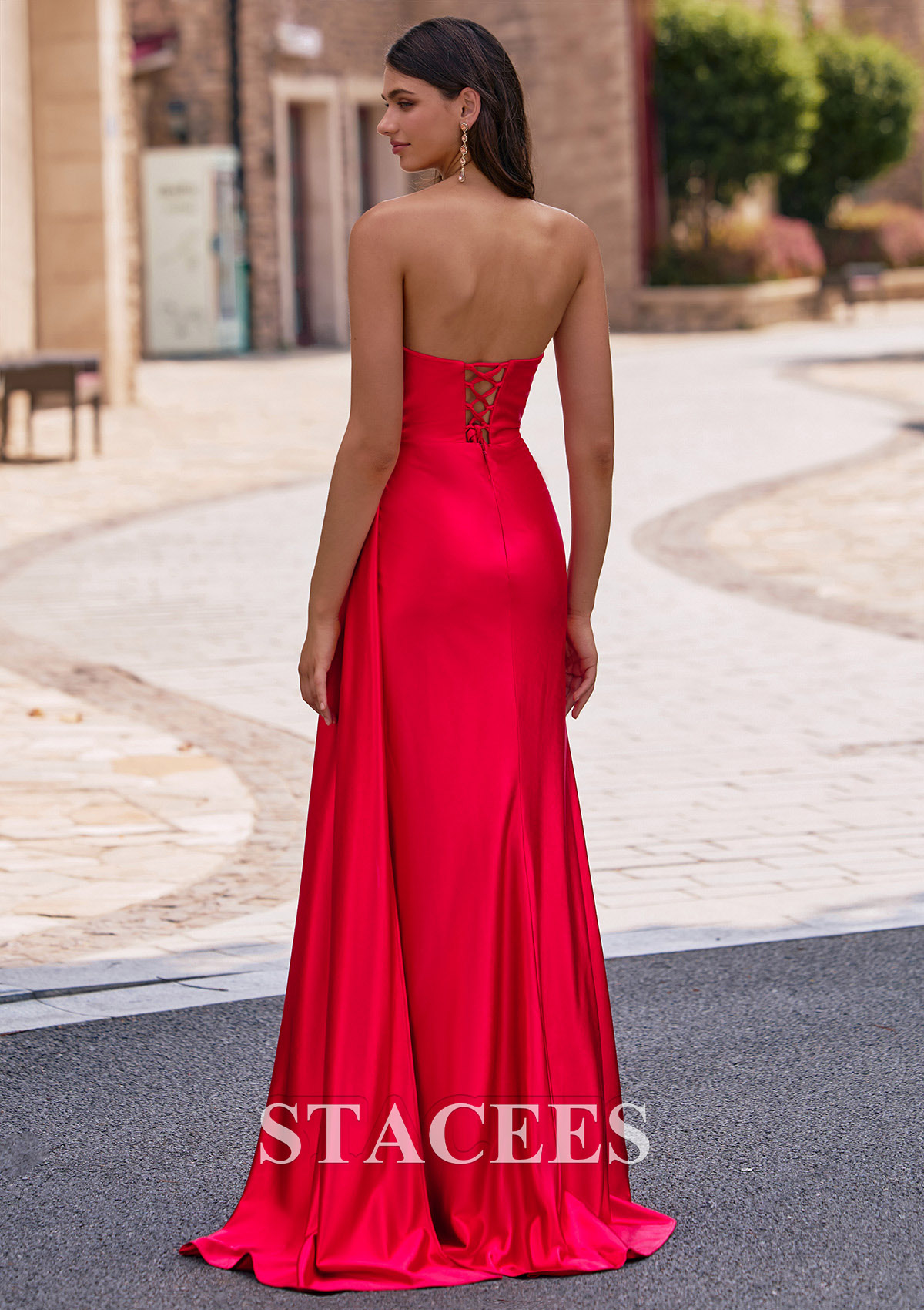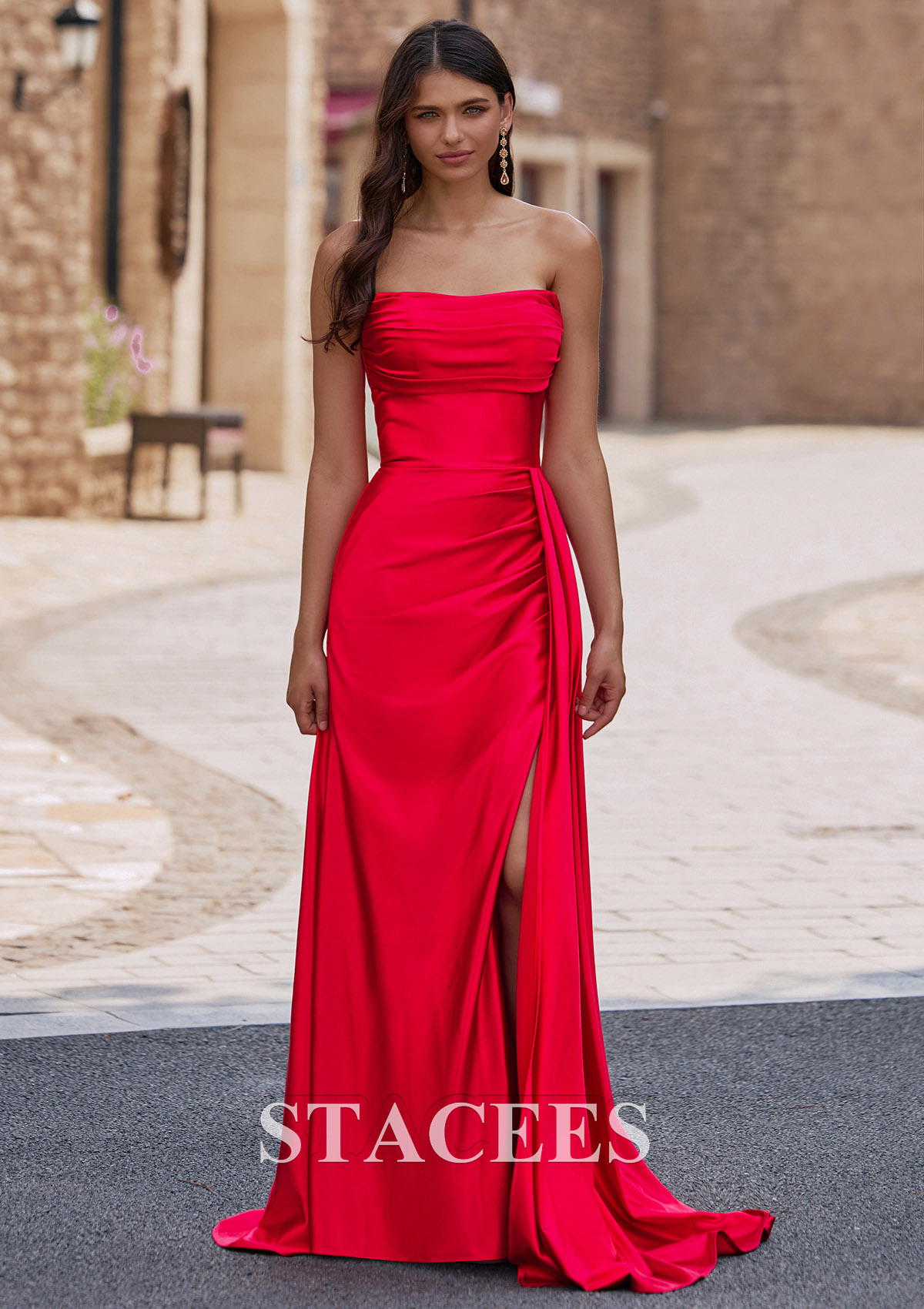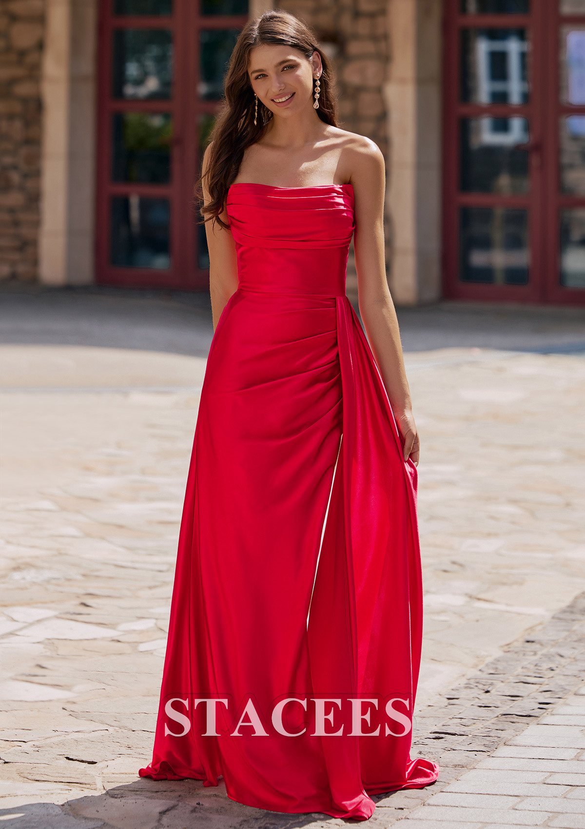 This beautiful strapless long prom dress is a gleaming style that showcases the curves. Crafted in shimmering stretch satin from the draped neckline to the floor, this strapless long formal dress is an eye-catching choice for prom, galas, and other black-tie events. This glamorous prom dress features a strapless sweetheart neckline, ruched bodice that beautifully accentuates the neckline and shoulders, and a flattering A-line silhouette that drapes beautifully to the floor. In misses and some plus sizes, this gorgeous gown has thin bands that lace up for the best fit over the open back, while the long skirt has tummy-camouflaging ruching and a thigh-high wide side slit that adds a look of allure. A unique draped side design adds a sophisticated touch, while the lace-up back provides a customizable fit. A small train finishes the design of this strapless long satin prom dress that is ready to own the spotlight at your very special celebration.