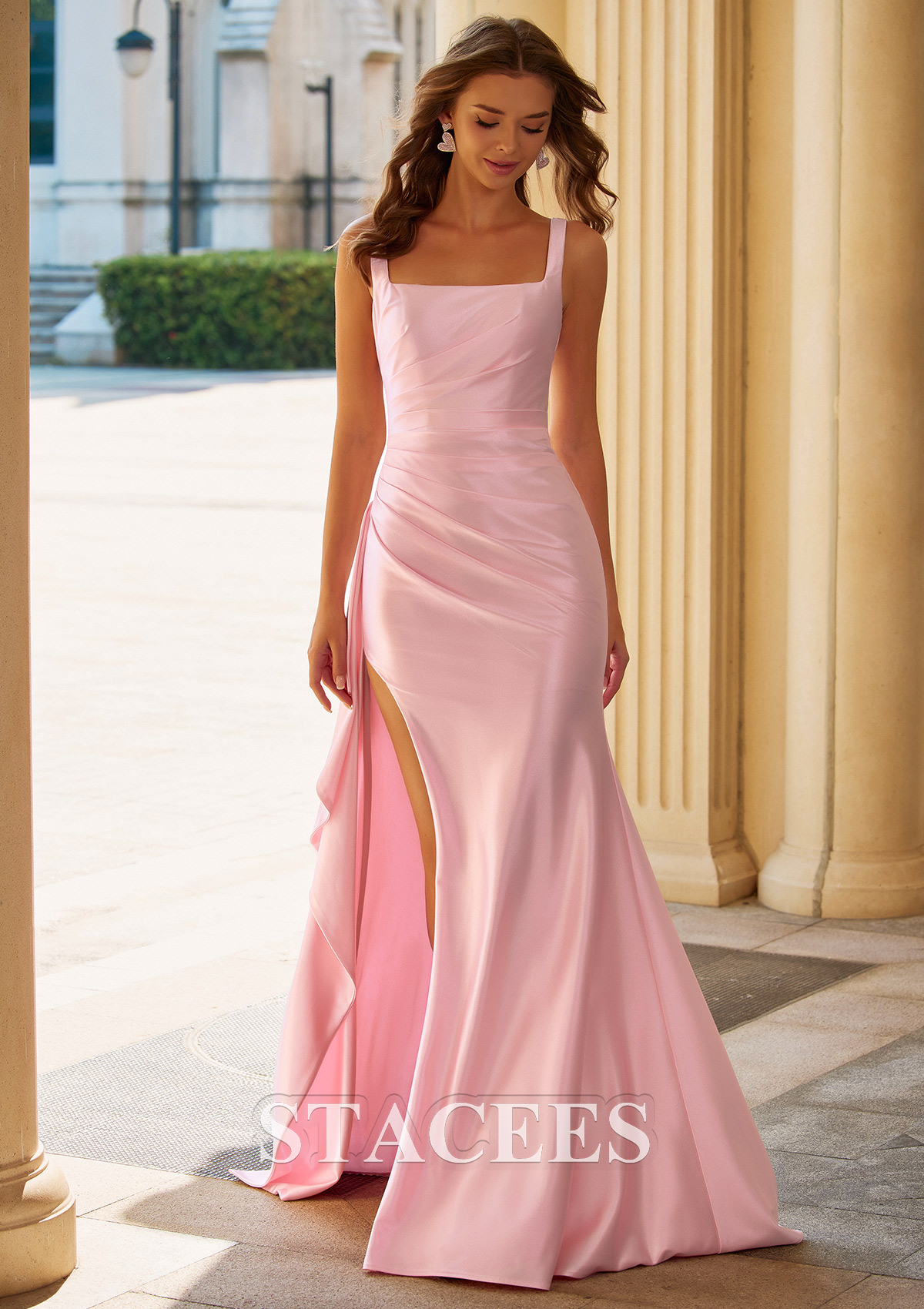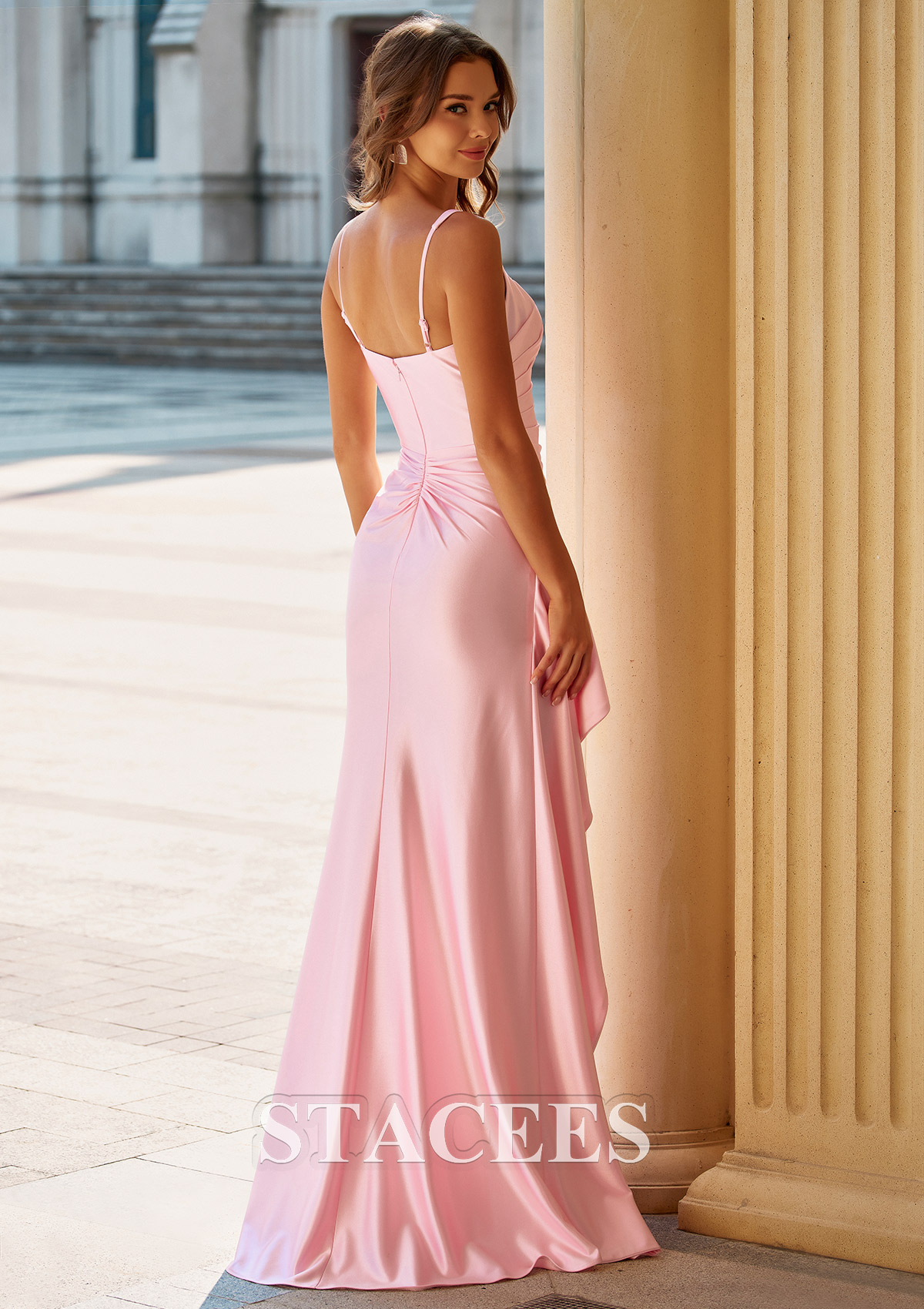 Make a lasting impression in this gorgeous silk-like satin prom dress, designed to blend sophistication with modern allure. Featuring a sleek square neckline and delicate spaghetti straps, this dress exudes both elegance and charm. The smooth silk-like satin fabric gracefully hugs your body, giving you a refined and polished look while offering a sheen. The flattering ruched waistline adds texture and emphasizes your curves, while the daring side slit provides just the right amount of allure without compromising elegance. The unique side ruffle detail brings a playful yet refined touch, flowing beautifully with your every step. Perfect for prom, galas, or any formal occasion, this dress offers a captivating balance of grace and style.