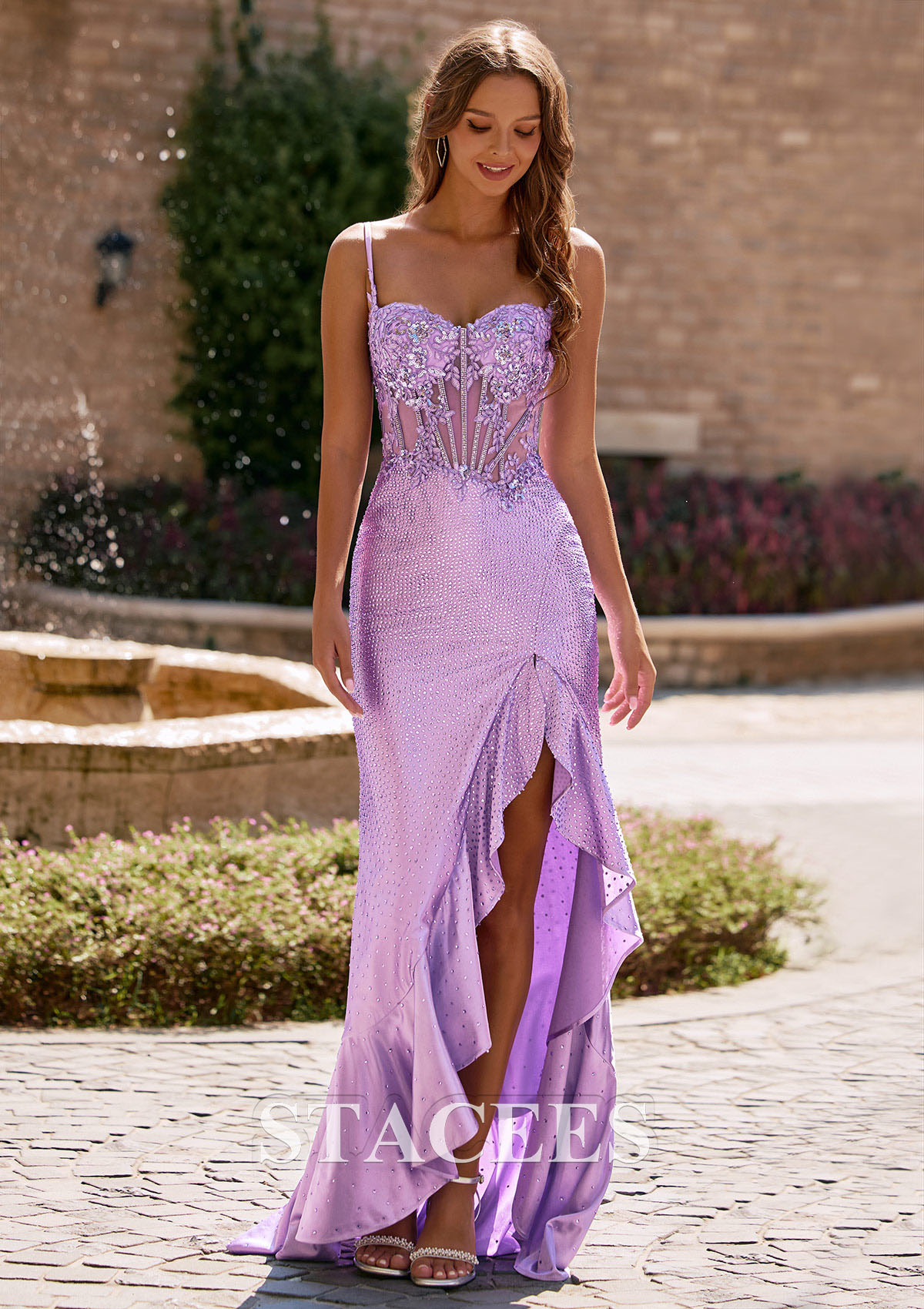 Step into elegance with this glamorous prom dress, perfect for prom or any upscale event. The dress showcases a fitted bodice with intricate floral embellishments and embroidery, accentuating the sweetheart neckline and feminine silhouette. Sheer paneling on the bodice adds a modern, delicate touch, while the shimmering fabric and sparkling details create a radiant, eye-catching effect. A dramatic high slit at the front of the skirt reveals a cascading ruffle overlay for additional flair and movement, ensuring you stand out with every step. The gown’s back features thin spaghetti straps and continues the floral embellishment, seamlessly transitioning into a softly flared, floor-length skirt. Ideal for outdoor formal occasions, this gown blends sophistication, romance, and contemporary style in one unforgettable look.