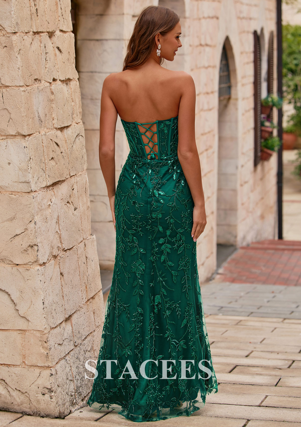 Step into elegance with this stunning prom dress, expertly crafted for formal events and prom nights. This shiny prom dress features intricate beaded floral embroidery detailed with sparkling sequin and lace appliques, give it a luxurious and refined look, adding a luxurious touch to the fitted silhouette. With the removable straps, its structured corset bodice accentuates the figure and transitions into delicate spaghetti straps or a chic strapless neckline, offering versatile styling options. The dramatic high slit at the front showcases your legs while ensuring comfort and ease of movement, making it perfect for dancing the night away. At the back, a lace-up corset design creates a custom fit and sophisticated detail. Ideal for prom, weddings, or galas, this floor-length emerald green dress combines classic sophistication with modern allure, ensuring you stand out at any special occasion.