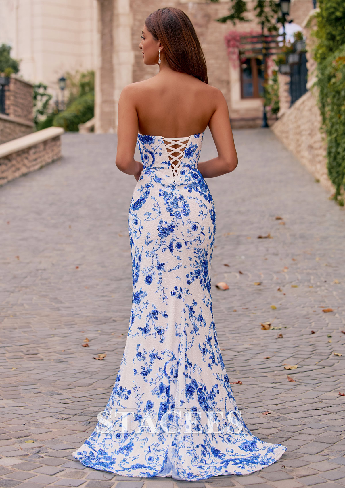 Make a stunning impression in the striking strapless gown, an exquisite fitted silhouette dress featuring a chic blue and white floral print over delicate lace fabric. The dress boasts intricate beading and sequins that add a captivating sparkle as you move. Designed with a classic scoop neckline and delicate spaghetti straps, it offers a timeless appeal. The flattering, form-fitting silhouette highlights your figure, while the high side slit adds drama and modern flair. The gown gracefully cascades to the floor, creating a sophisticated and polished look. At the back, a lace-up corset design ensures a secure and adjustable fit, adding a touch of romantic detail, ensuring you stand out from every angle. This fitted, long gown is the perfect blend of charm and glamour, ideal for prom night, pageants, or any formal evening event.