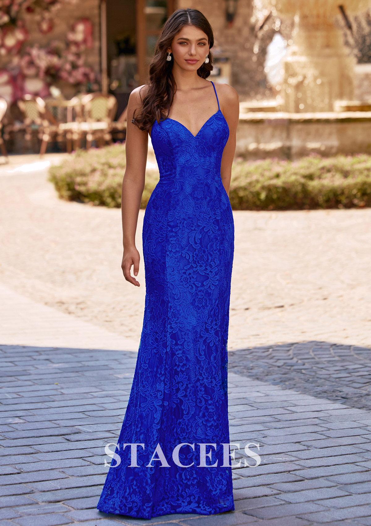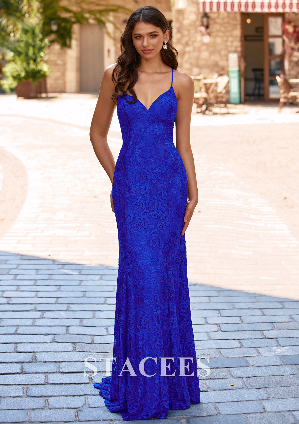 Elegance meets allure in this lace prom dress. Featuring a flattering V-neckline and delicate spaghetti straps, this gown hugs your curves with its intricate lace fabric, creating a sophisticated and timeless look. The lace-up back ensures a perfect, customized fit while adding a chic detail to the design. The floor-length skirt flows gracefully, enhancing your figure for an unforgettable entrance at prom, galas, or any formal event. With its beautiful blue hue and detailed lace, this dress is the perfect blend of classic beauty and modern style.