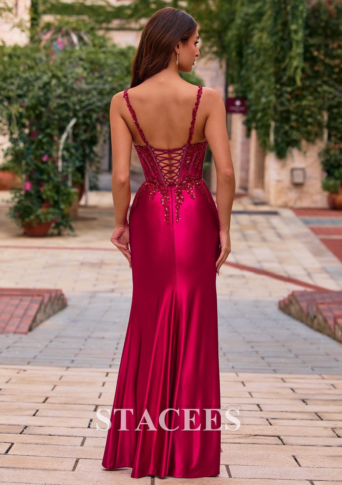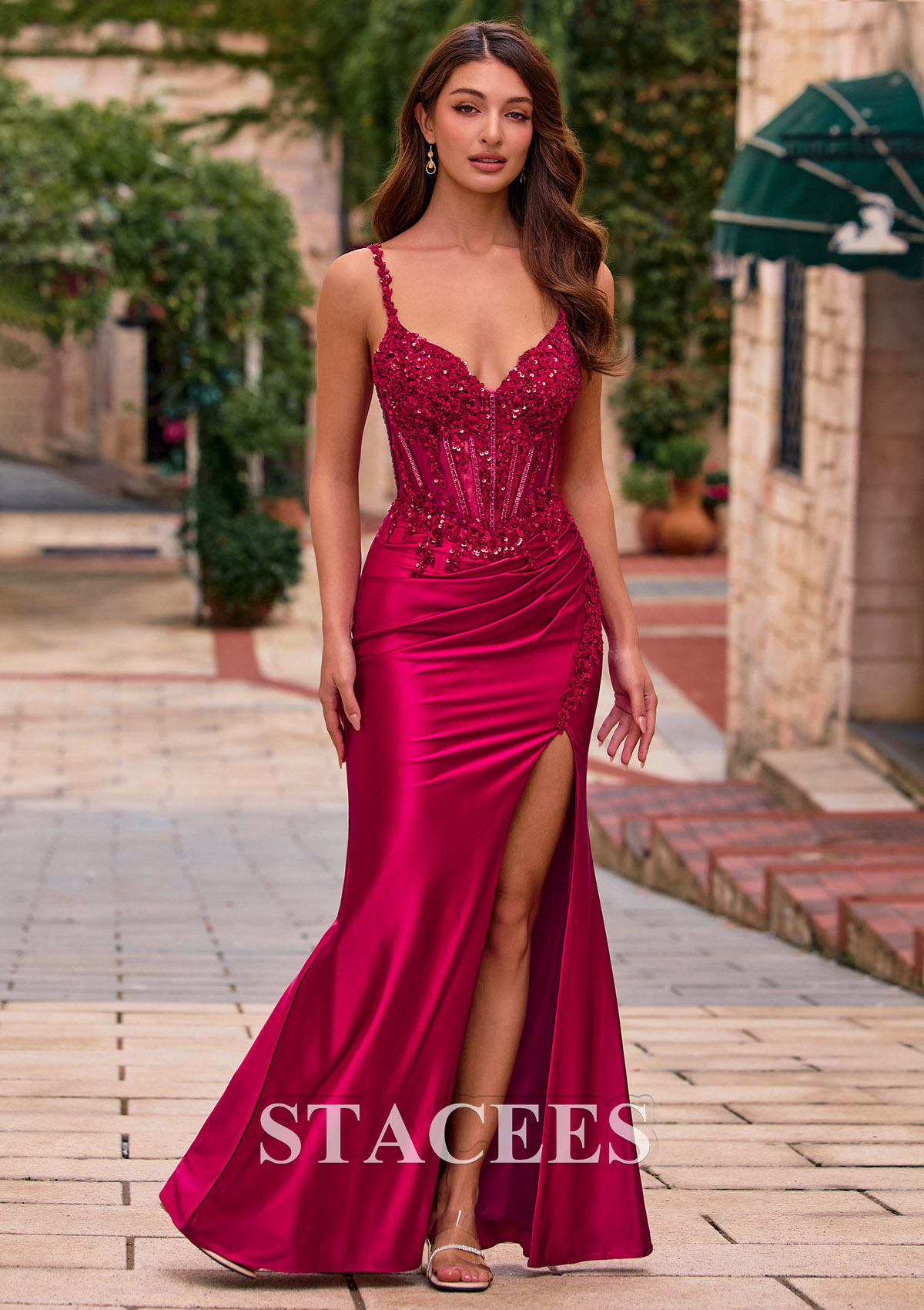 From Stacees, this fabulous fiited long prom dress S8969P is simply spectacular. Make an unforgettable entrance in this stunning sheath silk-like satin prom dress, designed to hug your curves and shimmer from every angle. The fitted corset bodice is richly embellished with sparkling beads and sequins, sculpting your waist and creating a glamorous hourglass silhouette. Delicate spaghetti straps and a flattering v neckline highlight your shoulders and decolletage for a romantic, red-carpet look. The smooth fabric skirt drapes beautifully over the hips with soft ruching that enhances your shape and adds elegant texture. A daring thigh-high slit shows off your legs and heels, making every step feel runway-ready. The lace-up corset back not only looks striking, but also allows you to customize the fit for all-night comfort and support. Finished in a floor-length fitted-style hem, this prom gown is perfect for prom, formal dances, galas, and evening parties. Pair it with strappy heels and crystal jewelry to complete your glamorous prom dress look. Shine confidently in this luxurious and eye-catching design.