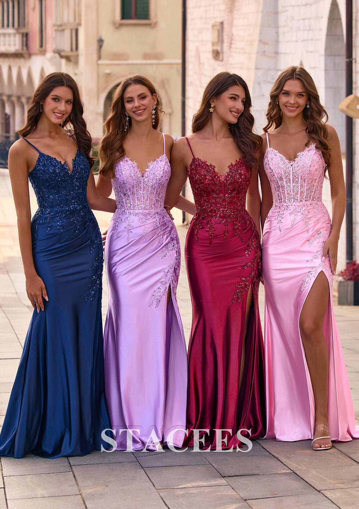 Step into the spotlight with these glamorous satin embroidered prom dresses by Stacees, available in striking shades of navy blue, lilac, wine red, and blush pink. These dresses are designed to be elegant yet subtly sexy, featuring a figure-flattering sheath silhouette with a fitted skirt that opens into a dramatic thigh-high slit, often with a sweep train. With built-in structure for a supportive fit, the bodice of each gown is a key highlight, designed with a sheer, delicate floral lace applique, boned corset style that offers a perfect fit and a touch of vintage charm, complemented by delicate lace appliques, often sparkling sequins and beads. They typically feature slender spaghetti straps for a modern feminine silhouette. From the back, these dresses impress with intricate lace-up closures that enhance both fit and visual appeal, paired with subtle ruched detailing along the waist for a sculpted look. The floor-length satin skirts flow gracefully, ideal for prom, formal galas, and special evening occasions. Available in a variety of colors, in Size 0 - Size 30, plus size and custom made Available, these gowns are crafted from silk-like satin fabric to create a luxurious and eye-catching look. Make your prom night unforgettable in these prom dresses.