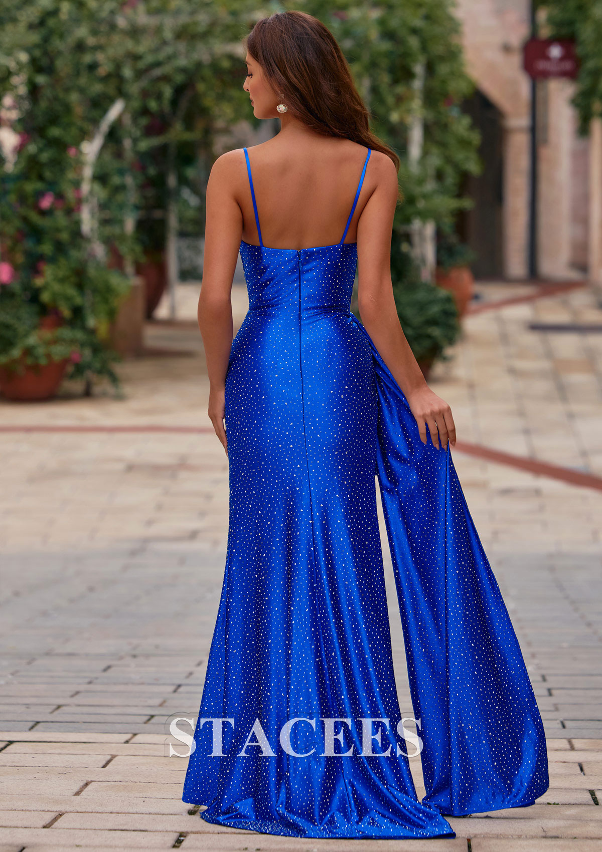 Turn heads at your prom with this glamorous prom dress. Crafted from luxurious, shimmering silk-like satin adorned with delicate sparkly hot stone embellishments, this gown dazzles from every angle. The figure-flattering silhouette features a ruched bodice with elegant spaghetti straps and a chic cowl neckline. The side slit adds a modern, sultry touch, while the graceful floor-length skirt flows beautifully with every step. A flowing side drape detail at the waist enhances curves and adds a dramatic flair, making this gown perfect for prom, evening parties, or any special occasion where you want to shine. This dress is an ideal choice for anyone looking to combine classic elegance with a contemporary, show-stopping design.