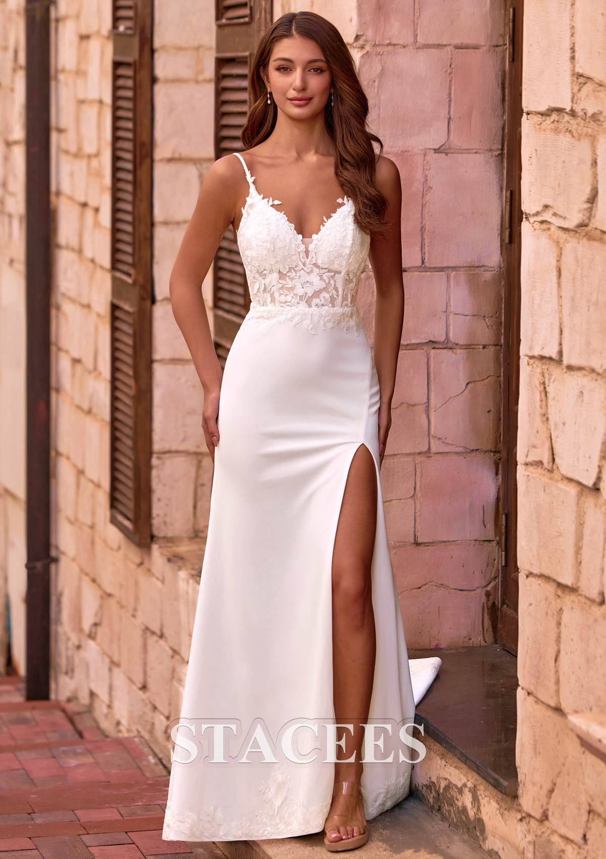 This sophisticated wedding dress combines romantic lace detail with a modern, body‑skimming silhouette for an unforgettable formal look. The fitted bodice features floral lace appliqué over an illusion mesh corset that sculpts the waist while adding delicate texture and feminine detail. The back features a low open back with delicate lace accents and adjustable spaghetti straps, creating a stunning view from every angle. The flowing mermaid-style skirt extends downwards from the waist and then gracefully drapes down into a train. High side slit for graceful movement and runway‑ready drama. This gown pairs effortlessly with minimalist jewelry and strappy heels to complete a refined, contemporary statement.