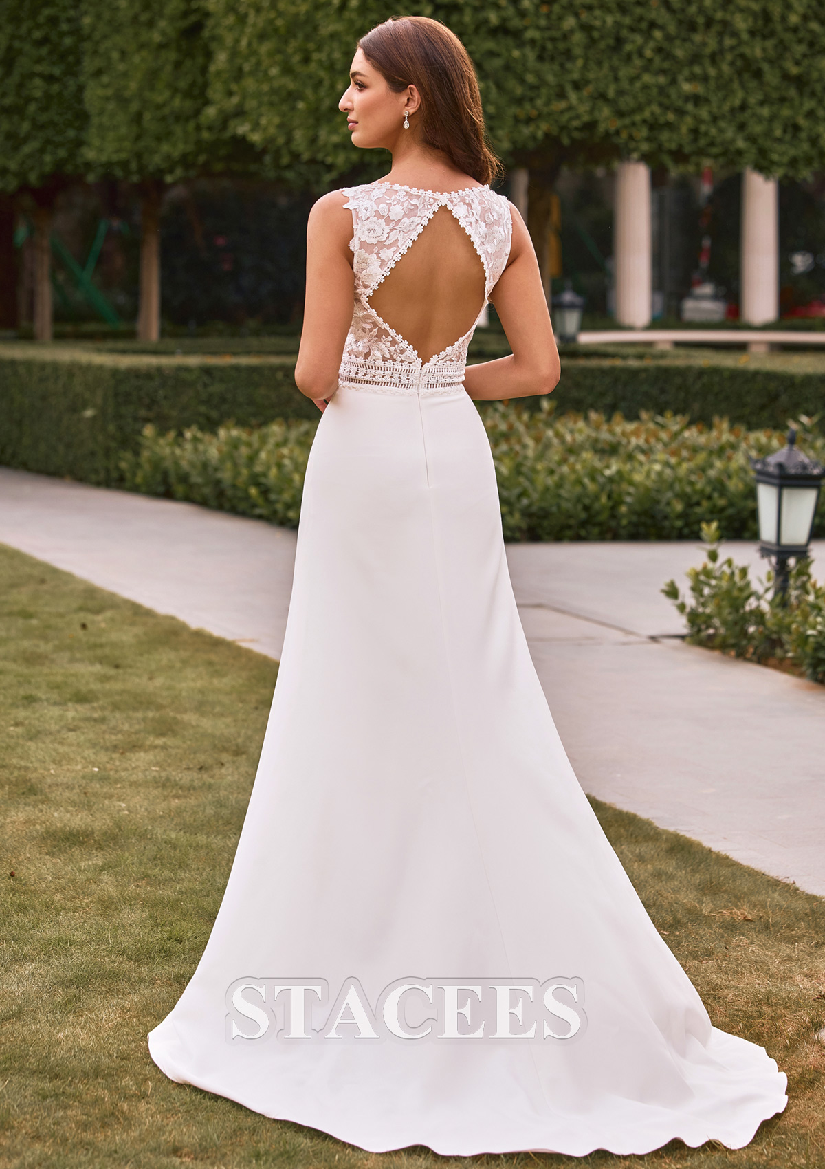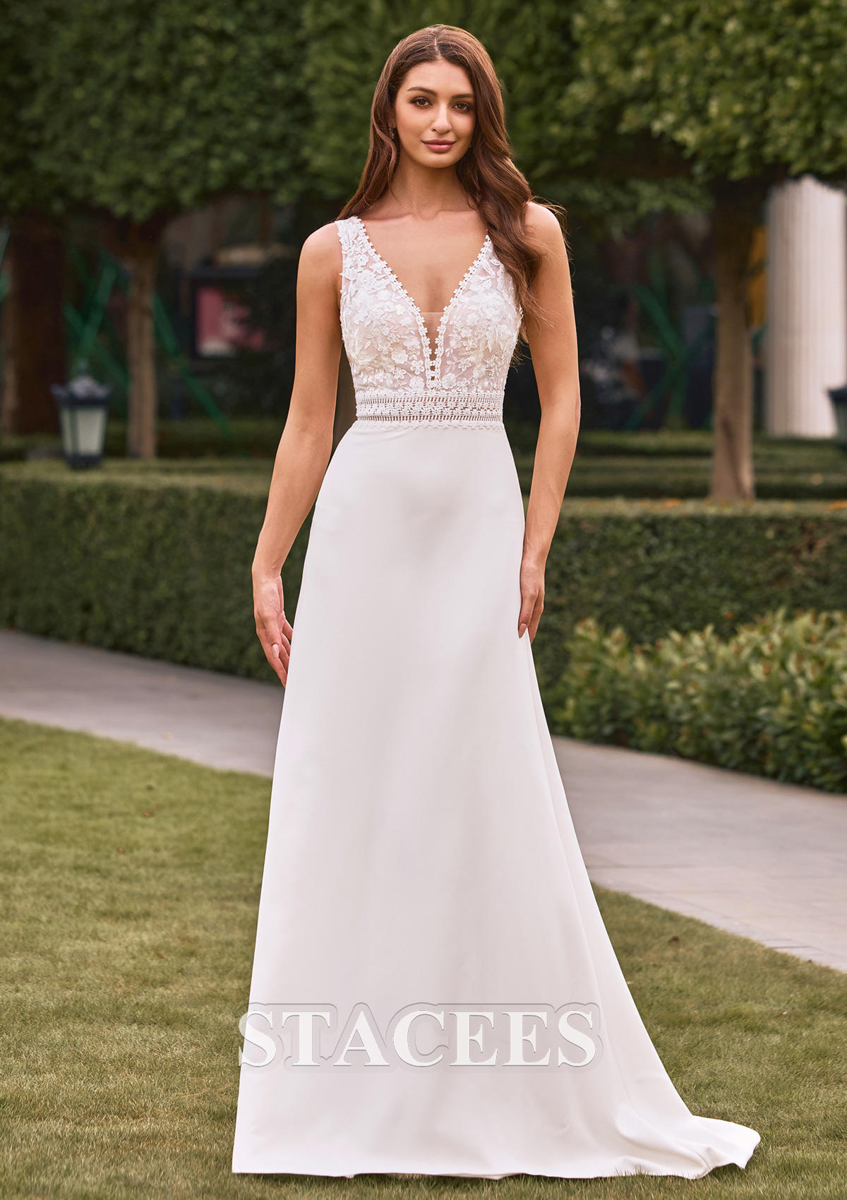 Inspired by modern elegance, this sheath wedding dress features a delicate lace bodice adorned with intricate lace , creating a soft and romantic bridal look. The charming V-neckline gracefully frames the neckline, highlighting the bride’s natural silhouette while maintaining a clean and refined appearance. An elegant keyhole back design adds a touch of sophistication and visual interest. Flowing naturally from the waist, the skirt drapes smoothly to elongate the figure while offering a lightweight and comfortable wearing experience. A soft train completes the look, adding a subtle yet graceful touch of romance. The perfect balance of minimalist design and delicate lace details makes this wedding dress an ideal choice for brides who appreciate refined elegance and timeless beauty.