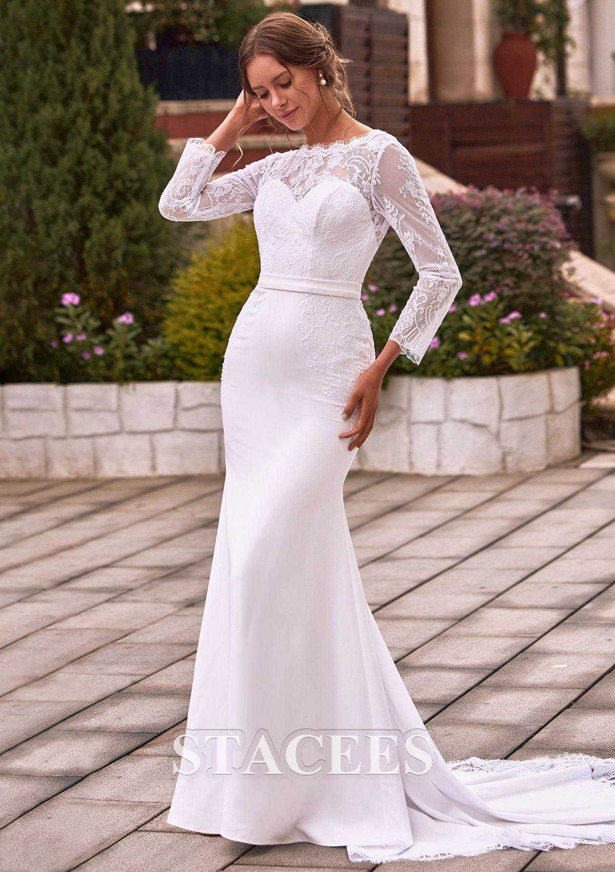 Make a breathtaking entrance in this stunning mermaid wedding dress, designed to celebrate your curves and captivate every eye. The bodice of this wedding dress features sheer, refined lace long sleeves and a bateau neckline, providing elegant coverage while highlighting the intricate floral embroidery. And a sultry deep V-back is framed by delicate scalloped lace, leading down to a classic row of buttons for a touch of vintage couture. Meticulously tailored to create a captivating mermaid fit that perfectly hugs the curves of the hips and thighs, this bridal gown flares into a soft, flowing skirt that creates a tall and slender silhouette. The perfect look is completed with a magnificent court train, adorned with an exquisite lace hem that leaves a lasting impression as you walk down the aisle. Ideal for brides searching for long lace sleeve wedding dresses, open back mermaid bridal gowns, vintage lace-trimmed train bridal dresses, or elegant fitted wedding dresses, this perfect wedding dress offers sophistication, romance, and unforgettable beauty for your special day.