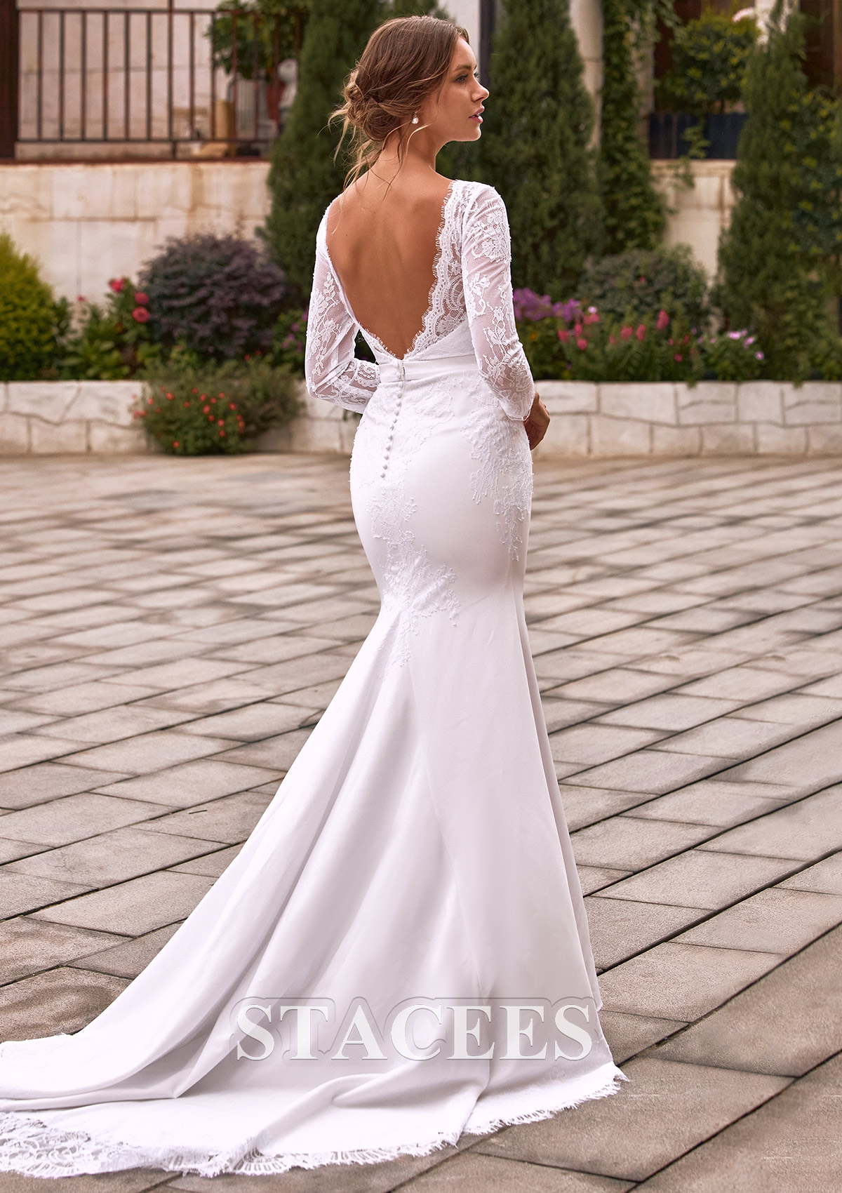 Breathtaking Mermaid Deep V Back Wedding Dress with Lace-trimmed Court Train with Sashes S3209W - Wedding Dresses - Stacees
