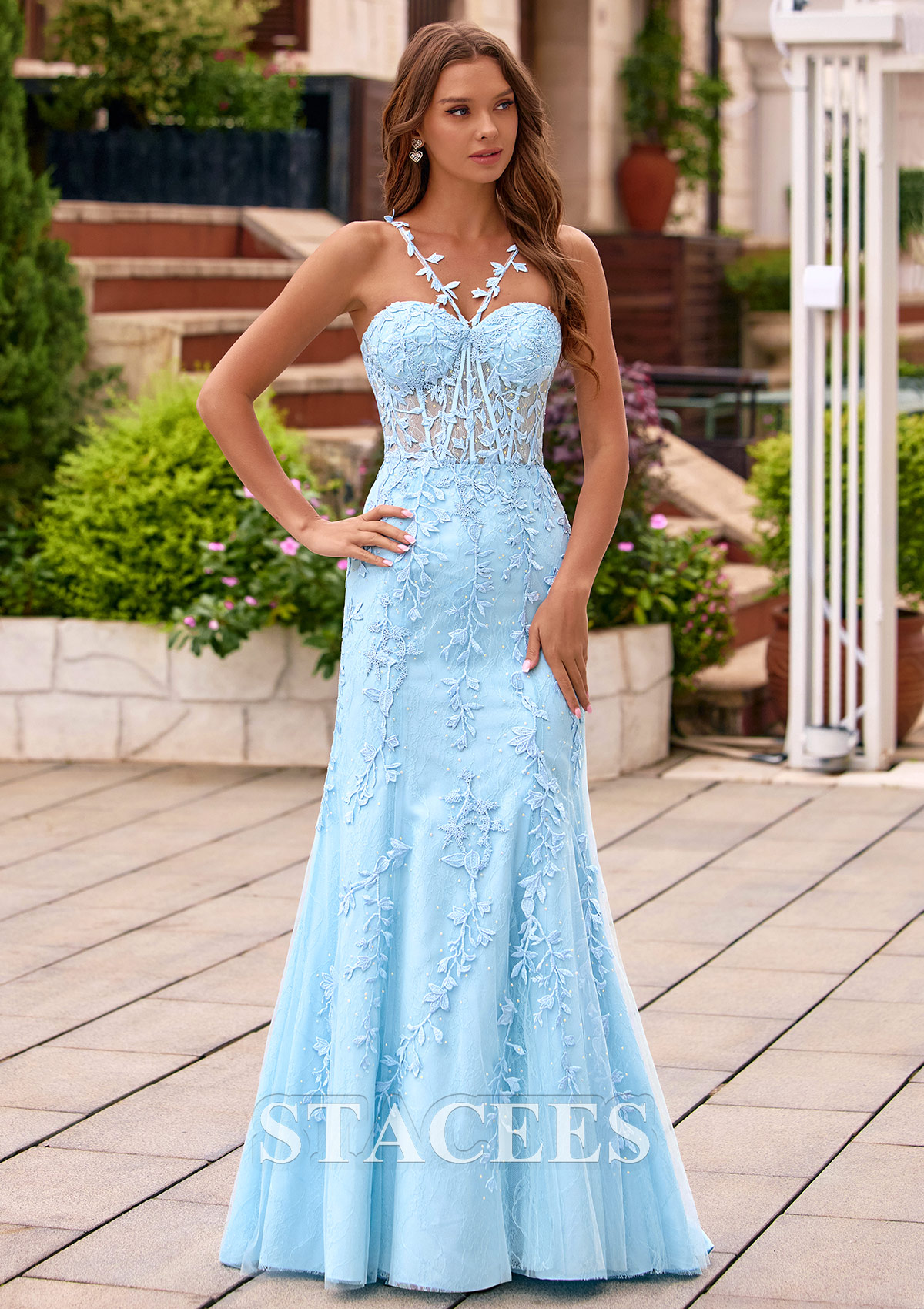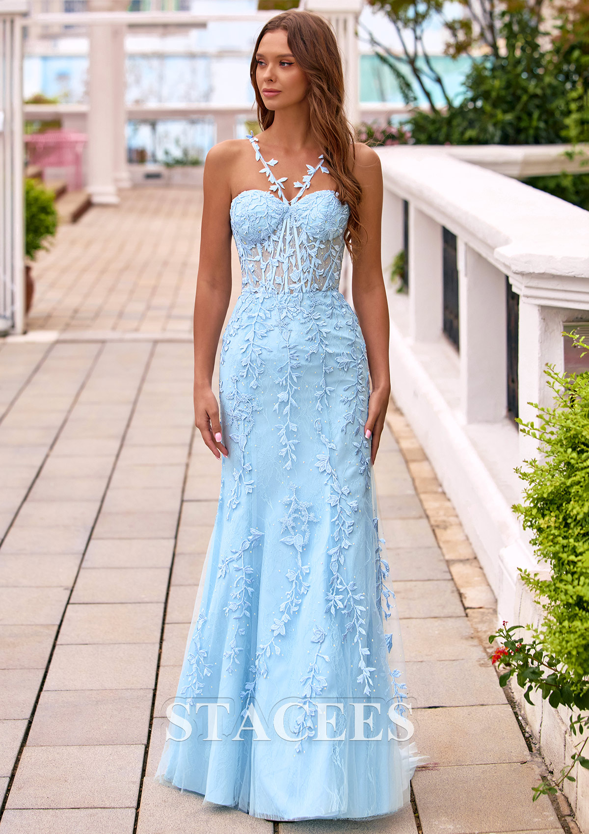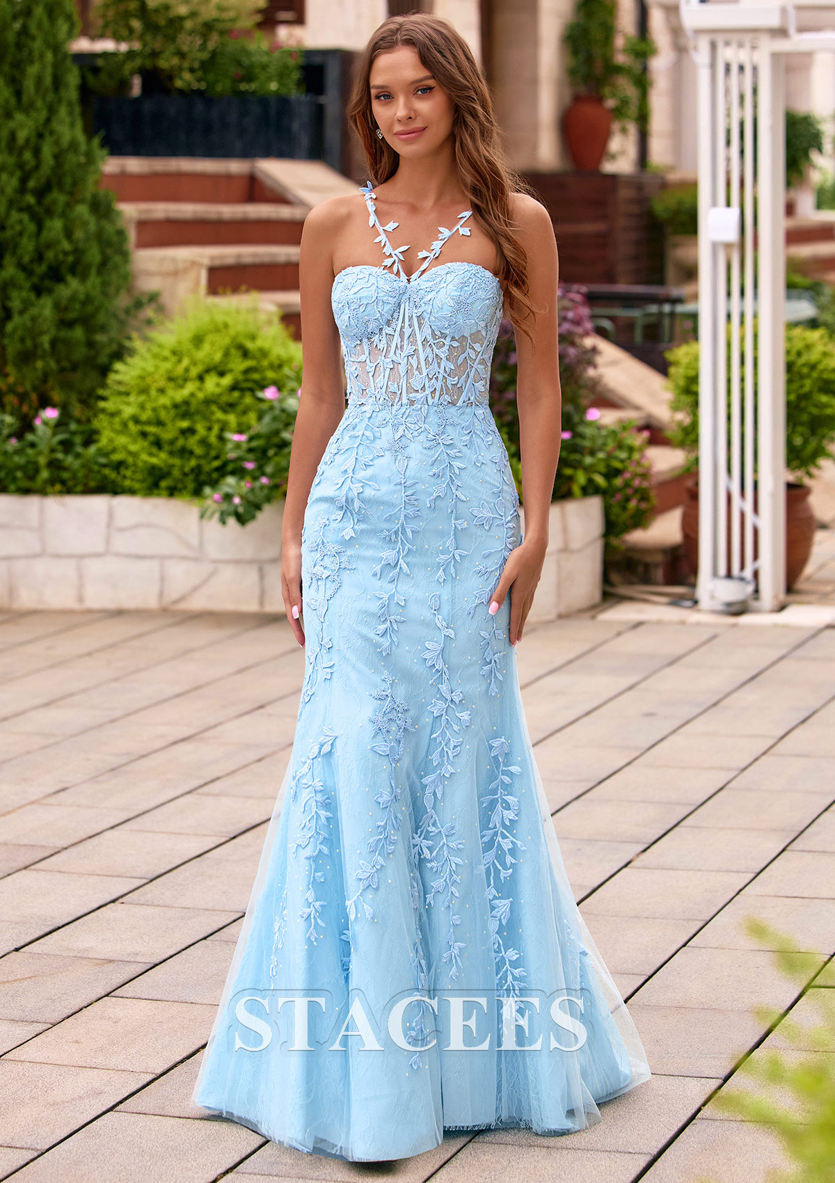 Elevate your presence at any formal event with this stunning mermaid gown, a popular style from Stacees. Capture the spotlight in this breathtaking mermaid prom dress, designed for effortless elegance and modern romance. This floor-length gown features intricate beaded floral and leaf-style lace appliques that artfully cascades down the figure-flattering silhouette from the bodice to the hem, offering a natural and elegant beauty. The trendy sheer, boned corset bodice is accented with unique, romantic leaf-applique straps that cross at the neckline and continue over the shoulders, creating a contemporary, eye-catching look. The fitted silhouette hugs your curves before flowing into a graceful mermaid skirt adorned with matching floral embroidery, adding texture and sophistication from top to bottom. The back features dainty, adjustable straps and sheer detailing that enhances the gown dreamy, modern aesthetic.The soft tulle overlay adds a dreamy, ethereal quality to the gown, while the subtle mermaid shape highlights your curves and allows for easy movement. This elegant gown is crafted from a combination of delicate lace and soft tulle fabric, making it a perfect choice for prom, a gala, or any special evening occasion.