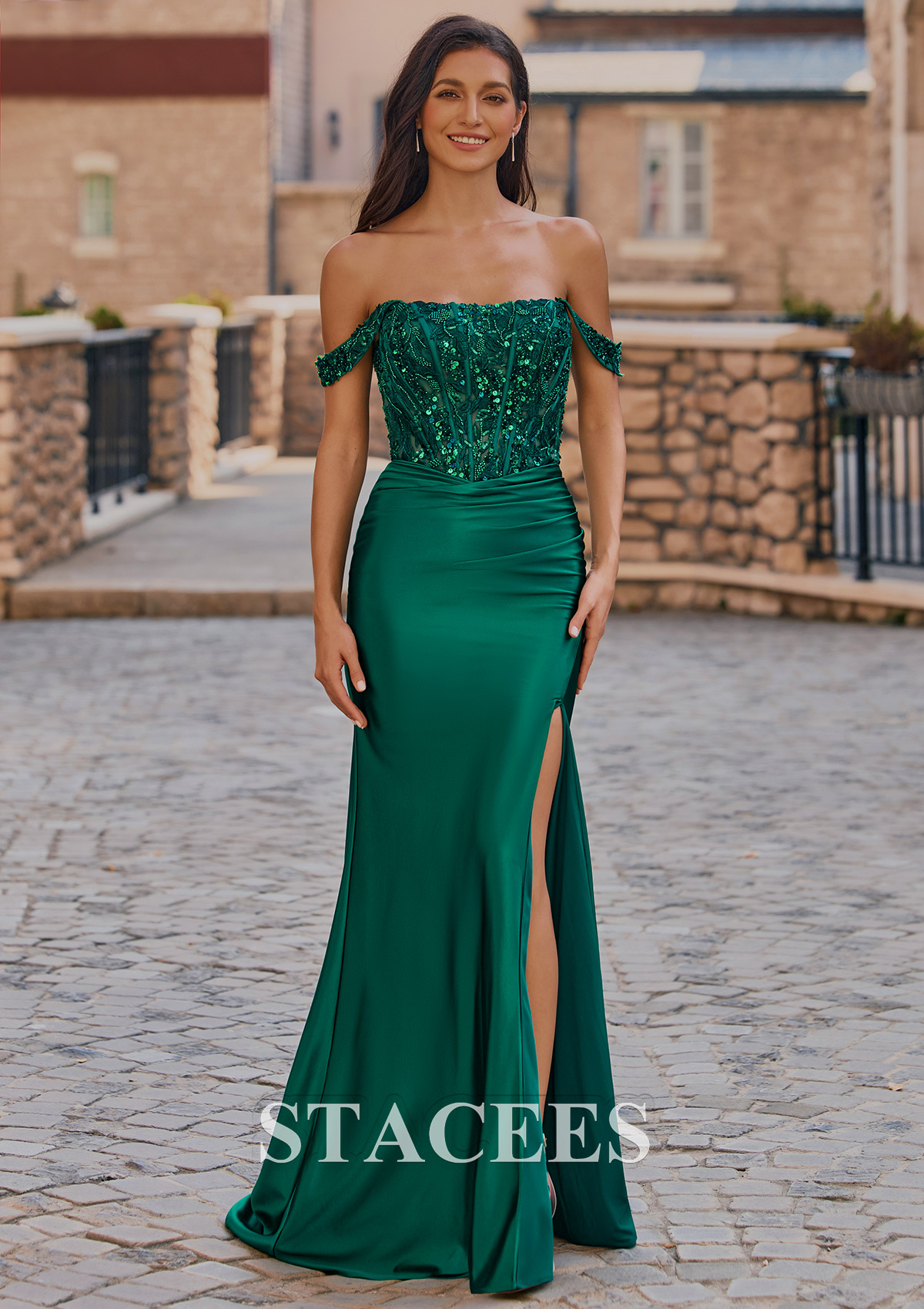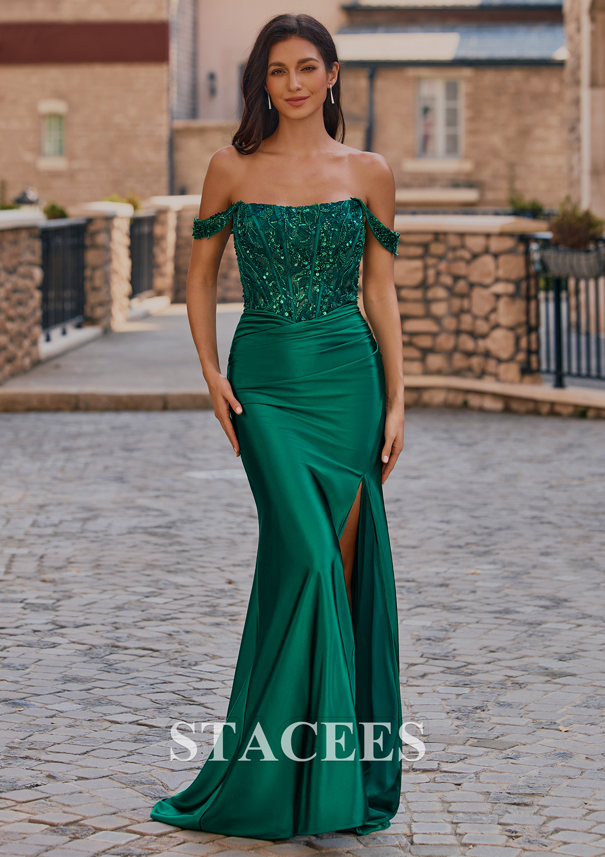 Make a dazzling entrance in this stunning prom dress, designed to turn heads from every angle. The off-the-shoulder neckline features delicate beaded straps and a beautifully embellished corset bodice that adds a touch of glamour and sophistication. Crafted from luxurious satin-like fabric, the dress hugs your figure gracefully before flowing into a sleek mermaid silhouette with a tasteful thigh-high slit. The back showcases a lace-up or zip closure for a perfect fit, while the smooth train adds a dramatic finish. Perfect for prom, formal galas, or evening events where you want to shine with timeless elegance.