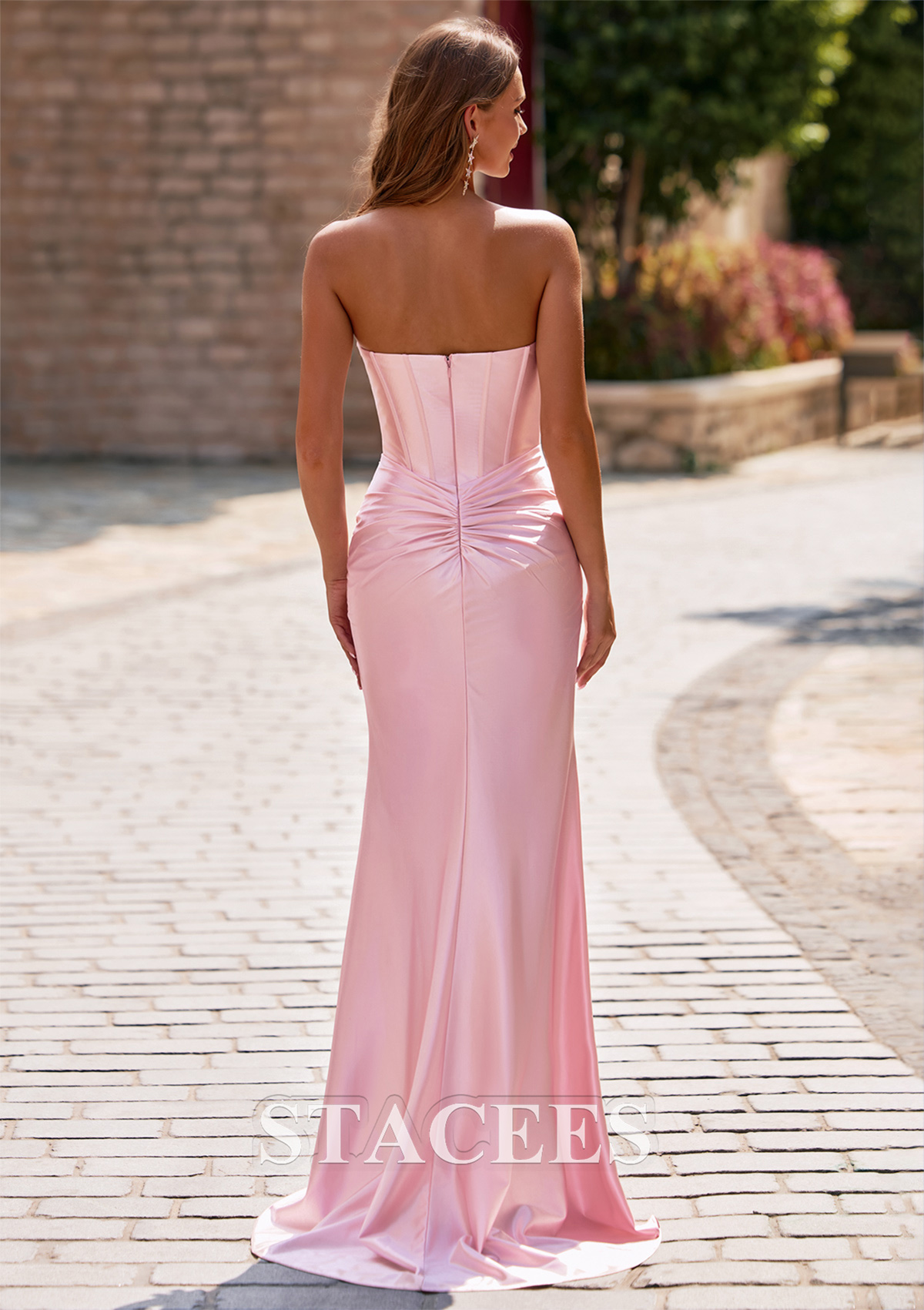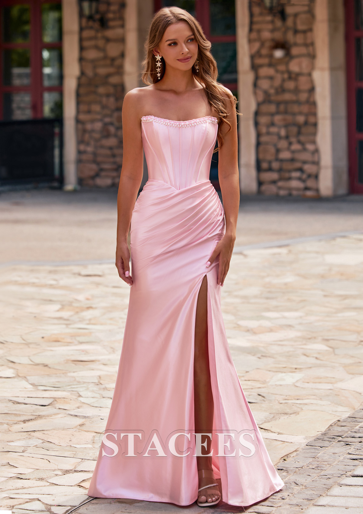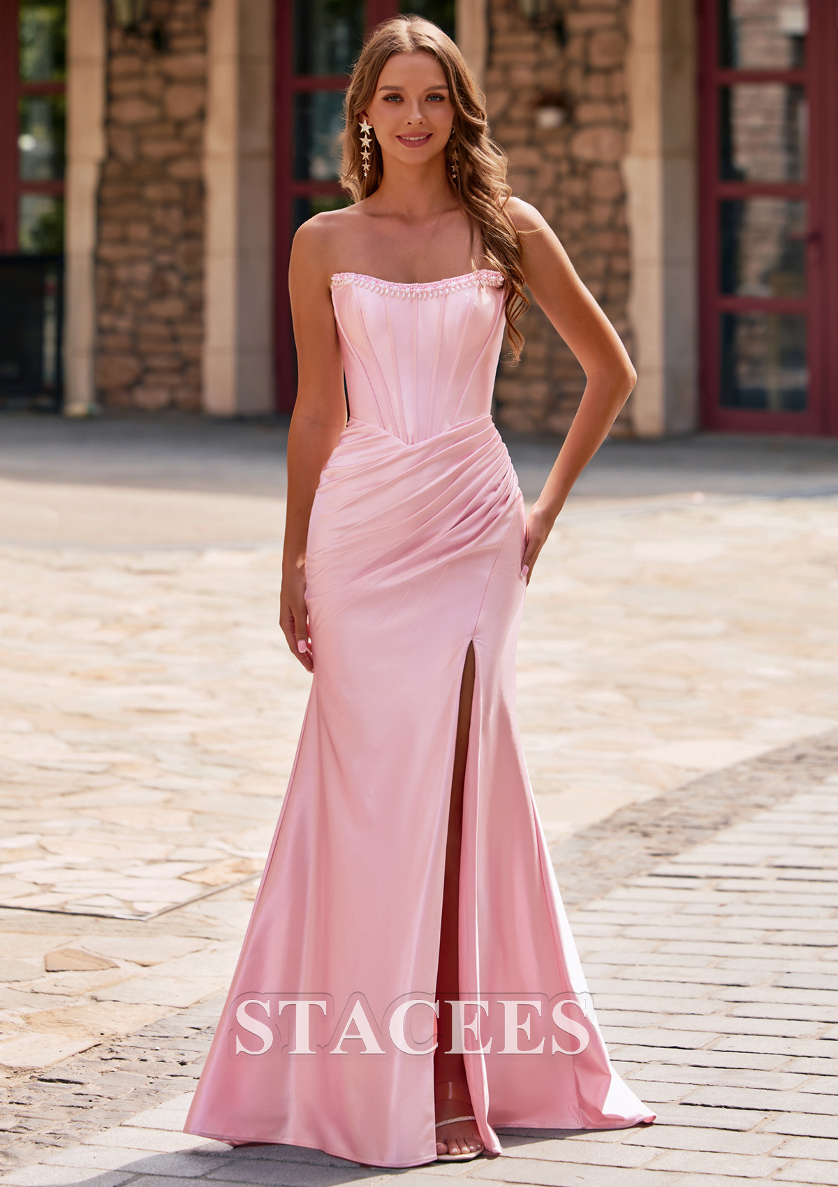 This sophisticated silk like satin prom dress features a strapless, sweetheart neckline with a delicately detailed top edge and vertical paneling for a structured, flattering fit. The bodice hugs the figure before flowing into a smooth, fitted skirt, which is artfully ruched at the hips to enhance your curves. The stunning strapless corset bodice is adorned with a single row of pearls and beads that beautifully embellish the neckline. A bold thigh-high slit on the left side adds allure and allows for ease of movement. From the back, the dress reveals a sleek, strapless style with a zipper closure and gathered fabric at the waist. Designed to captivate, this gown ensures you will exude an air of sophistication at any gala, formal, or prom.
