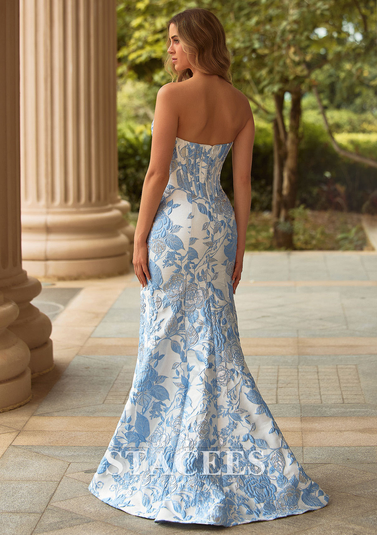 Own the night in this luxe floral brocade mermaid prom dress, designed to sculpt your figure and shimmer from every angle. The strapless sweetheart neckline highlights your decollete, while the structured, boned corset bodice cinches the waist and creates a flattering hourglass shape. A delicate blue‑on‑ivory floral brocade pattern adds rich texture and a romantic, high‑end look. The prom gown hugs your curves through the hips before gently flaring into a mermaid skirt, creating a long, lean silhouette. A chic front slit adds movement and a touch of drama, making it easy to walk and dance while showing off your heels. From the back, the sleek, fitted design continues with visible corset seaming that accentuates your waist and offers a smooth, tailored finish. Perfect for prom, formal events, galas, and evening parties, this strapless floral prom dress blends classic elegance with modern, runway-inspired details. Just add statement earrings and strappy heels for a polished, red‑carpet‑ready look.