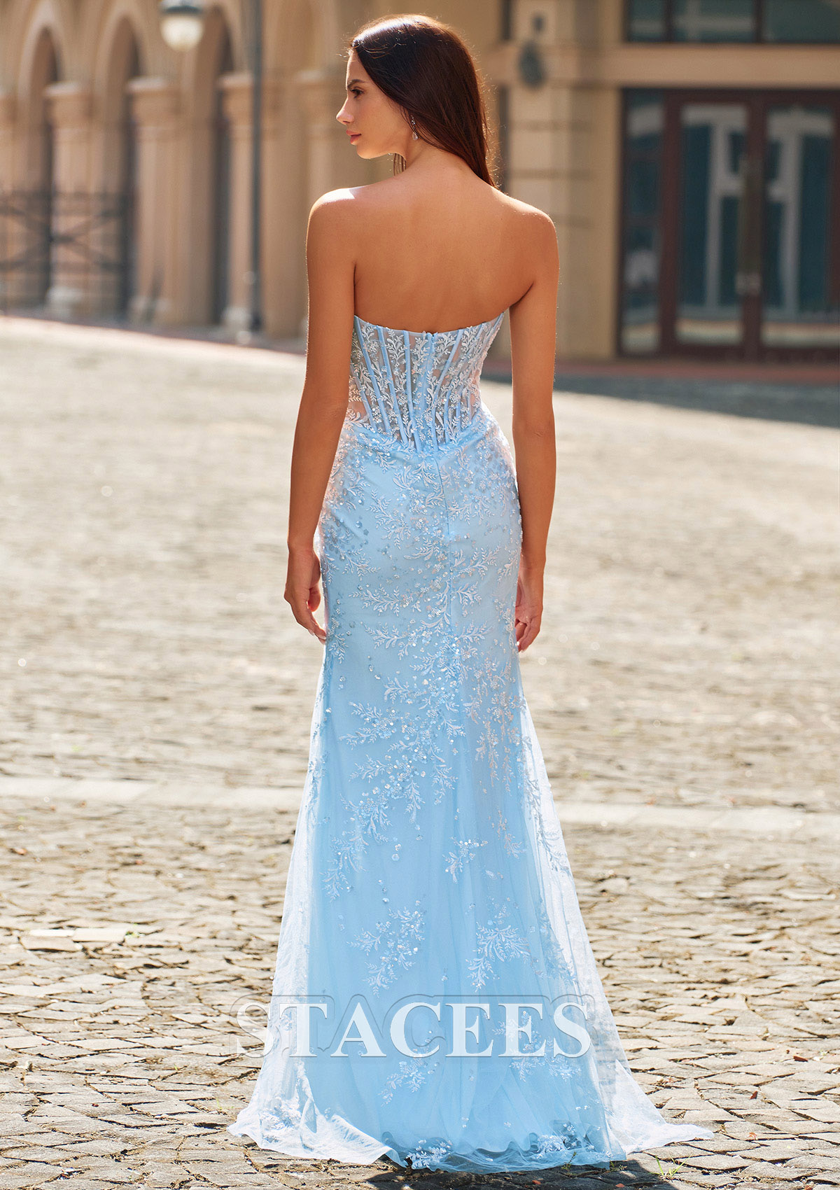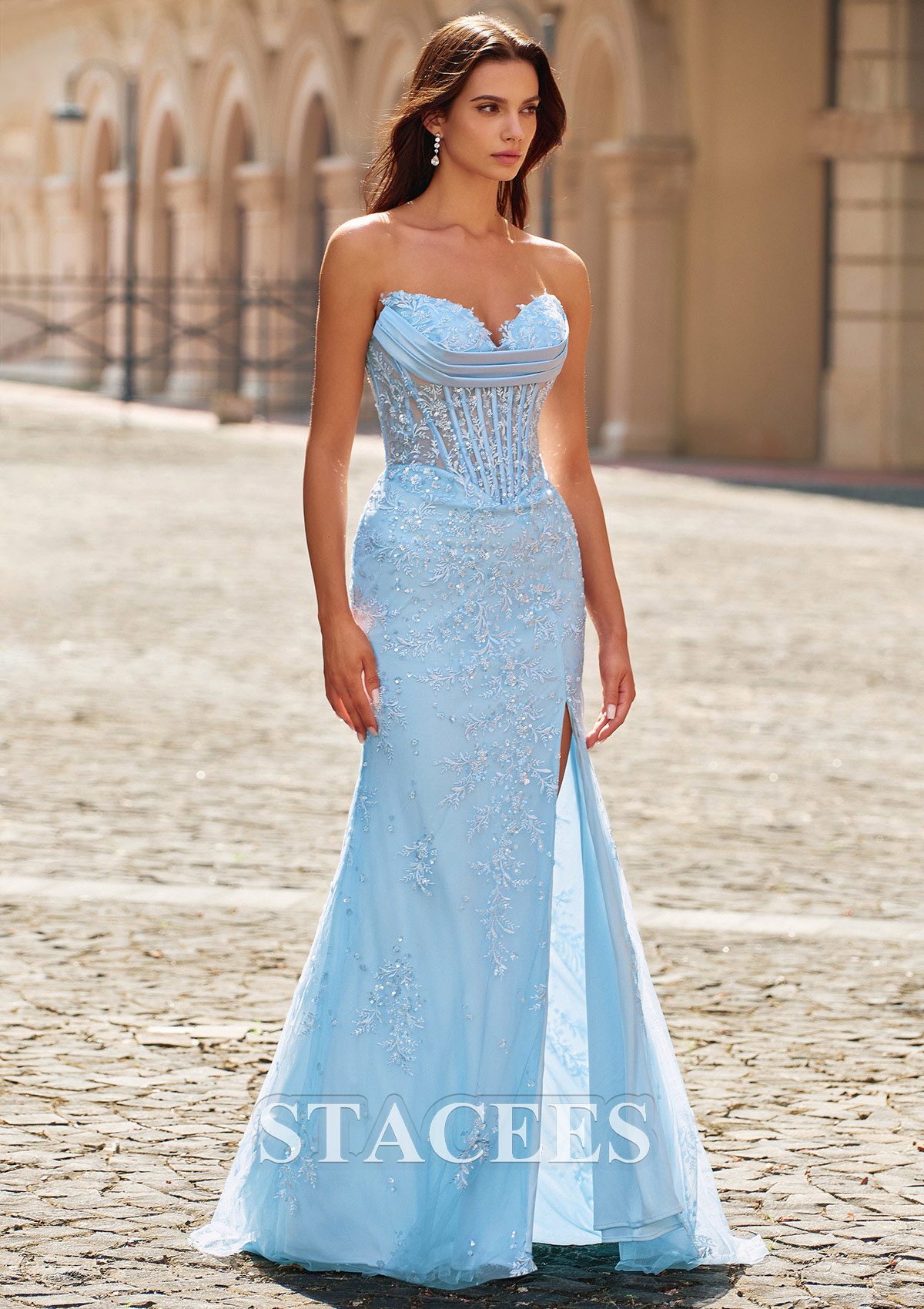 Shine on prom night in this dreamy prom dress featuring a structured, sheer corset bodice and romantic sweetheart neckline, detailed with ruched silk like satin. Delicate floral embroidery and shimmering beadwork trail from the bodice down the fitted skirt, creating an elegant, figure-flattering silhouette. A thigh-high front slit adds a modern, sultry touch while still keeping the full-length skirt soft and graceful. The back showcases the same visible boning detail and allover embroidered tulle, finished with a subtle sweep train that moves beautifully as you walk. Perfect as a corset prom dress, formal evening gown, or pageant dress, this style pairs effortlessly with strappy heels and sparkling jewelry for a princess-worthy look.