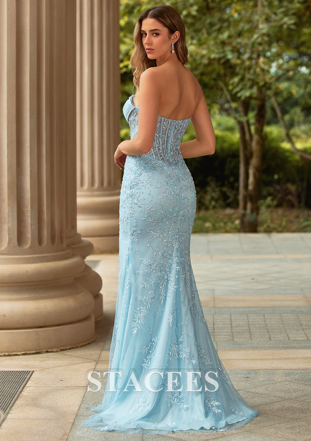 Make an entrance in this strapless corset prom dress that blends delicate romance with runway glamour. The sweetheart neckline with softly pleated satin draped bust detail flatters the decollete, while the sheer boned corset bodice sculpts your waist and creates a flawless hourglass silhouette. Intricate floral embroidery and shimmering beadwork cascade down the bodice and skirt, catching the light for a soft, icy sparkle. The fitted skirt skims your curves before falling into a graceful floor-length hem with a subtle train for a truly elegant finish. A thigh-high front slit adds just the right amount of drama, showing off your legs and heels while keeping the overall look sophisticated. Perfect for prom, formal dances, pageants, or evening galas, this embroidered corset gown is ideal for anyone searching for a sparkly strapless prom dress that looks stunning from every angle. Style this floral beaded prom dress with silver or crystal jewelry, strappy heels, and soft waves for a dreamy, fairytale-inspired look.