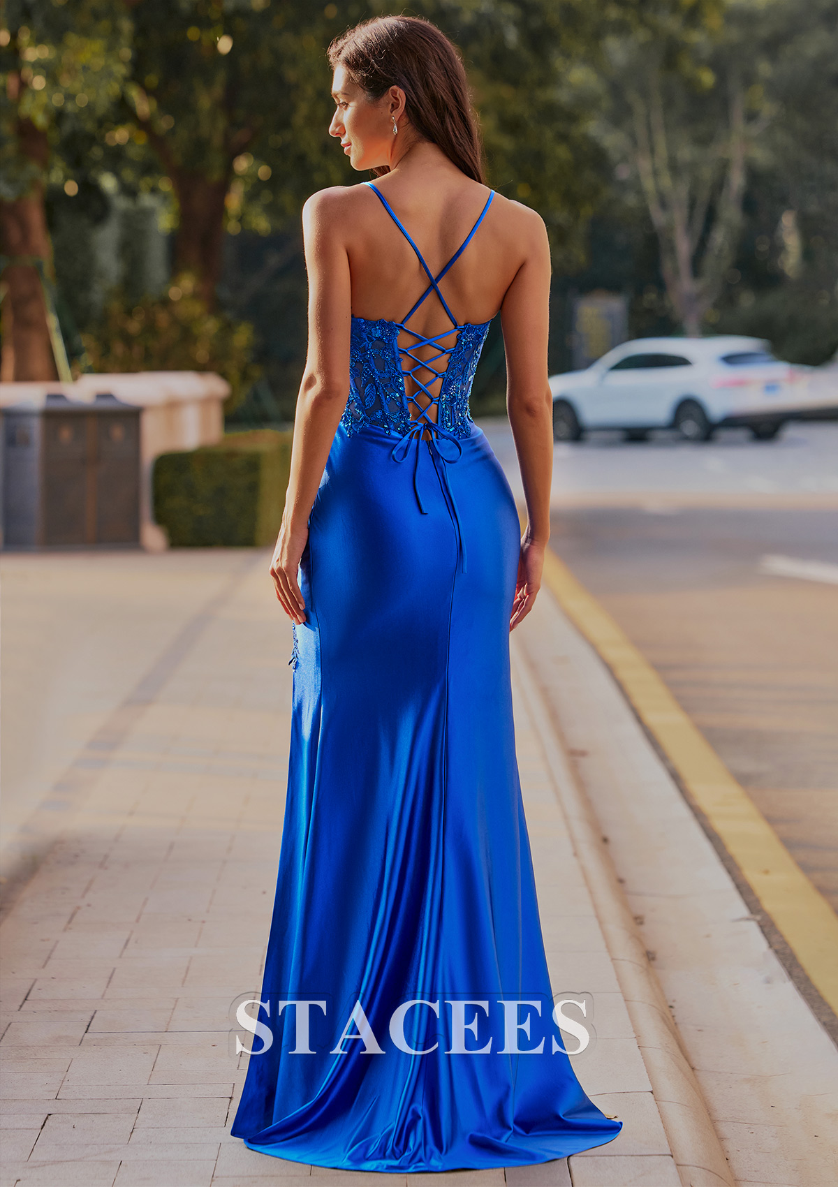 A form-fitting silhouette, this glamorous prom dress is designed to captivate at any formal event. The front features a fitted bodice decorated with intricate blue embellishments and beadwork, creating a dazzling, textured effect. The bodice has a flattering V-neckline and delicate spaghetti straps that enhance the shoulders and neckline, while the softly ruched waistline creates a smooth and elegant silhouette. The skirt flows gracefully to the floor with a high side slit, embellished at the opening for added sparkle and allure. From the back, the gown reveals a dramatic open design with crisscrossed straps and a lace-up corset detail, ensuring a perfect, adjustable fit while adding to the dress modern appeal. The skirt drapes beautifully to form a gentle train, completing the look with effortless sophistication. This dress is ideal for proms, galas, and red carpet events, offering a blend of classic elegance and contemporary glamour.